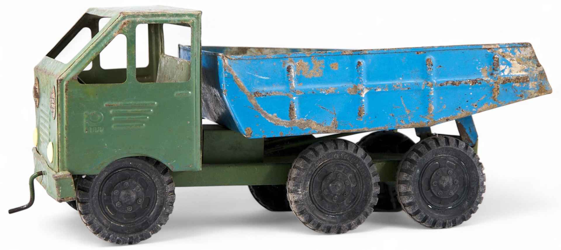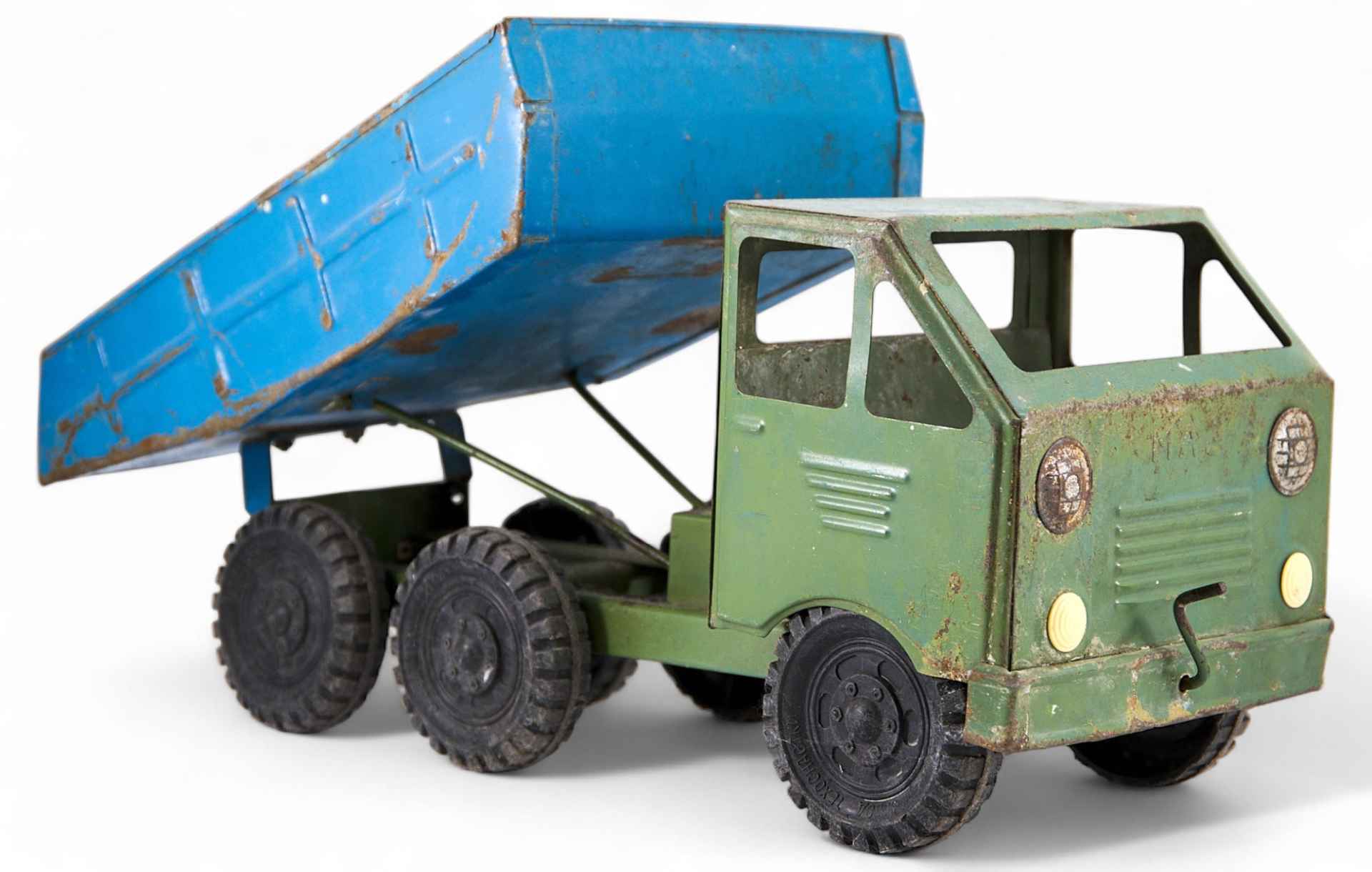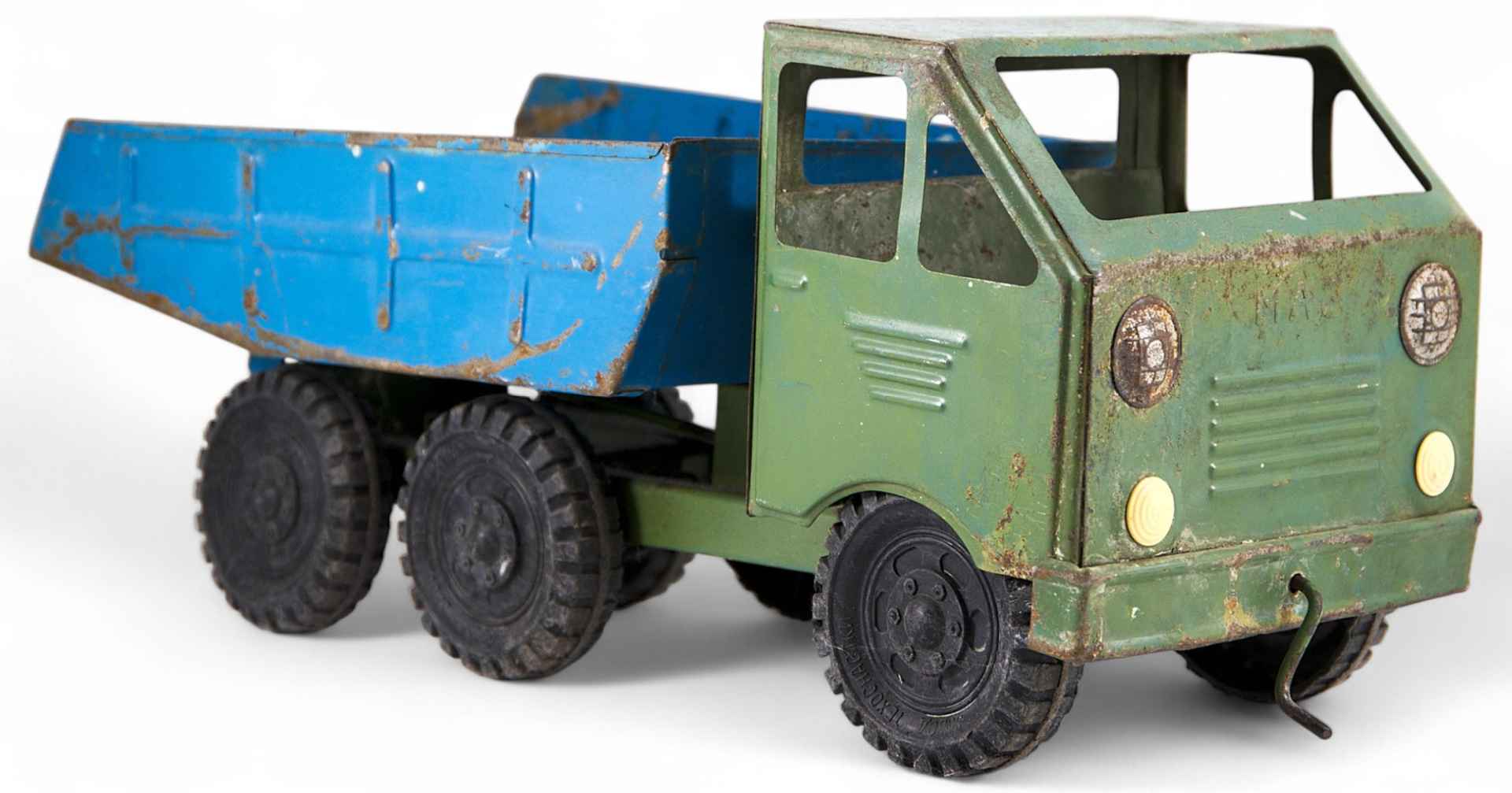 Игрушечная модель самосвала «МАЗ», собранную из жестяного металла. Колеса модели выполнены из пластмассы. На каждом колесе имеется выпуклая надпись: «РОССОШЬ ЗАВОД ТЕХОСНАСТКИ». Над решеткоймотора автомобиля надпись: «МАЗ».Самосвал—грузовой саморазгружающийся автомобиль, прицеп или полуприцеп с ку зовом (чаще бункерного типа), механически (как правило, гидравлически) наклоняемым для выгрузки груза или с принудительной разгрузкой. МАЗ (Минский автомобильный завод) —советская и белорусская автомобилестроительная компания, специализирующаяся на выпуске большегрузной автомобильной, а также автобусной, троллейбусной иприцепной техники.