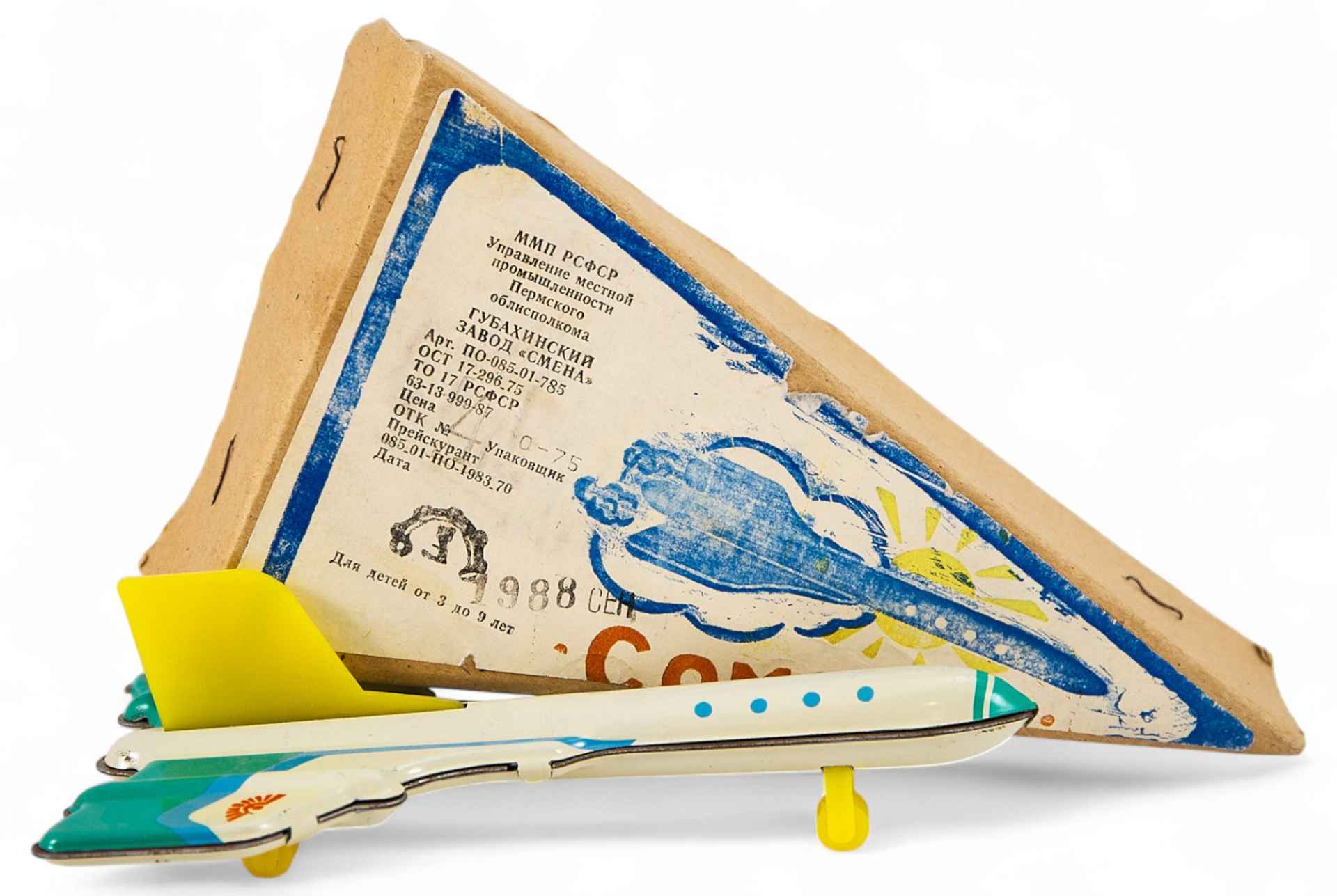На упаковке имеется надпись: ММП РСФСР Управление местной промышленности Пермского облисполкома Губахинский завод “Смена”. Дата 1988 сен. Для детей от 3 до 9 лет. Самолет.