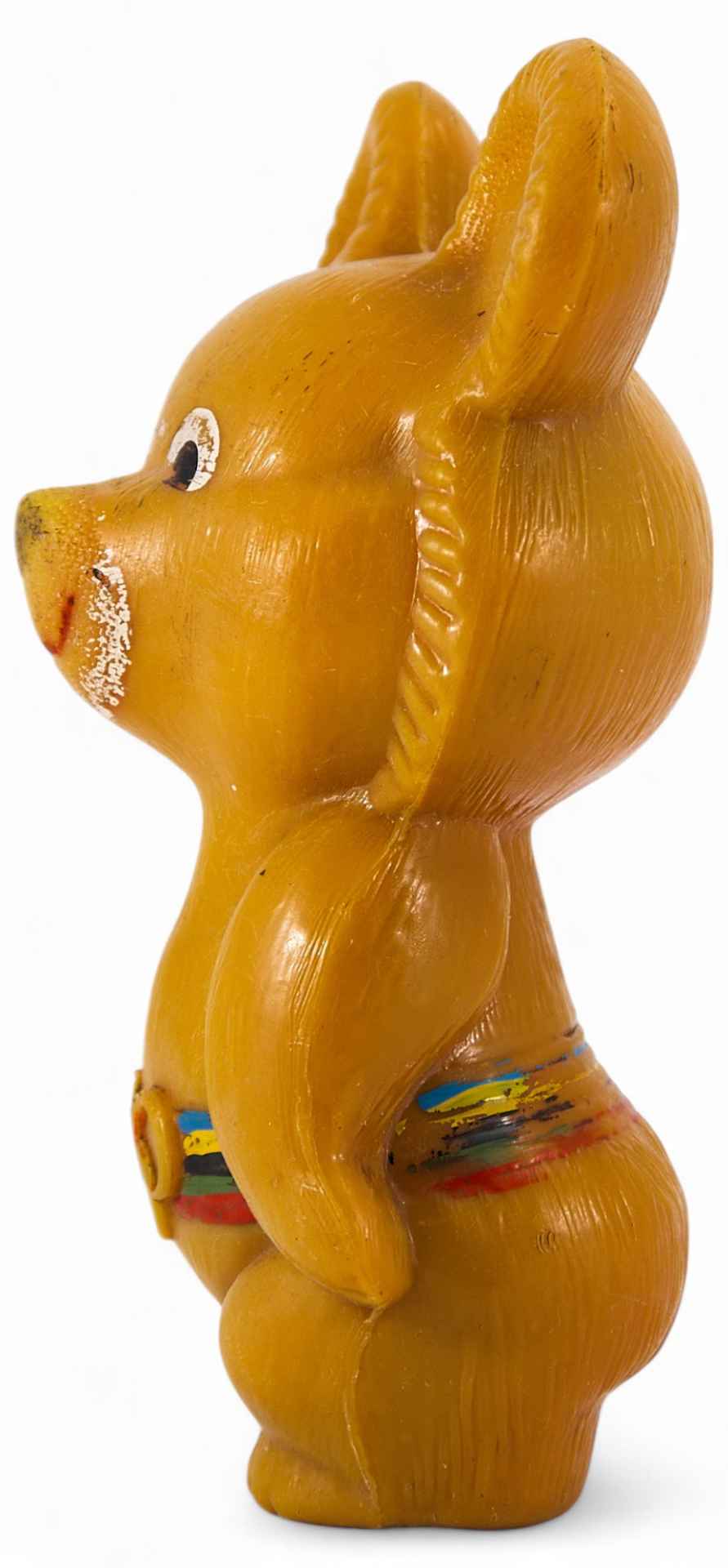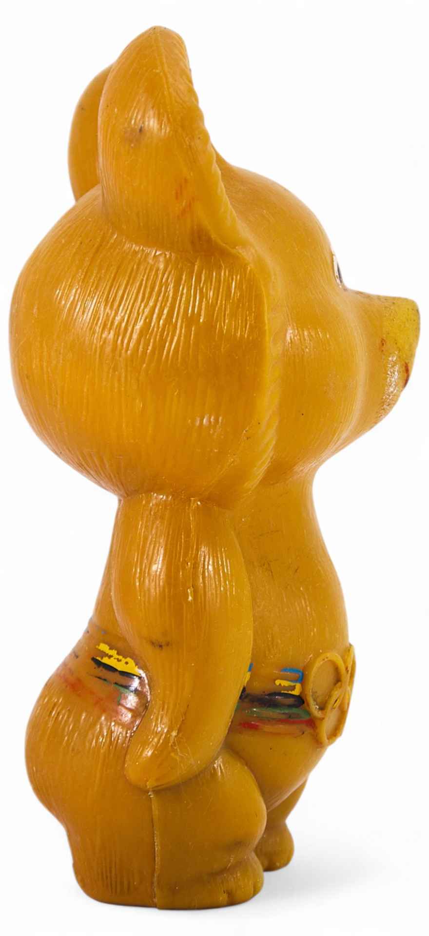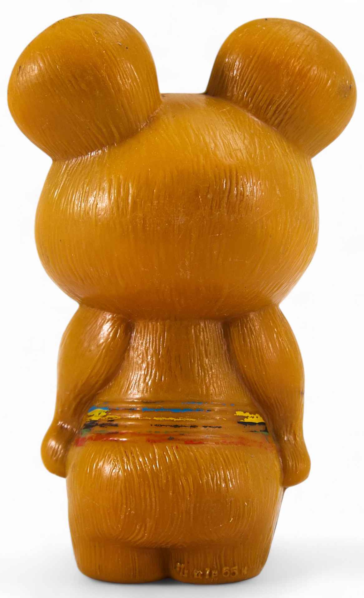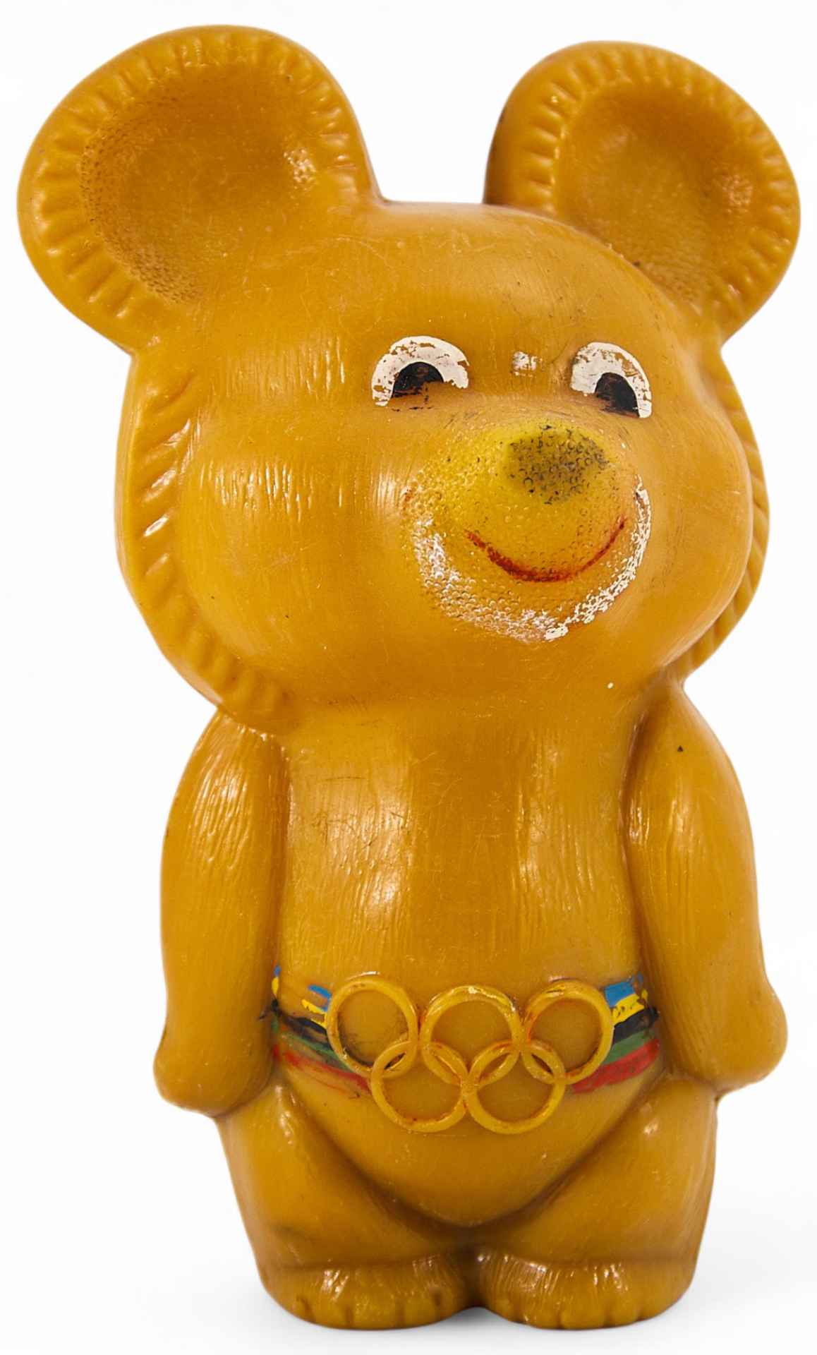 антропоморфного медведя, улыбающегося и стоящего на задних лапах. На медвежонке ремень с пряжкой в виде пяти олимпийских колец. Автором персонажа является книжный иллюстратор В.А. Чижиков. Имеется клеймо фабрики детских игрушек “Росигрушка”. Предприятие находится в Смоленской области в городе Рославле. Фабрика “Росигрушка” ведет свою