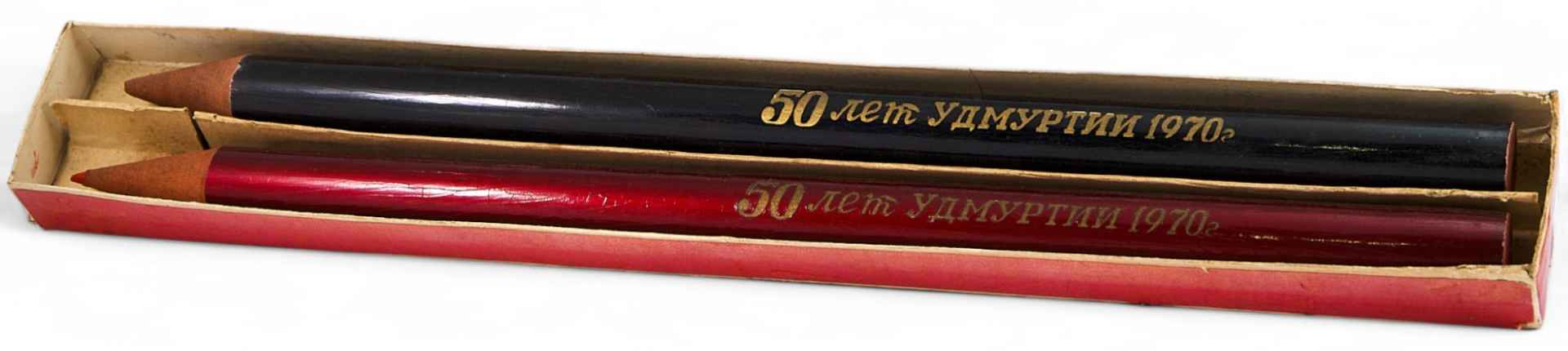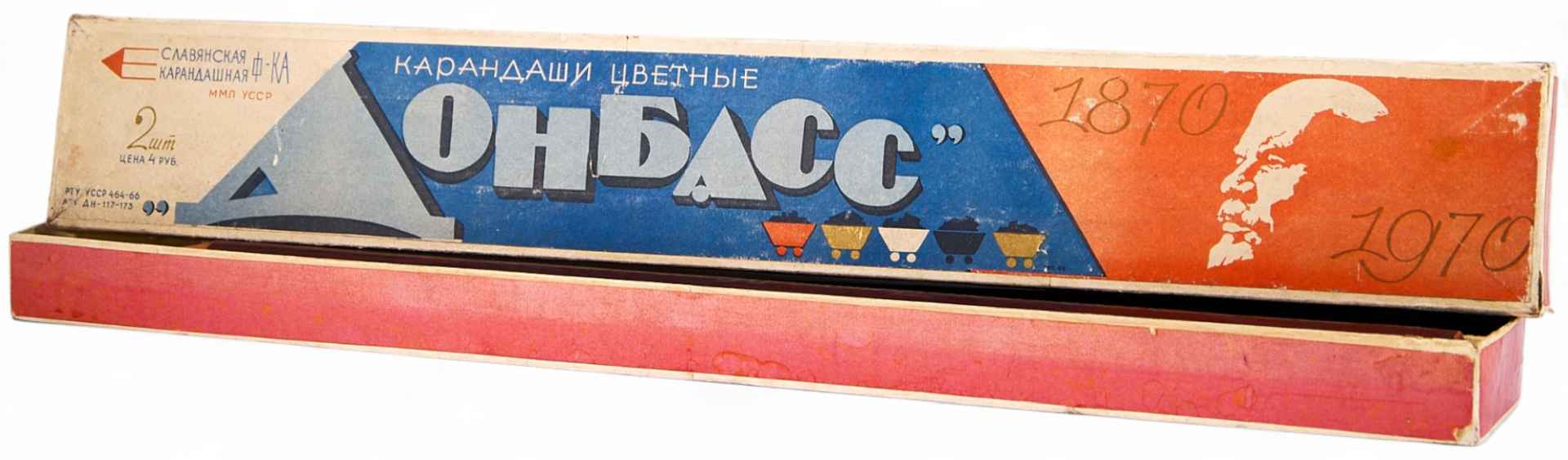 Набор цветных сувенирных карандашей "Донбасс" Славянской карандашной фабрики. Карандаши изготовлены в соответствии с РТУ УССР 464-66 ДН-117-173. На коробке надпись: «Донбасс», изображение вагонеток, красно-белого профиля В.И.Ленина с памятными датами «1870 1970». На красном и синем карандашах надпись: «50 лет Удмуртии 1970»