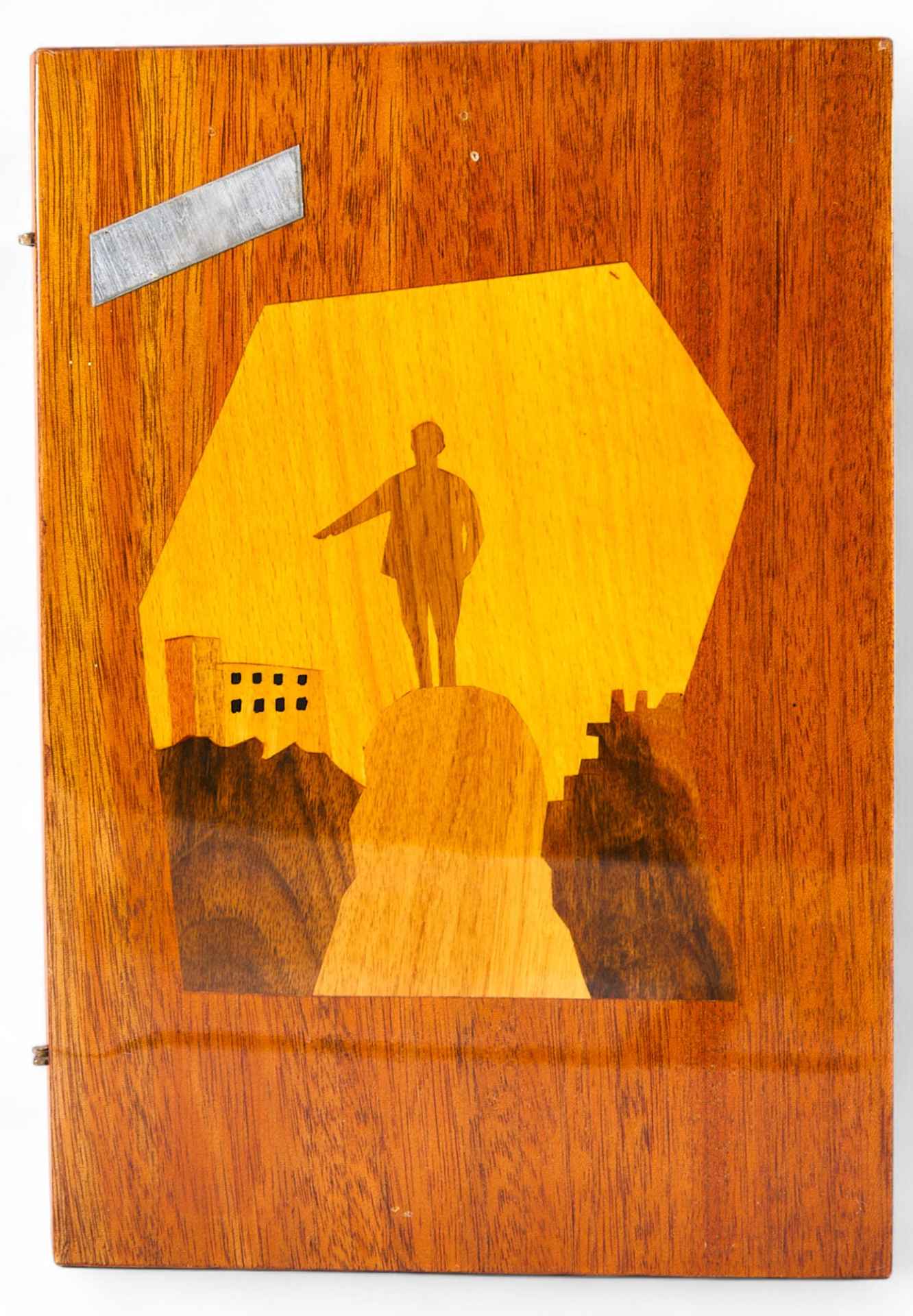 Подарочная папка “Адрес”. Папка изготовлена из двух красиво зафанерованных досок, скрепленных металлическими петлями. Для облицовки использован красивый отделочный шпон. На верхней доске в облицовочный слой врезан мозаичный набор с изображением памятника ЯМ. Свердлову. Видовое изображение выполнено в технике мозаики.