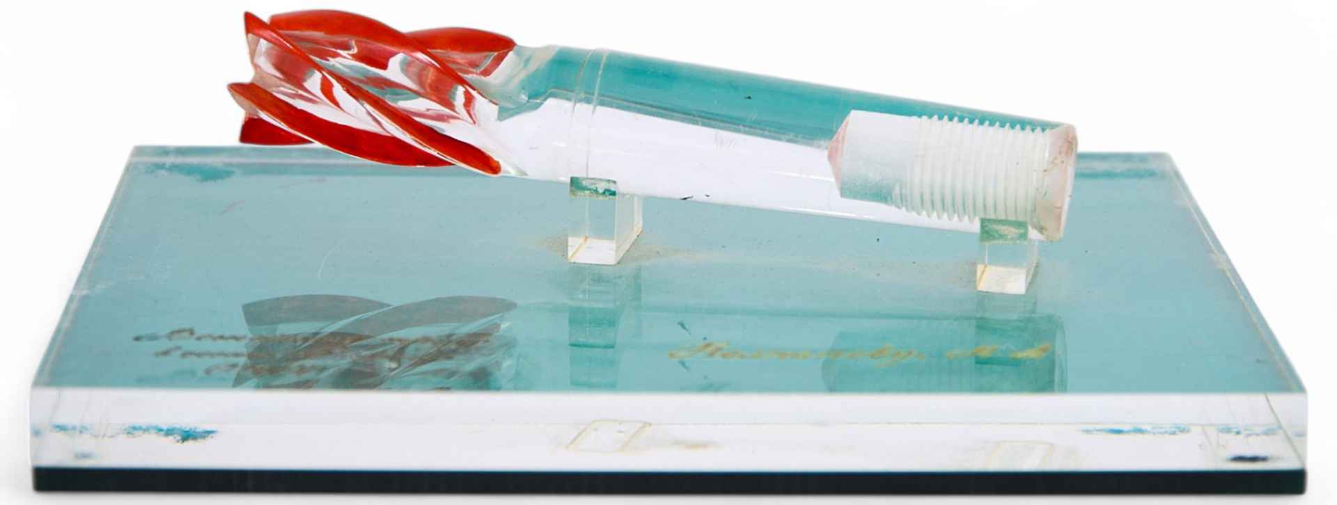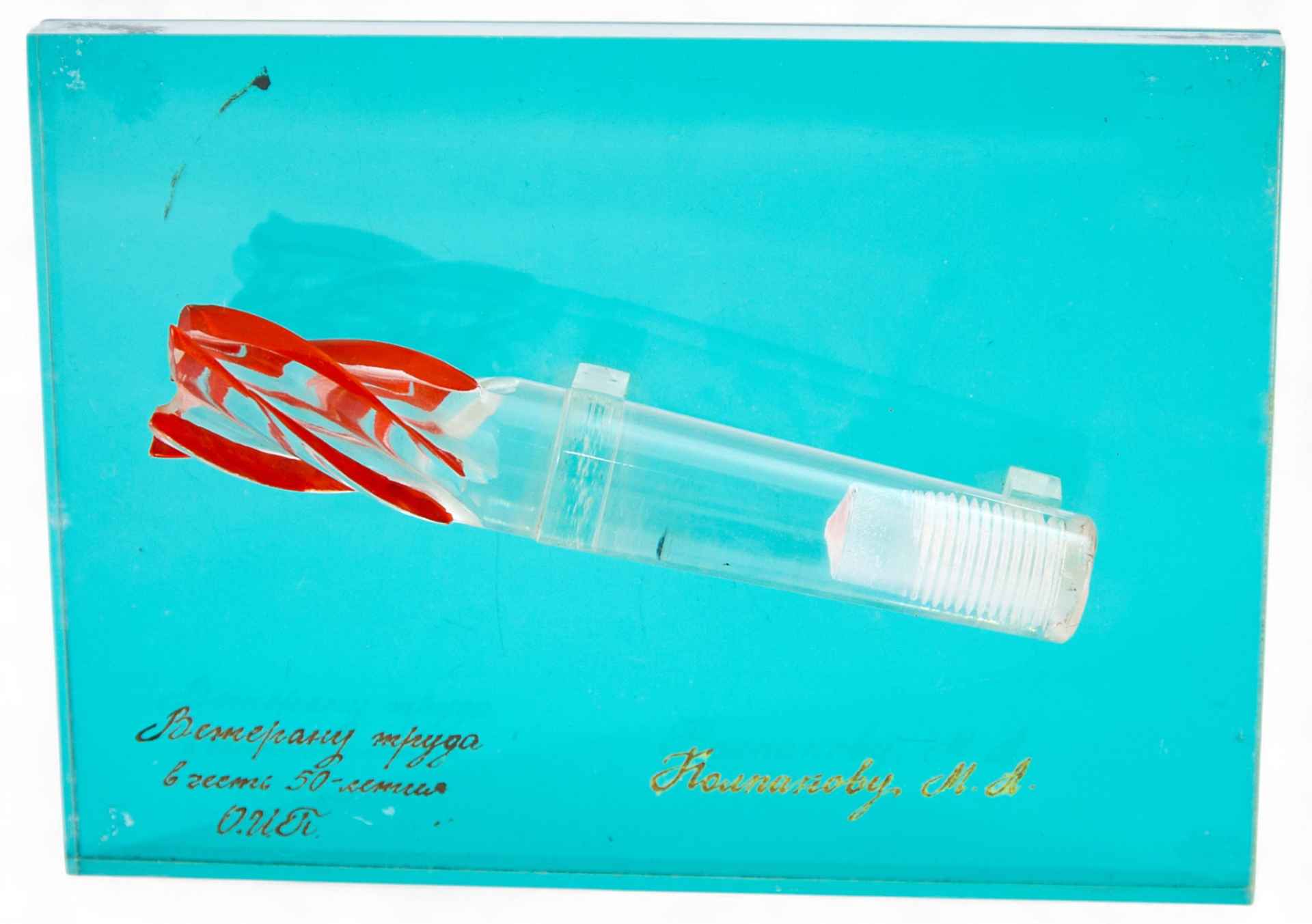 Памятная награда с объемным изображением концевой фрезы с коническим хвостовиком. Надпись на постаменте: «Ветерану труда в честь 50-летия О.Н.П. Колпакову М.А».