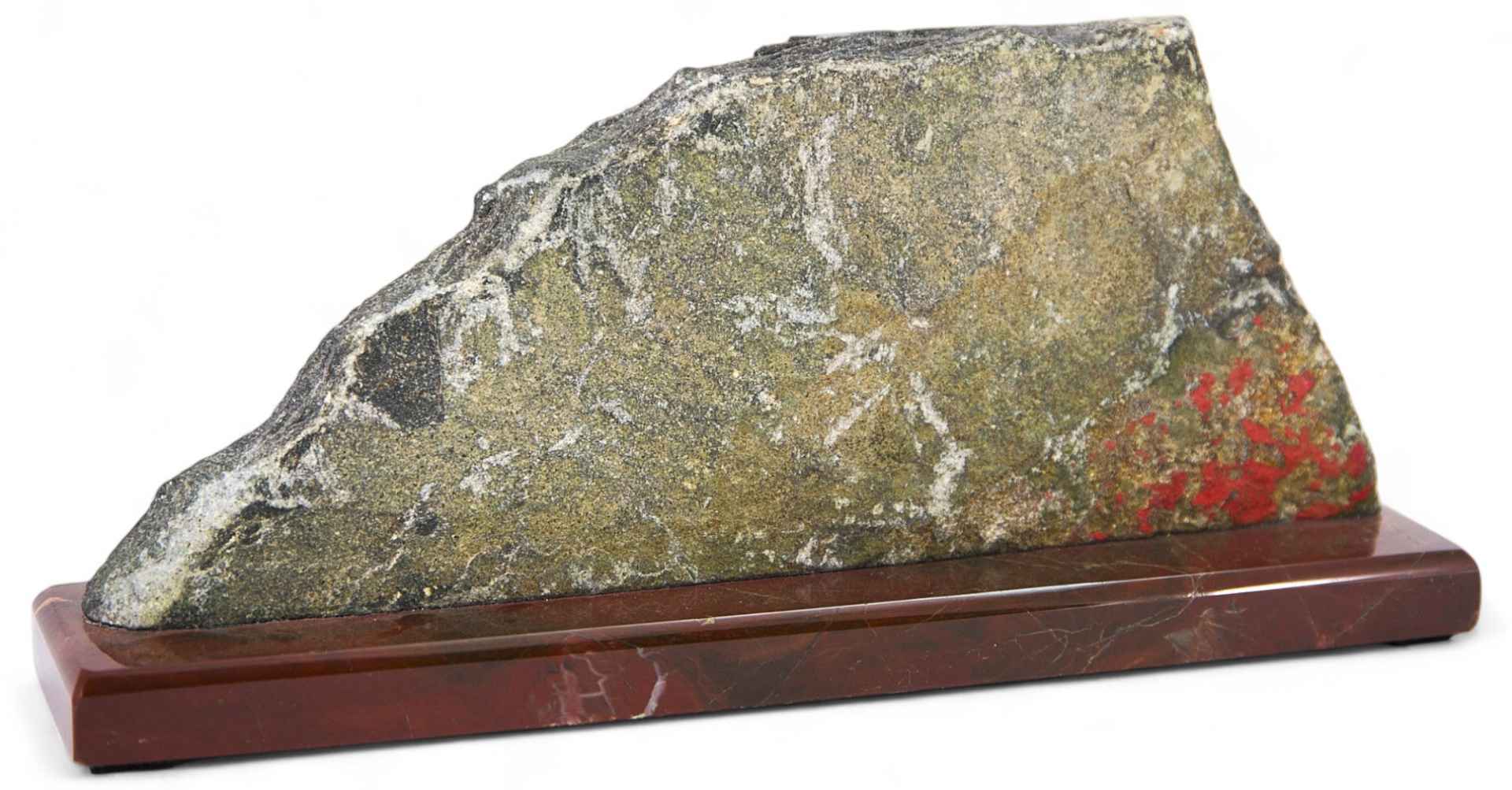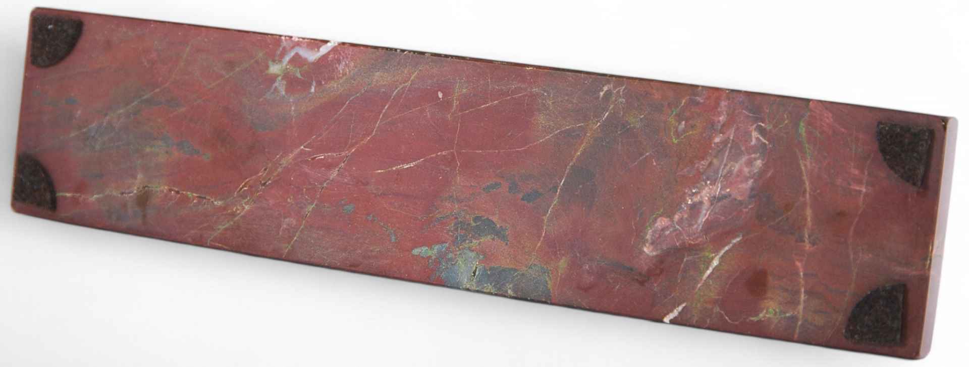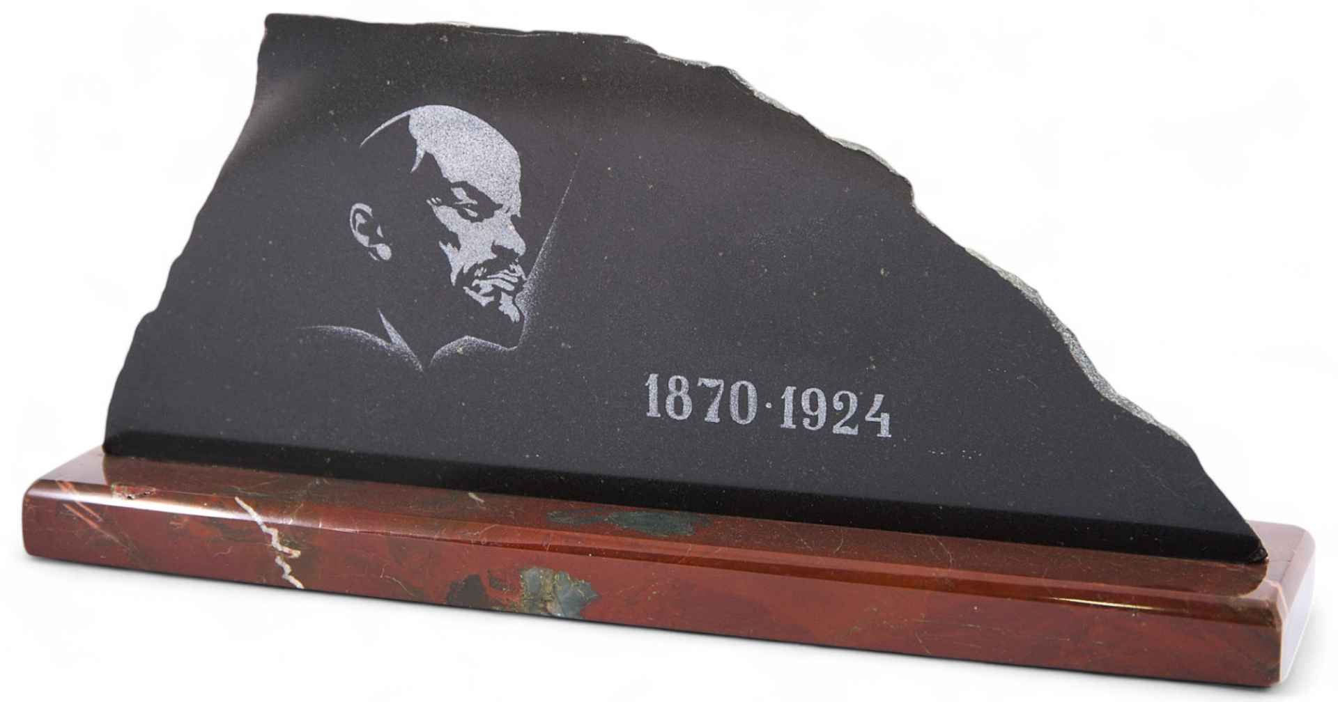 На подставке, выполненной из камня, неровно обрезанная пластина из черного гранита, на которой изображение В.И. Ленина (профиль вправо) и надпись: "1870 - 1924”. Подобные сувениры широко изготавливались советской промышленностью, регулярно выпускались на заводах, продавались в сувенирных лавках музейных учреждений и вручались советским работникам на память о событиях и датах, связанных с личностью "вождя мирового пролетариата”.