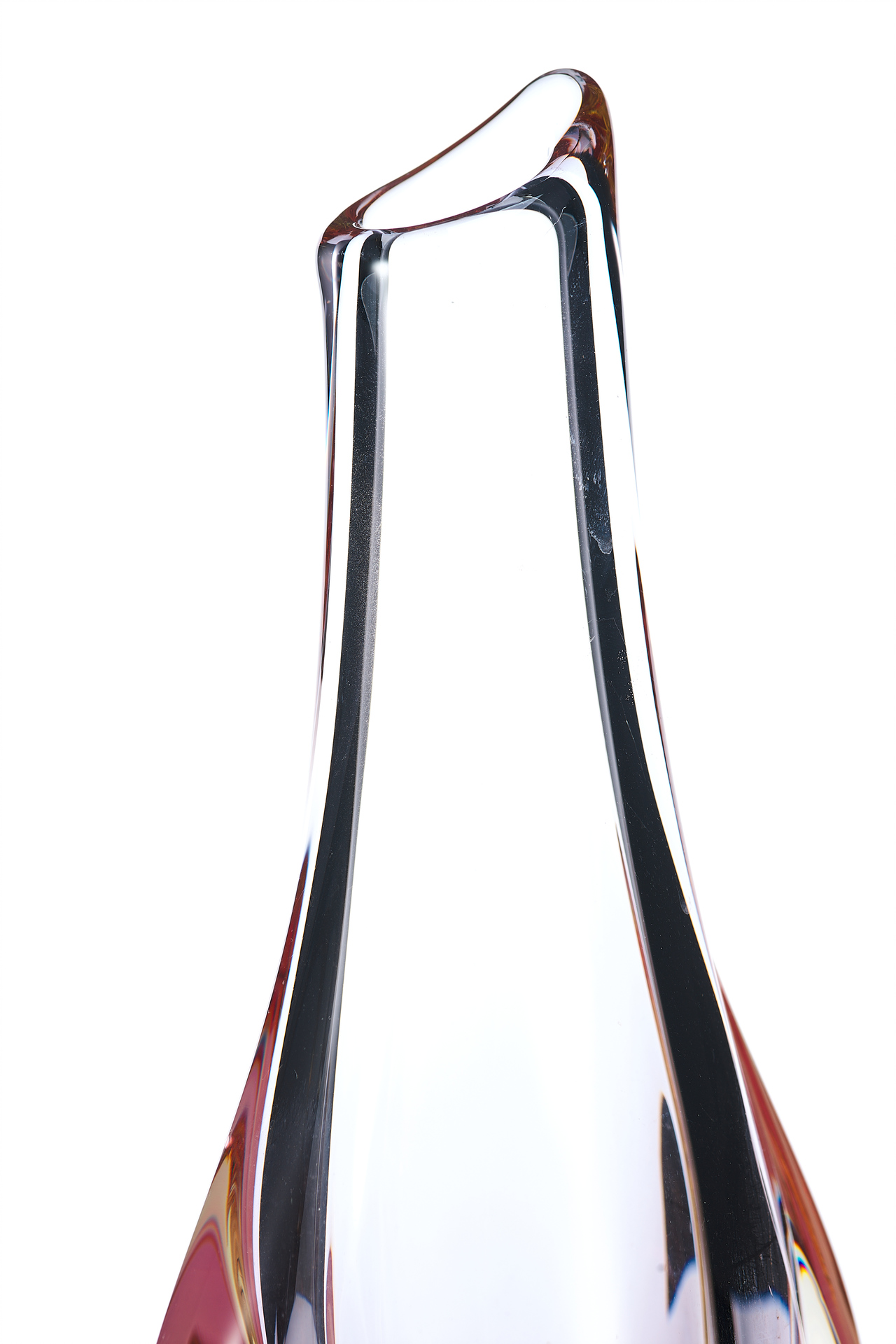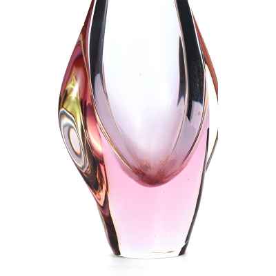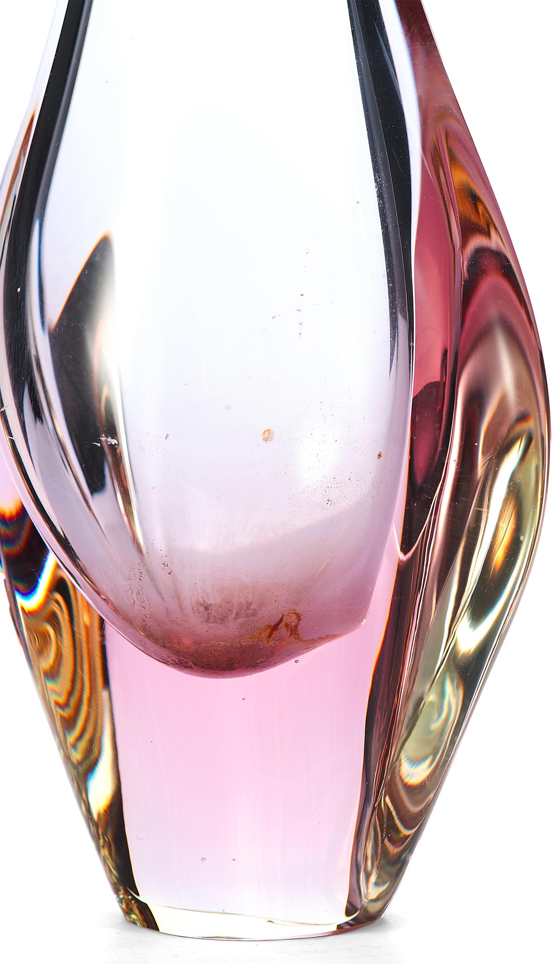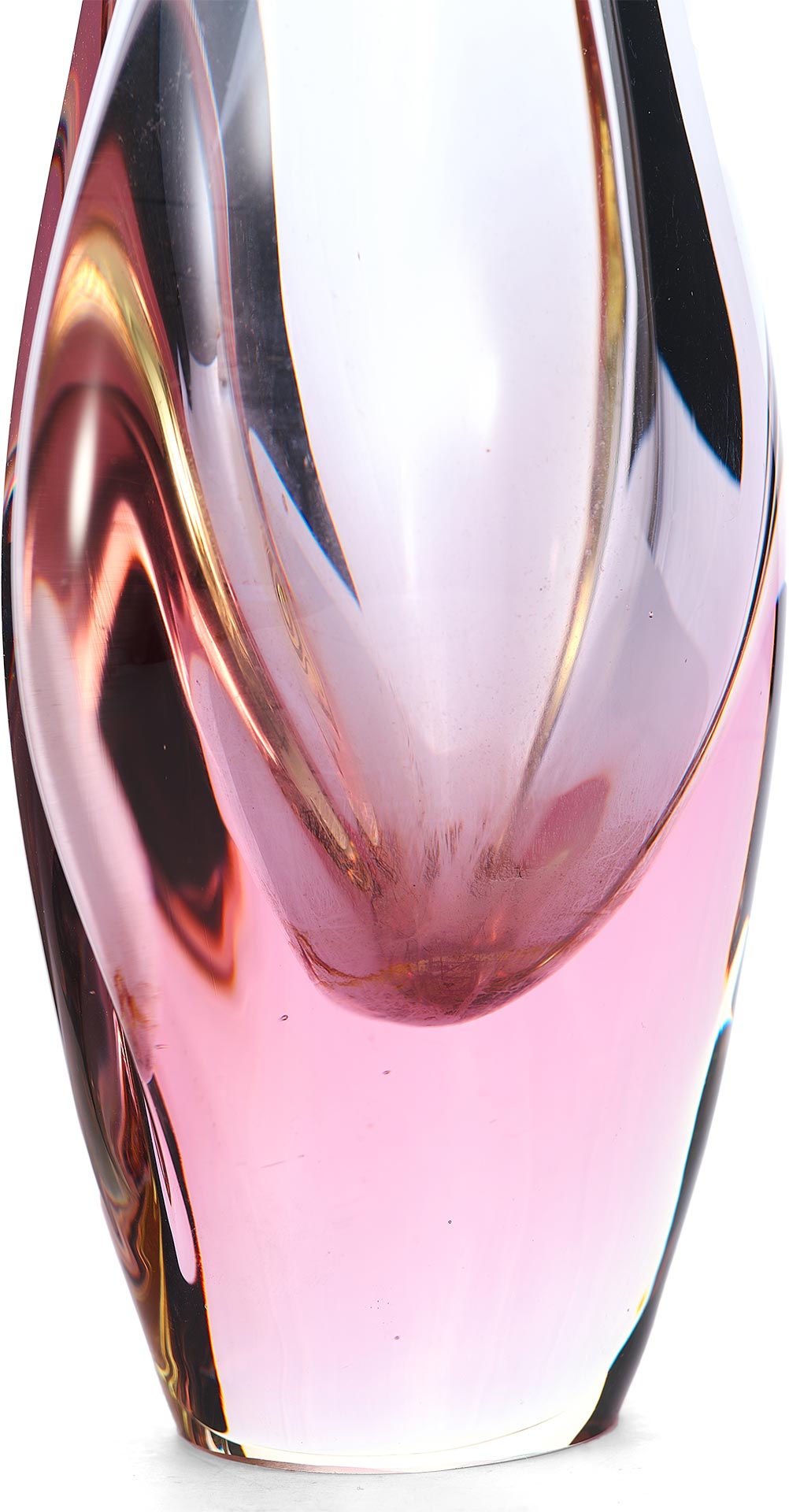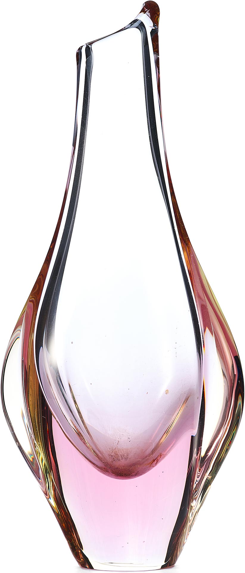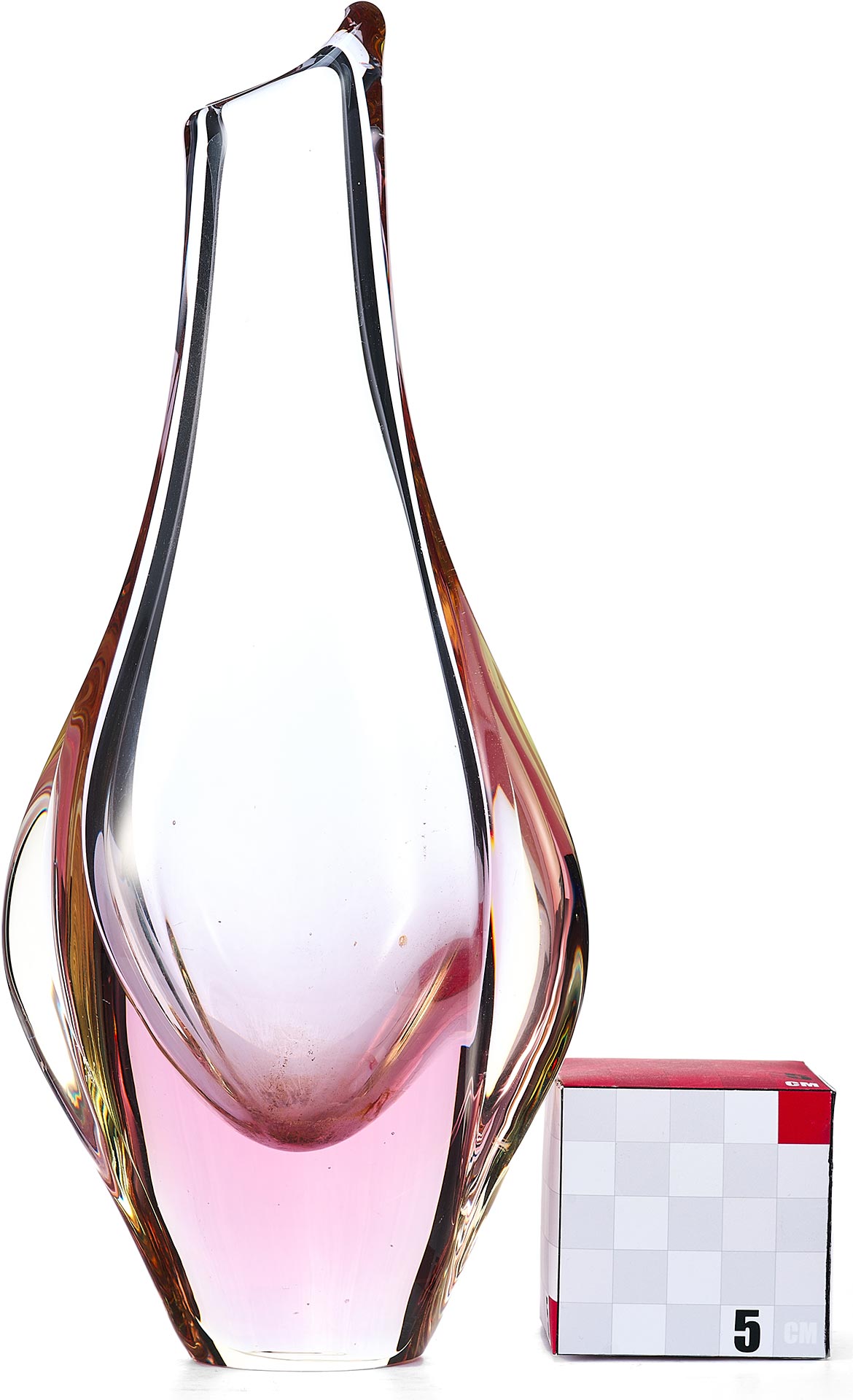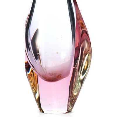 Ваза выполнена из бесцветного и цветного стекла, отлитого с высокой точностью. Её грушевидный корпус с овальным углублением демонстрирует продуманный баланс конструктивности и пластичности. Косо срезанный верх придает изделию динамичность и современное звучание, что характерно для эстетики середины XX века. Цветовые переливы, сочетающие розоватые и янтарные оттенки, подчеркивают прозрачность и глубину стекла.
