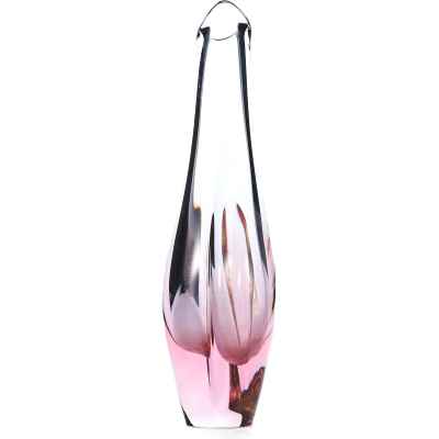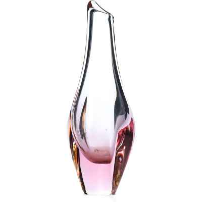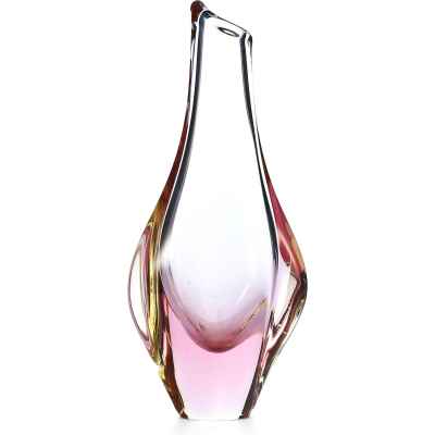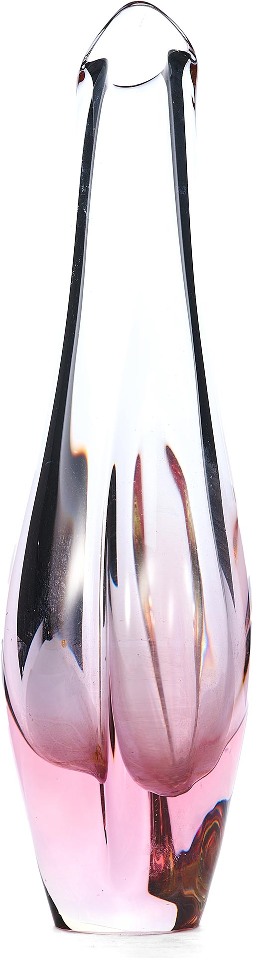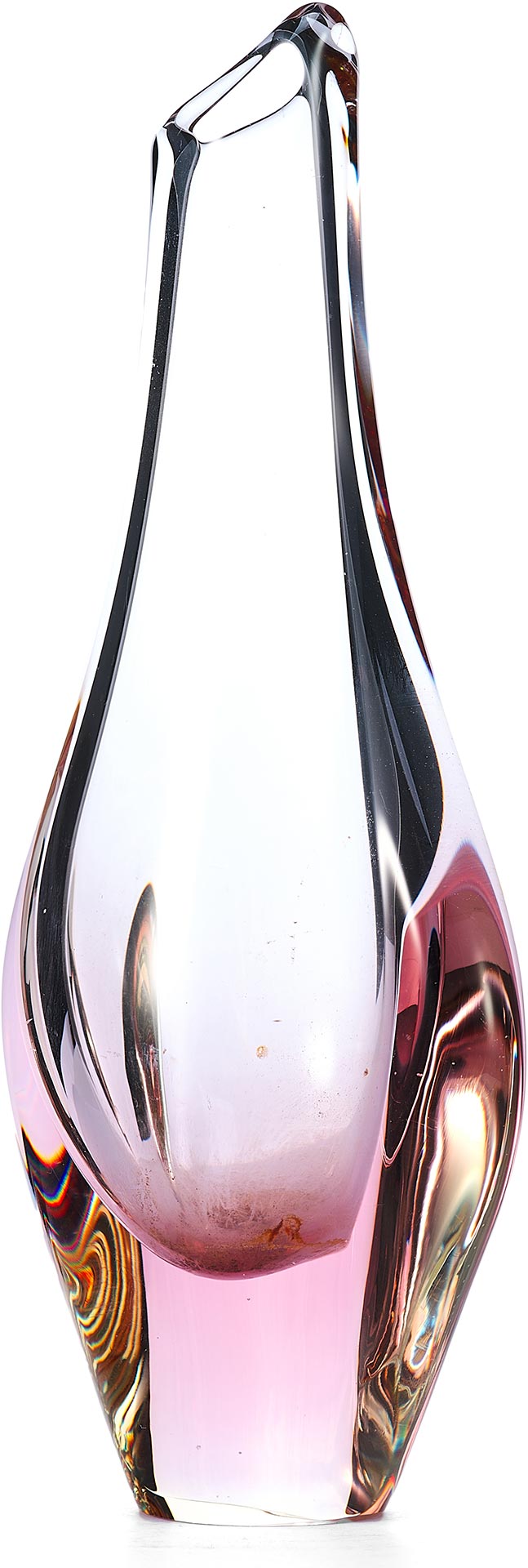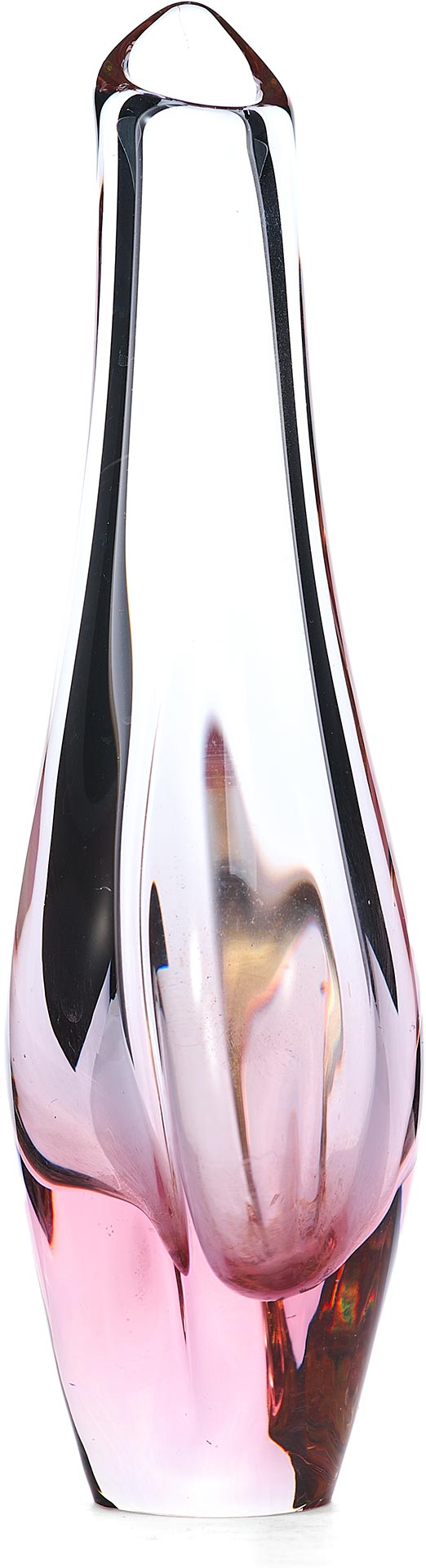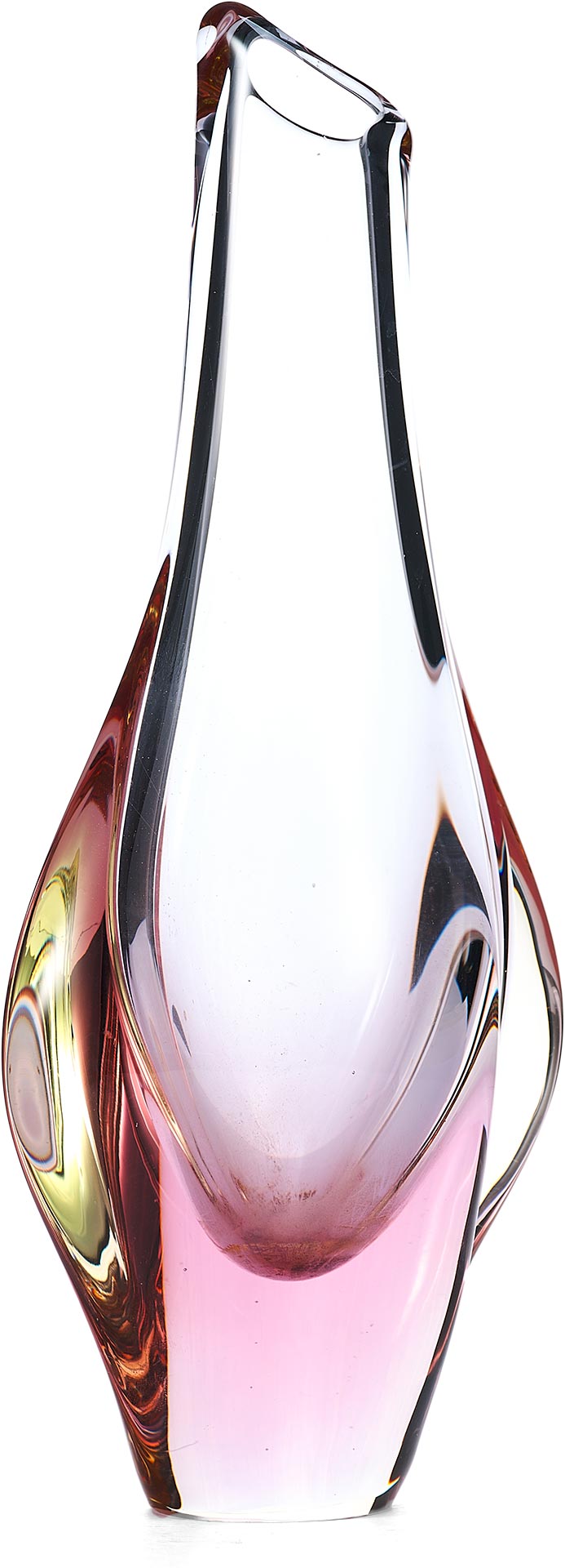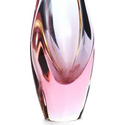 Ваза выполнена из бесцветного и цветного стекла, отлитого с высокой точностью. Её грушевидный корпус с овальным углублением демонстрирует продуманный баланс конструктивности и пластичности. Косо срезанный верх придает изделию динамичность и современное звучание, что характерно для эстетики середины XX века. Цветовые переливы, сочетающие розоватые и янтарные оттенки, подчеркивают прозрачность и глубину стекла.