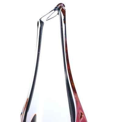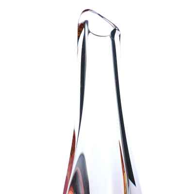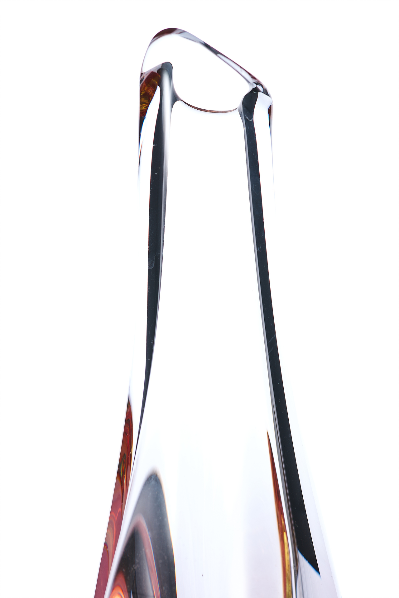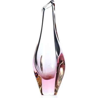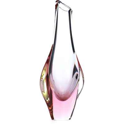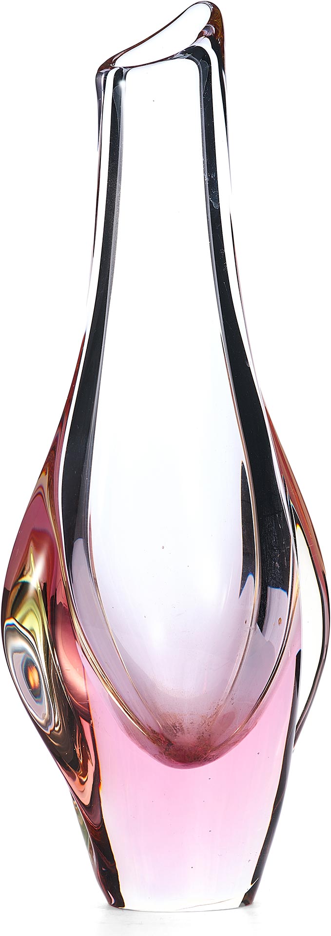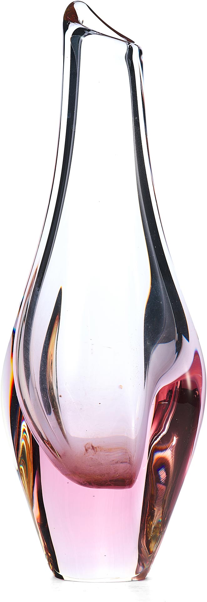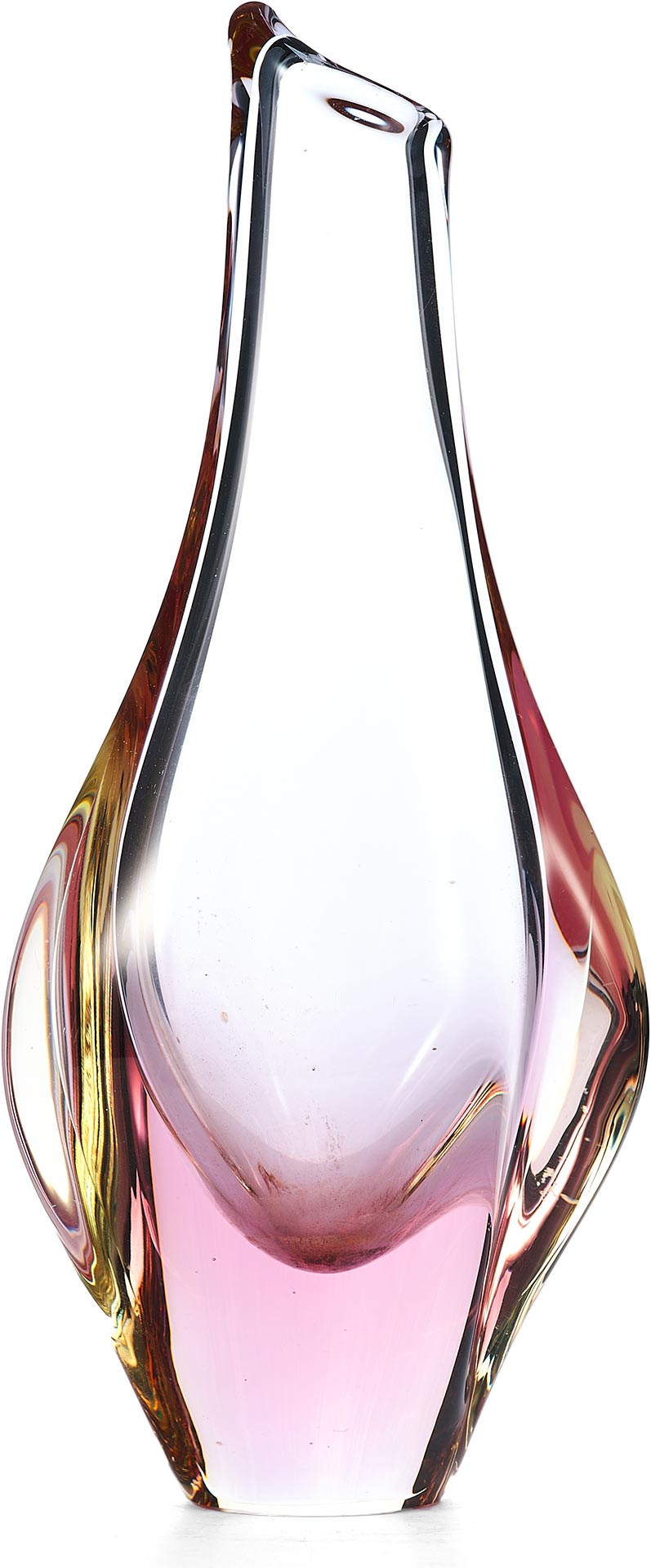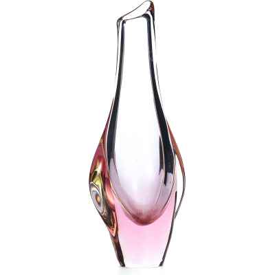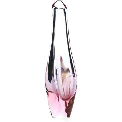 Ваза выполнена из бесцветного и цветного стекла, отлитого с высокой точностью. Её грушевидный корпус с овальным углублением демонстрирует продуманный баланс конструктивности и пластичности. Косо срезанный верх придает изделию динамичность и современное звучание, что характерно для эстетики середины XX века. Цветовые переливы, сочетающие розоватые и янтарные оттенки, подчеркивают прозрачность и глубину стекла.