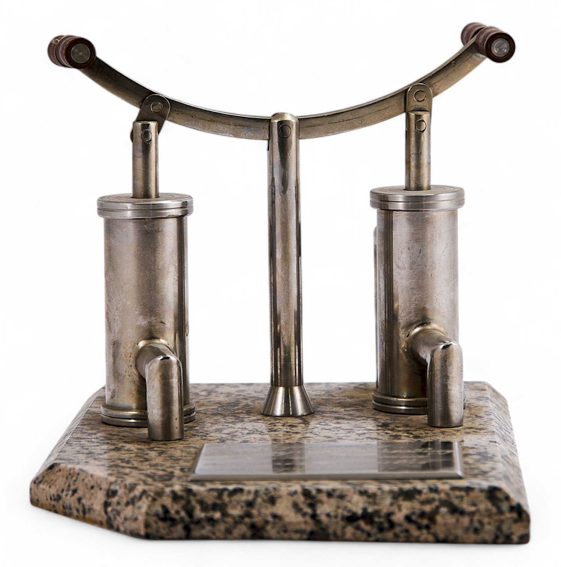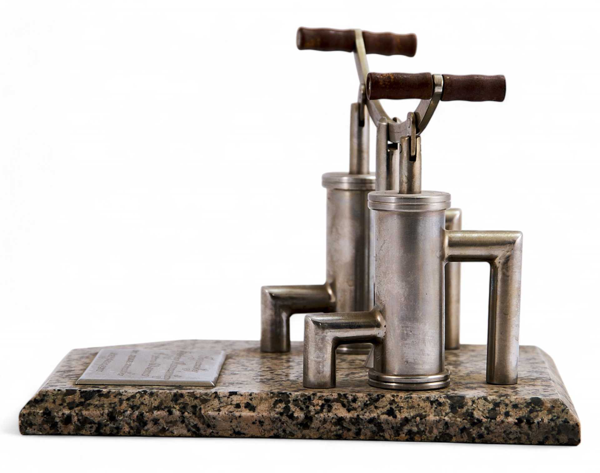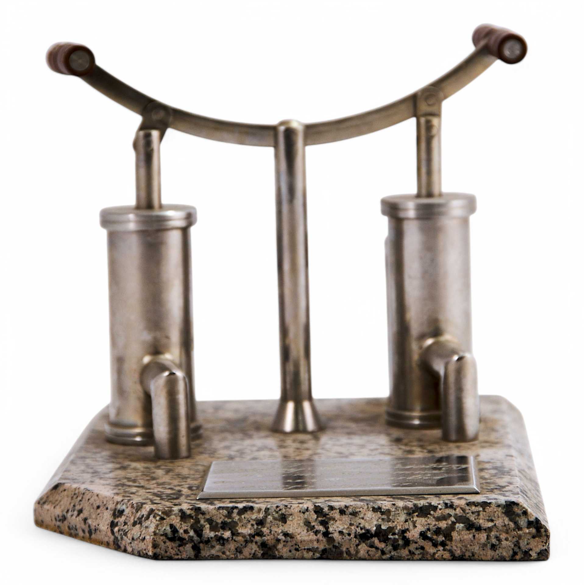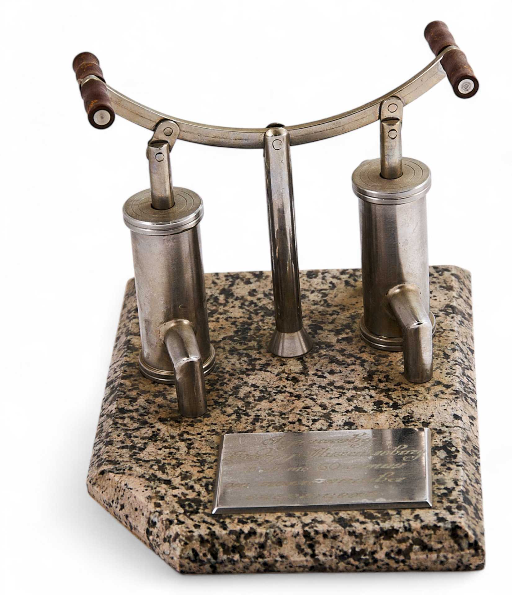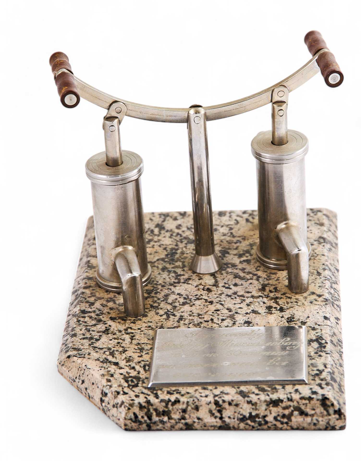 Миниатюрная модель металлического двухпоршневого гидронасоса Ктесибия, установленная на мраморное основание.