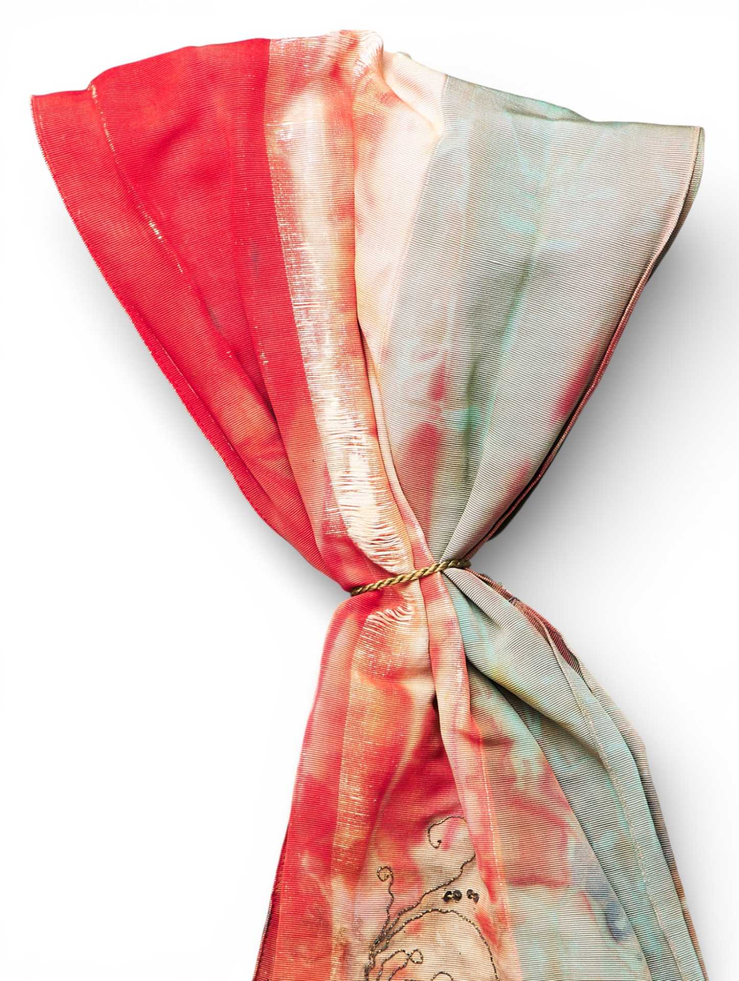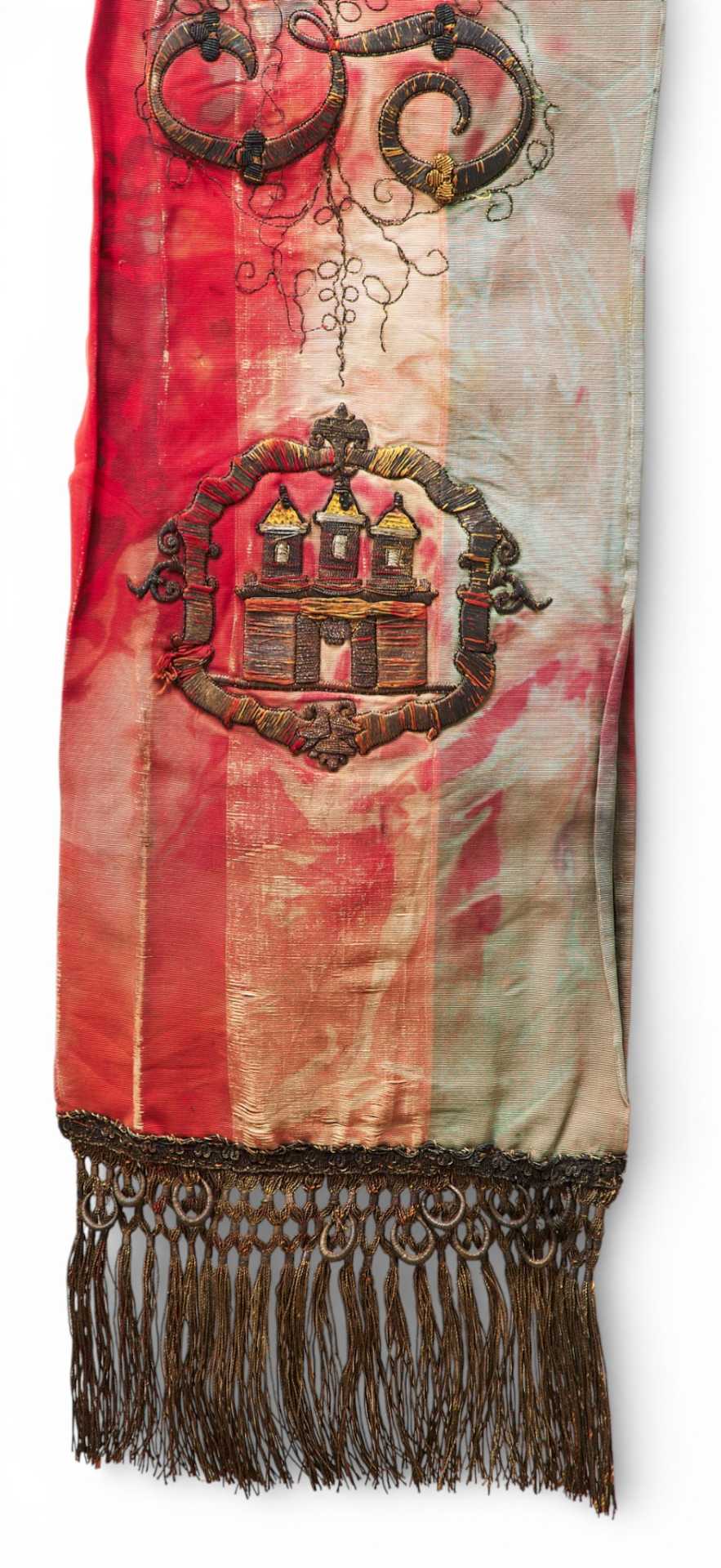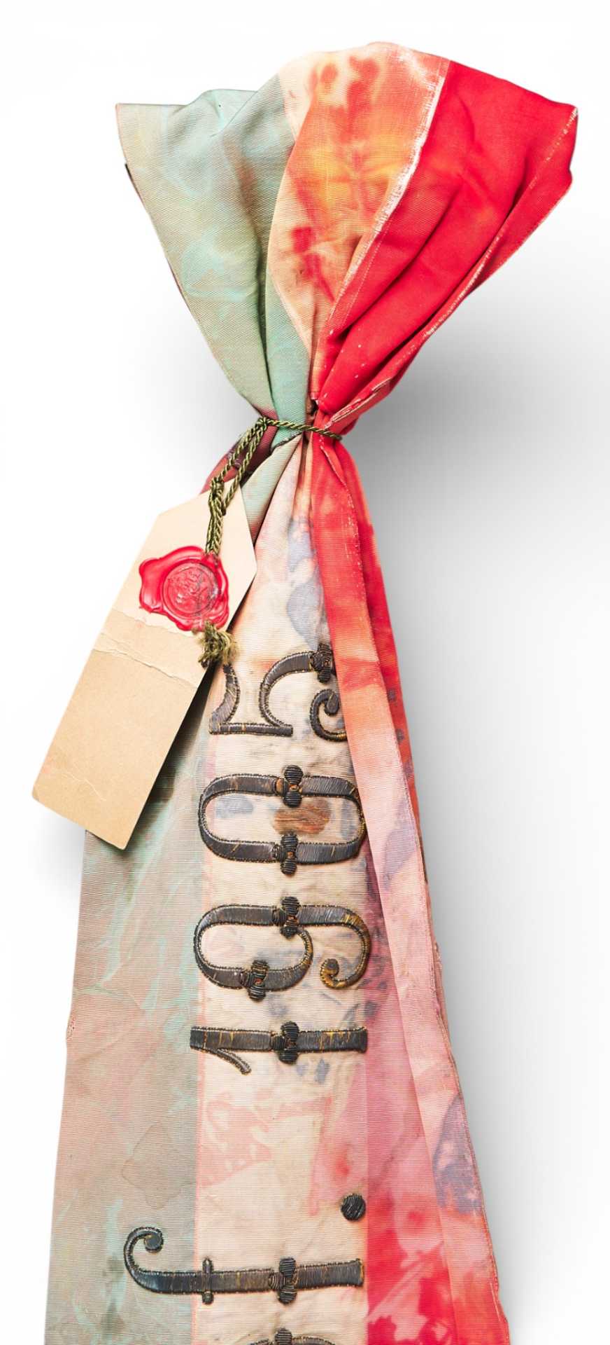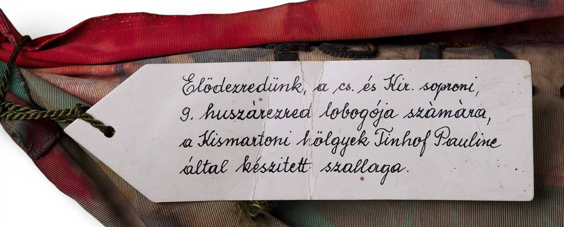 Лента к флагу 9-го гусарского полка Надашди Австро-Венгрии. Лента представляет собой двойную полосу ткани золотистого цвета, отделанного бахромой, с вышивкой металлизированной нитью. С одной стороны ленты надпись: «VAS VARMEGYEKÖZÖNSEGE» (предположительно округ. где формировался или дислоцировался полк). Округ Vas - был административной единицей Королевства Венгрии. Округ граничит с Нижней Австрией и Штирией и венгерским графством Шопрон. Веспрем и Зала. Округ был создан в 11 - м веке и был в таком виде до 1918 г. Далее территория была разделена между соседними графствами. Ференц (Франц) Надаіпдіі / Franz Leopold von Nádasdy au fFogáras 30.09.1708 (Radkersburg, Steiermark. Austria) — 22.03.1783 (Karlstadt / Karlovac. Croatia) известнейший полководец Венгрии, участник многочисленных сражений. В 1778 г., Ференц Леопольд в предверии новой войны с Пруссией был назначен командующим армии в Галиции. Мир был подписан быстро, Надашди вышел в отставку в 70-летнем возрасте.