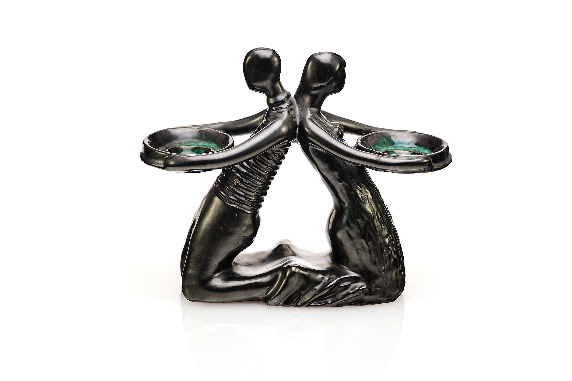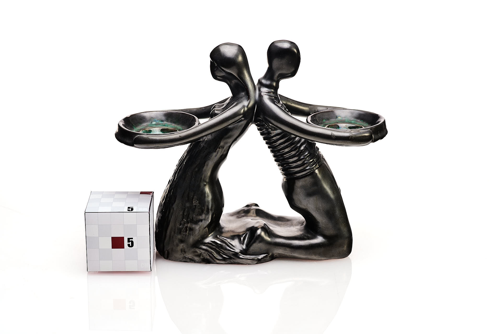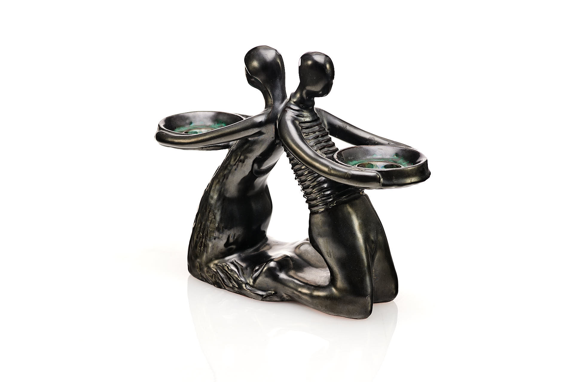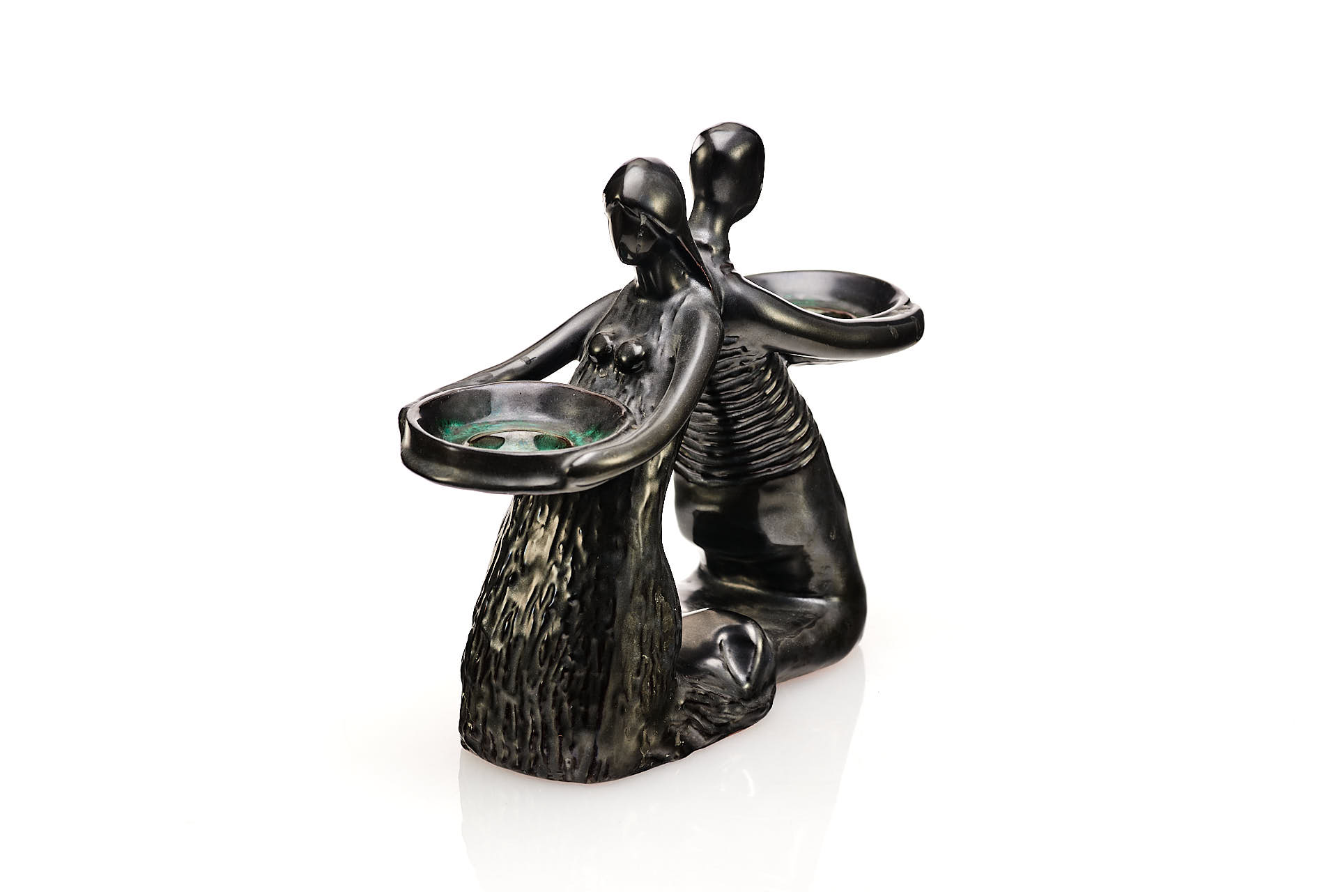 Скульптурная композиция представляет собой две фигурки: мужскую и женскую сидящих на коленях спинами друг к другу, соприкасаясь плечами; в вытянутых вперёд руках держат круглые чаши, которые служат подставками для свечей.