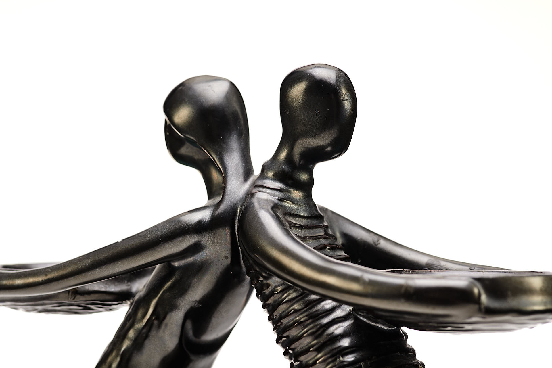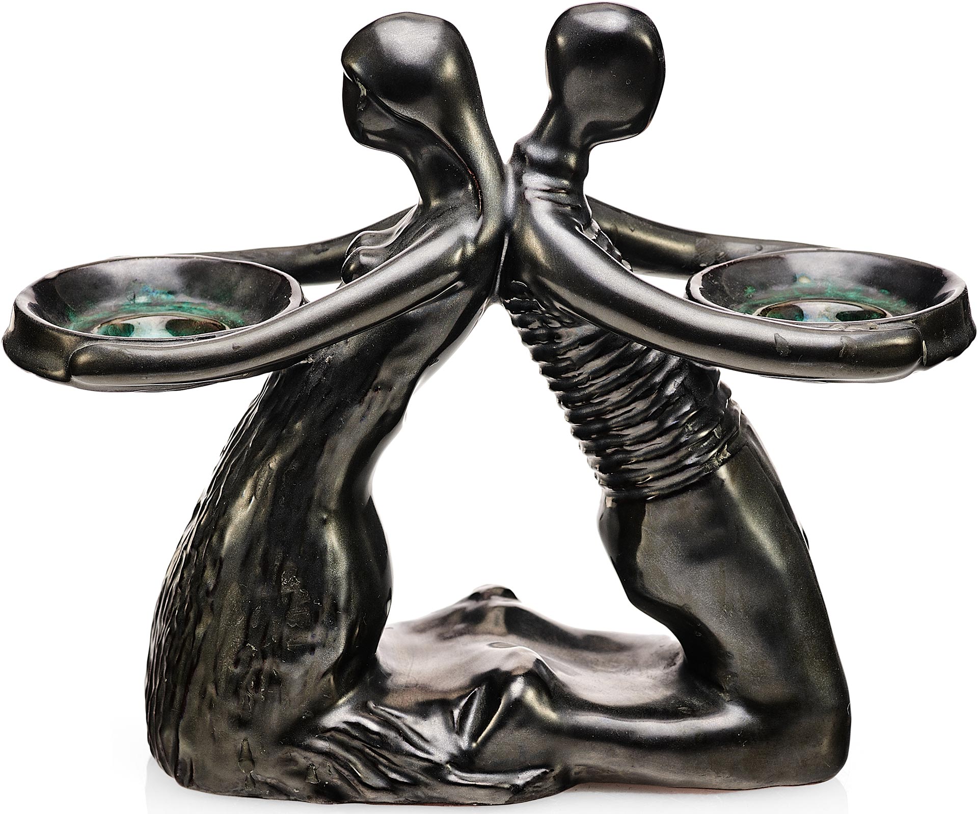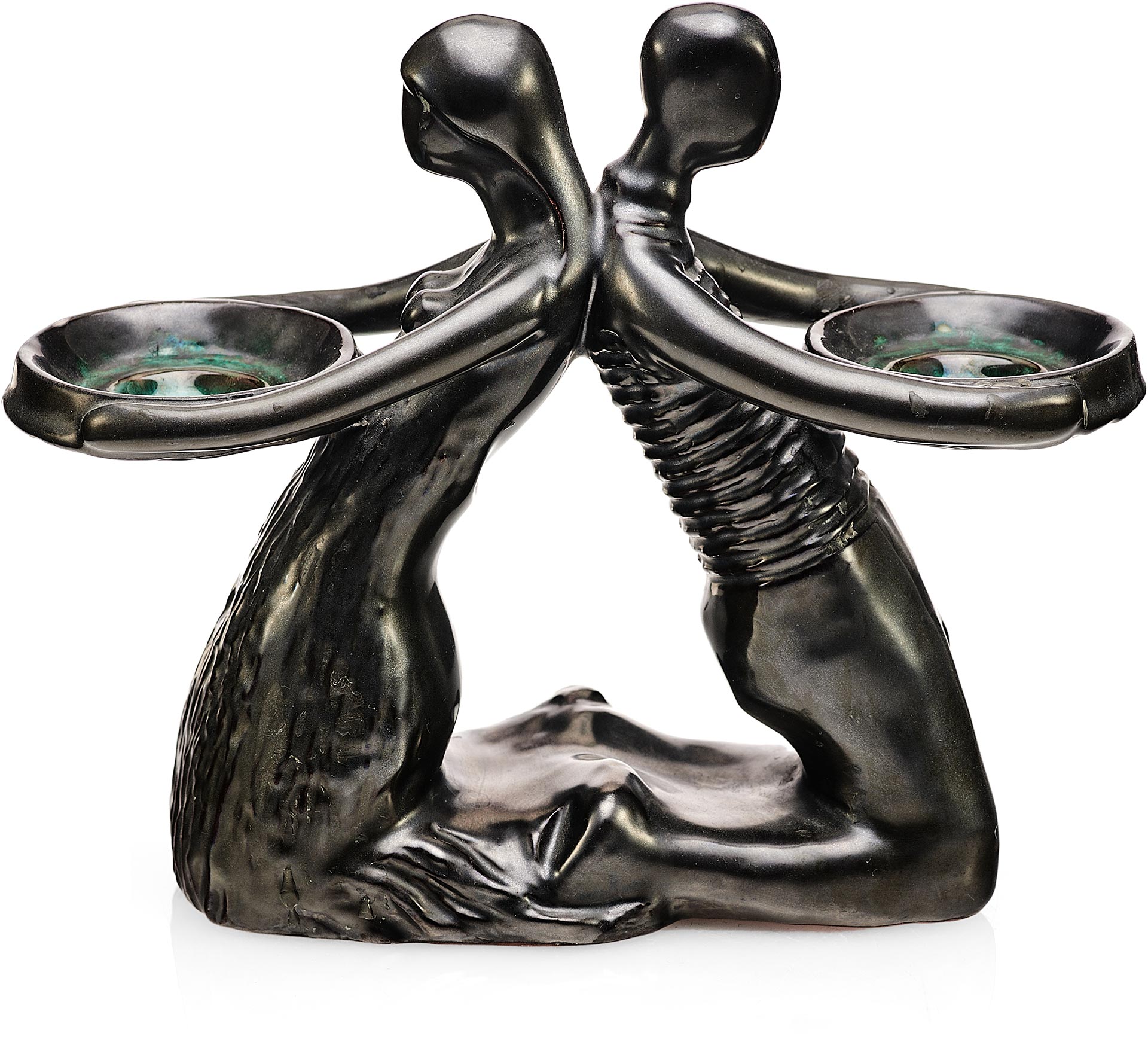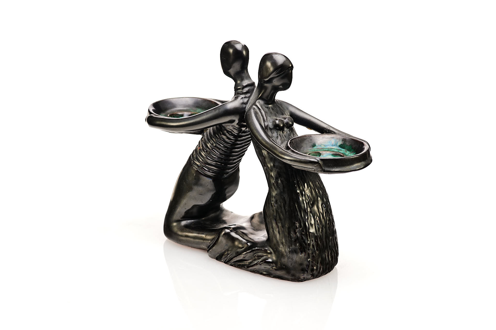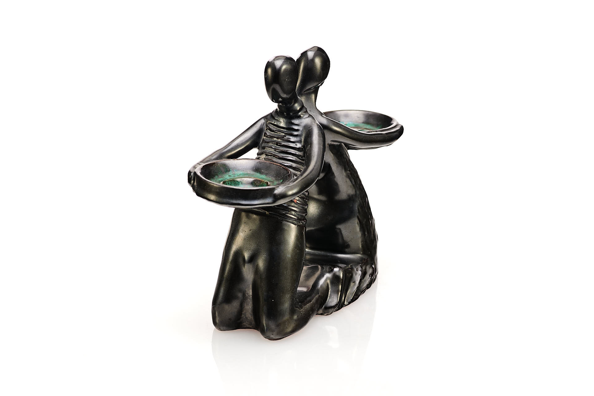 Скульптурная композиция представляет собой две фигурки: мужскую и женскую сидящих на коленях спинами друг к другу, соприкасаясь плечами; в вытянутых вперёд руках держат круглые чаши, которые служат подставками для свечей.