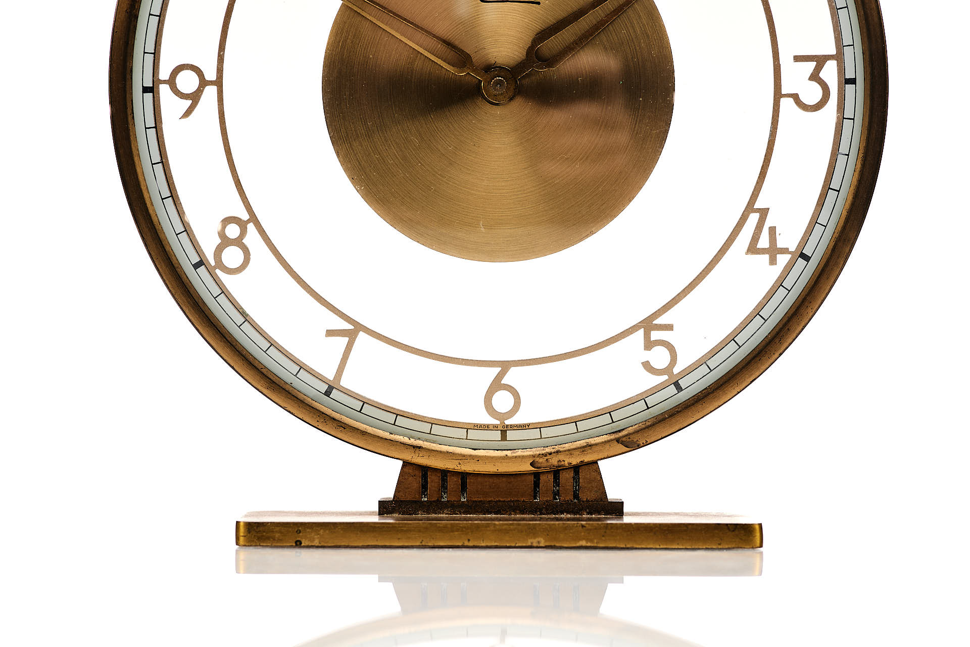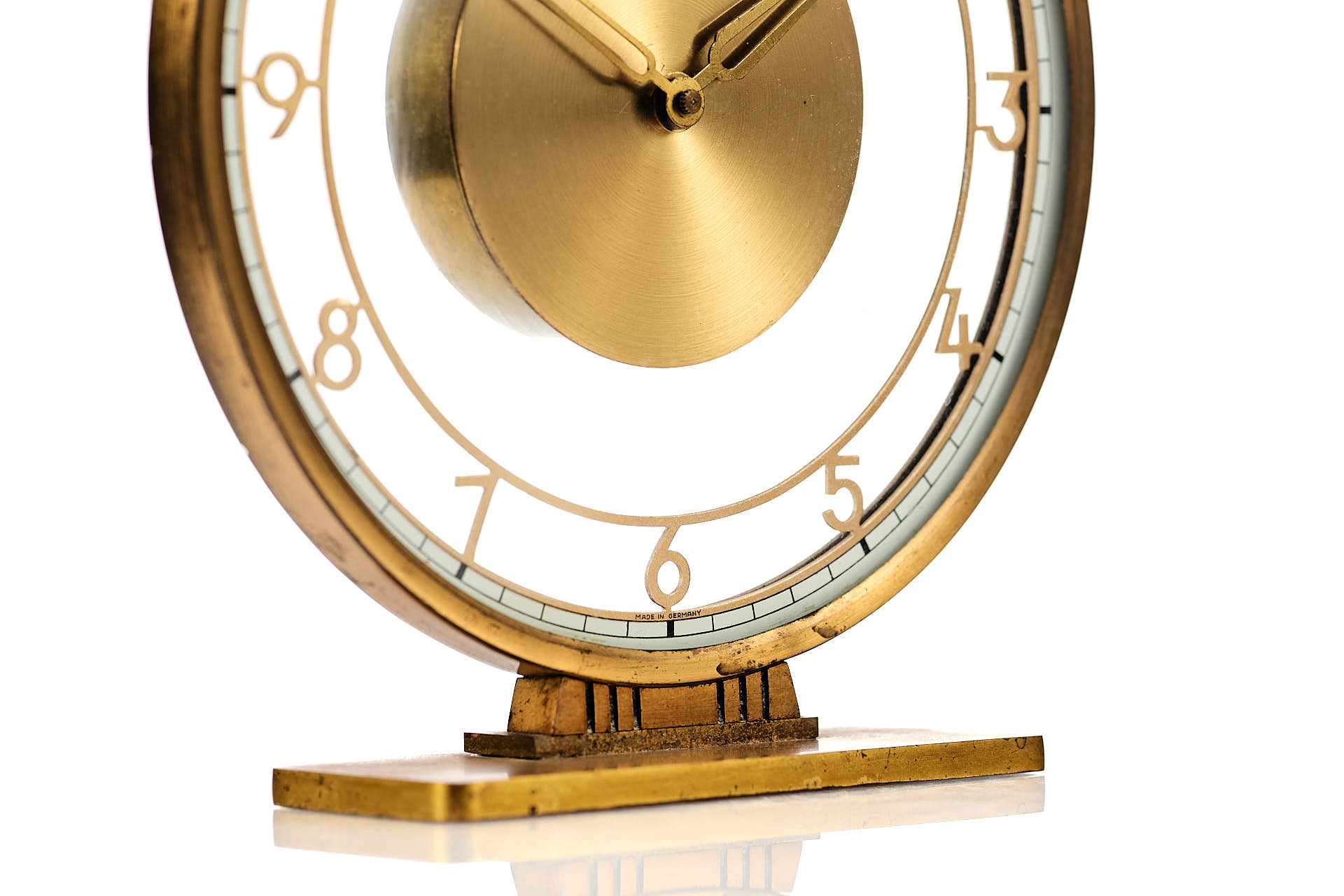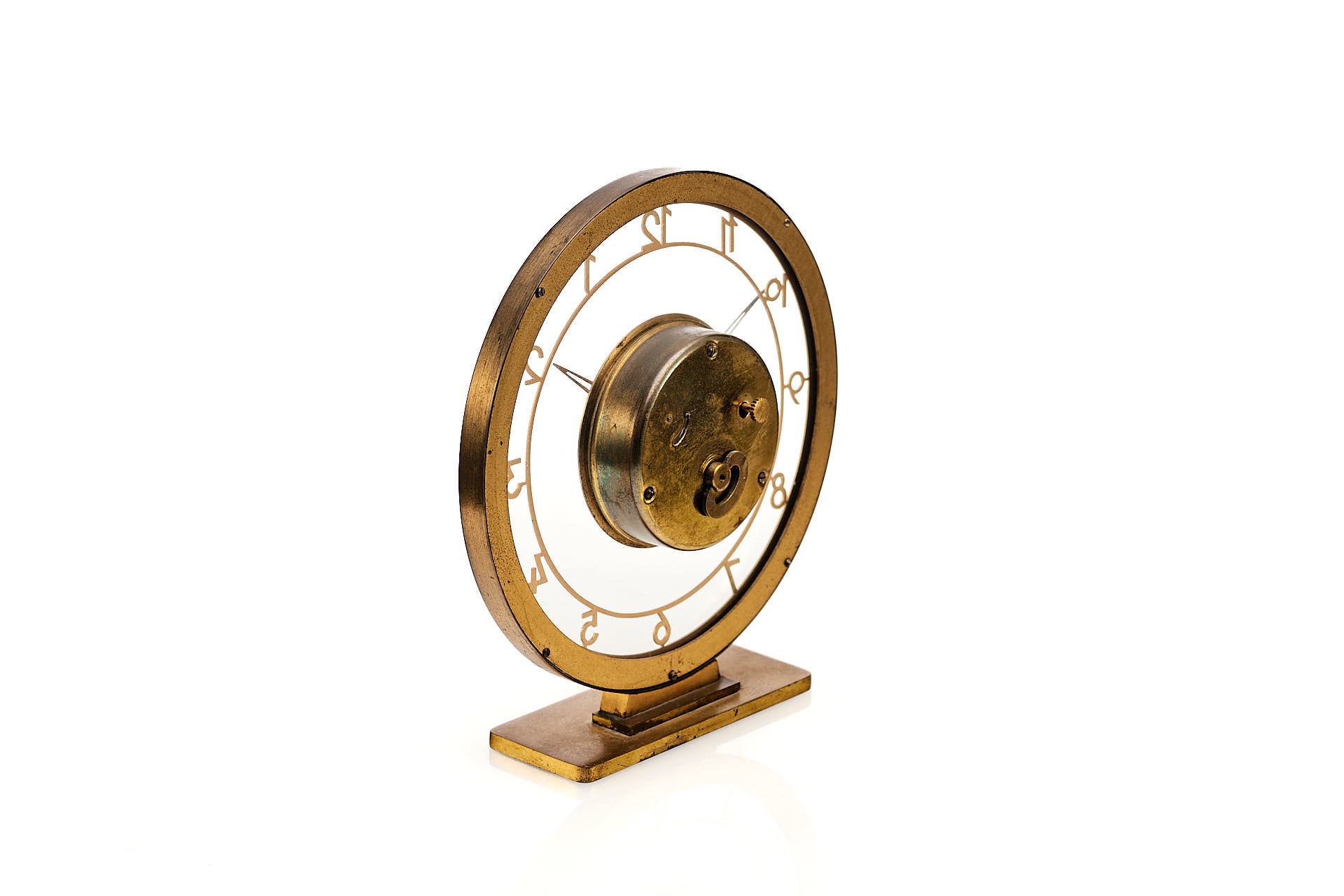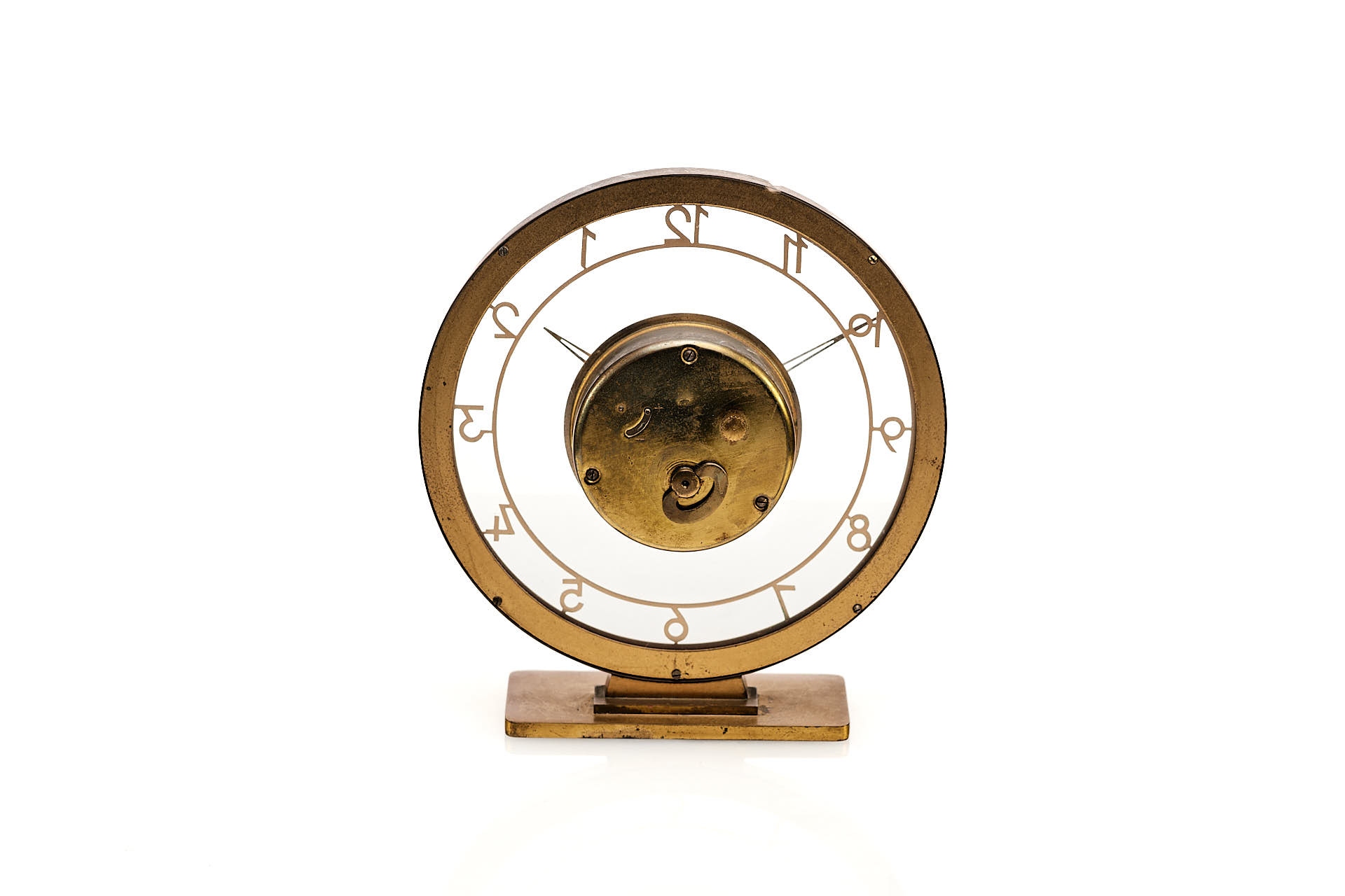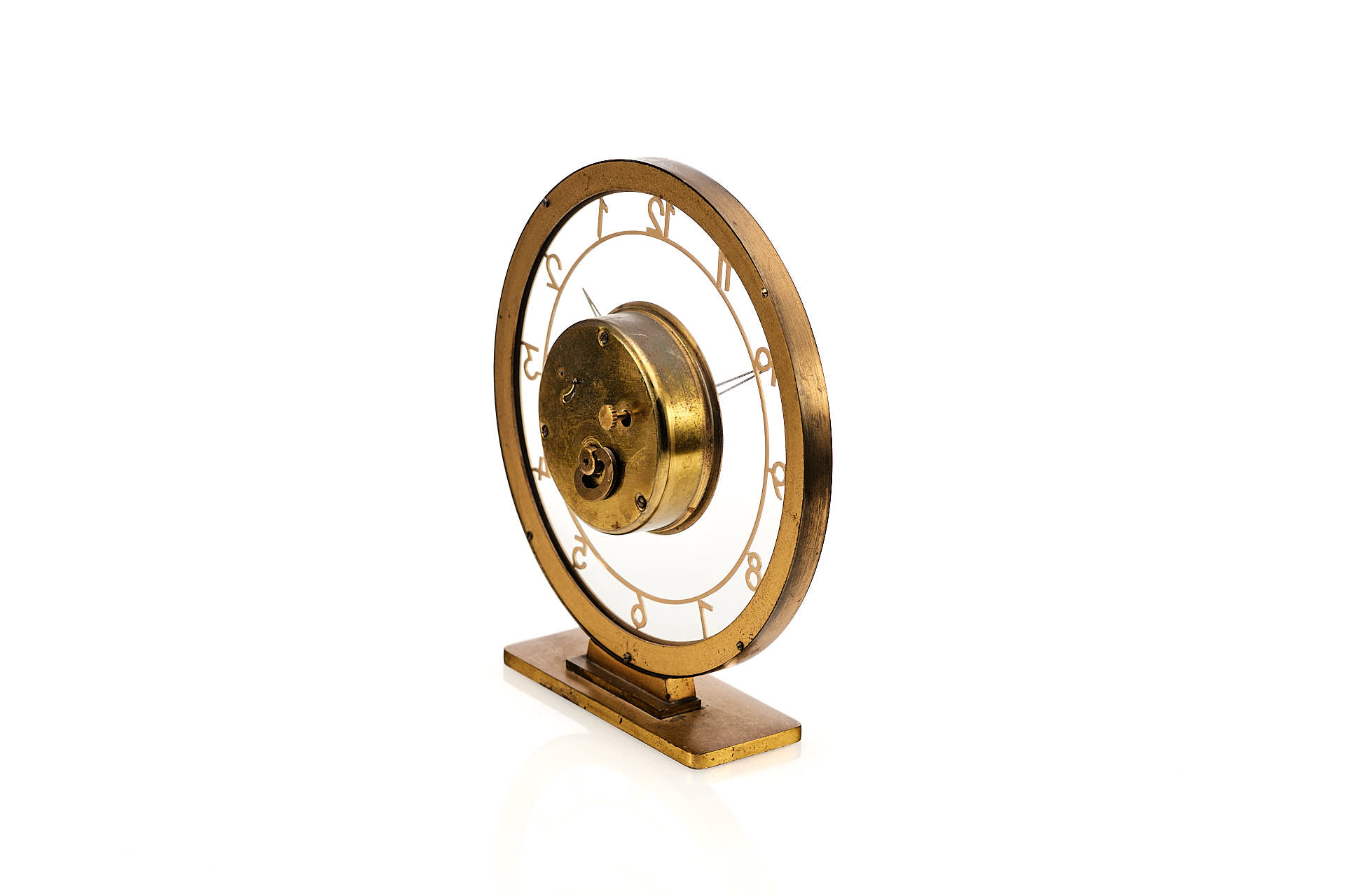 Часы лаконичной формы, на прямоугольной подставке. Круглый циферблат выполнен из стекла и бронзы. По стилю часы