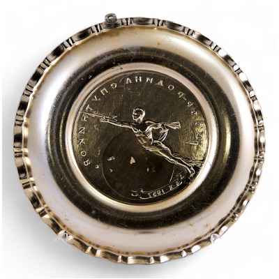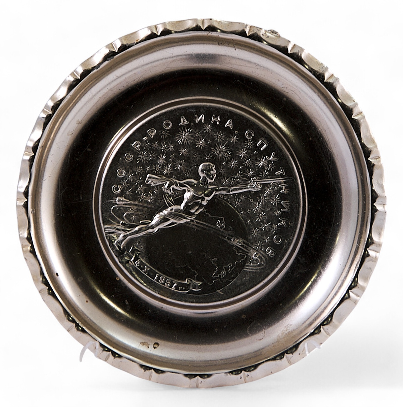 Аллюминевая тарелка в центре которой на фоне звездного неба изображен .летящий по орбите вокруг Земли, покоритель космоса в виде обнаженного греческого бога. В левой руке он держит символическую ракету. По периметру вверху надпись: «СССР - РОДИНА СПУТНИКОВ». Внизу на ленте дата: «4-х-1957» Подобные памятные изделия и сувениры были очень популярны в СССР в период запуска первого искусственного спутника Земли.