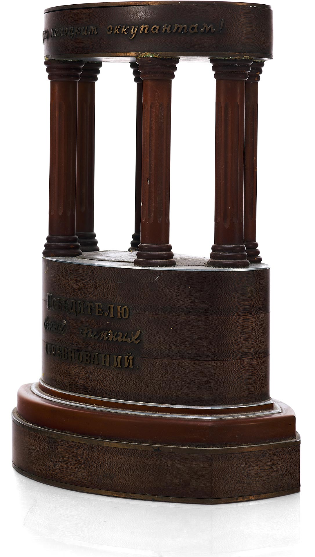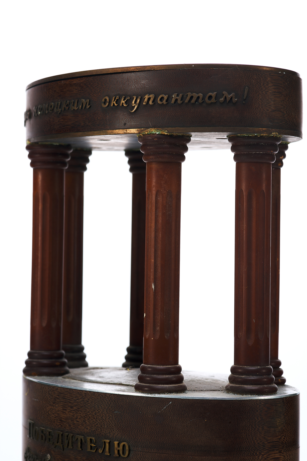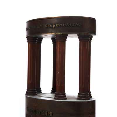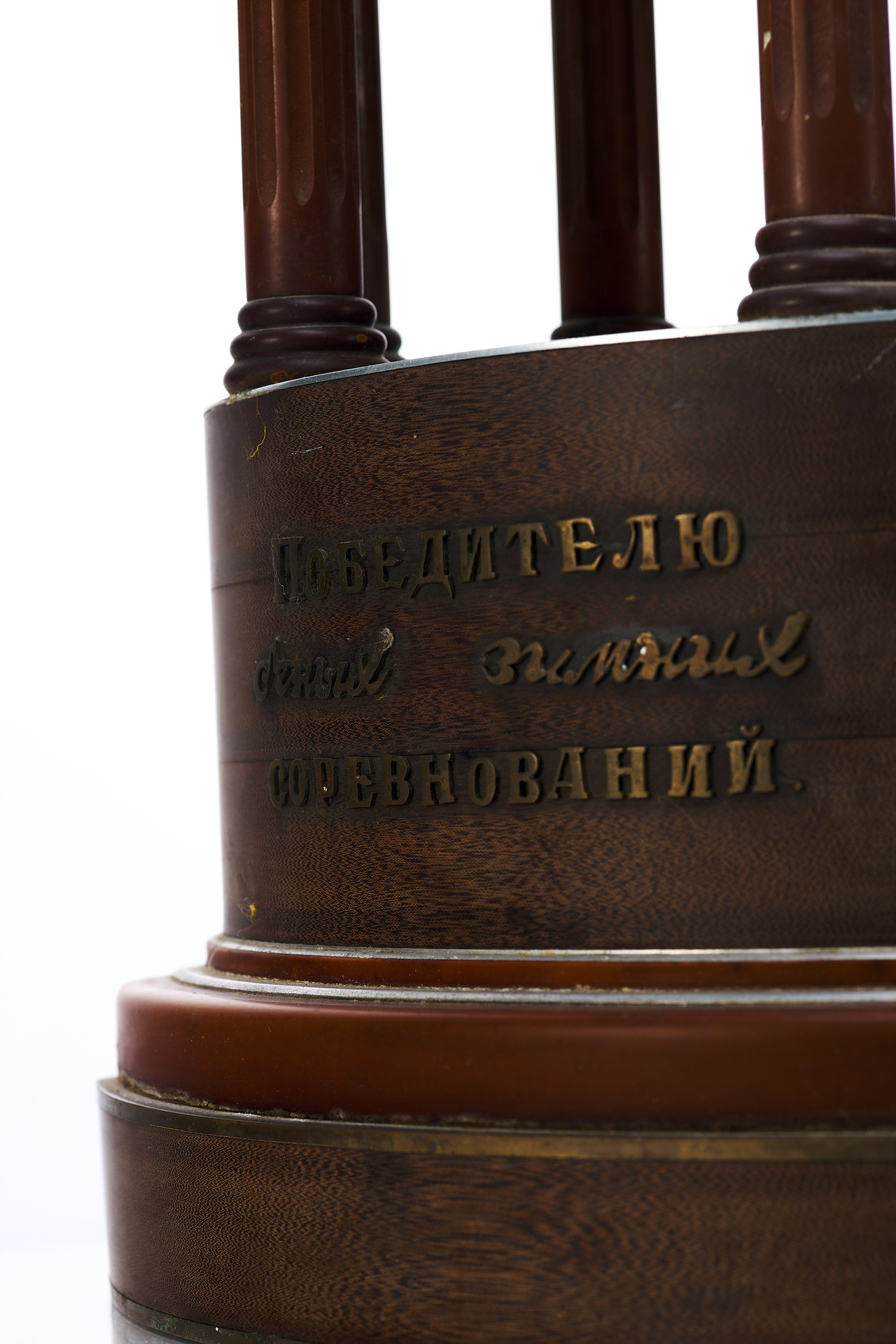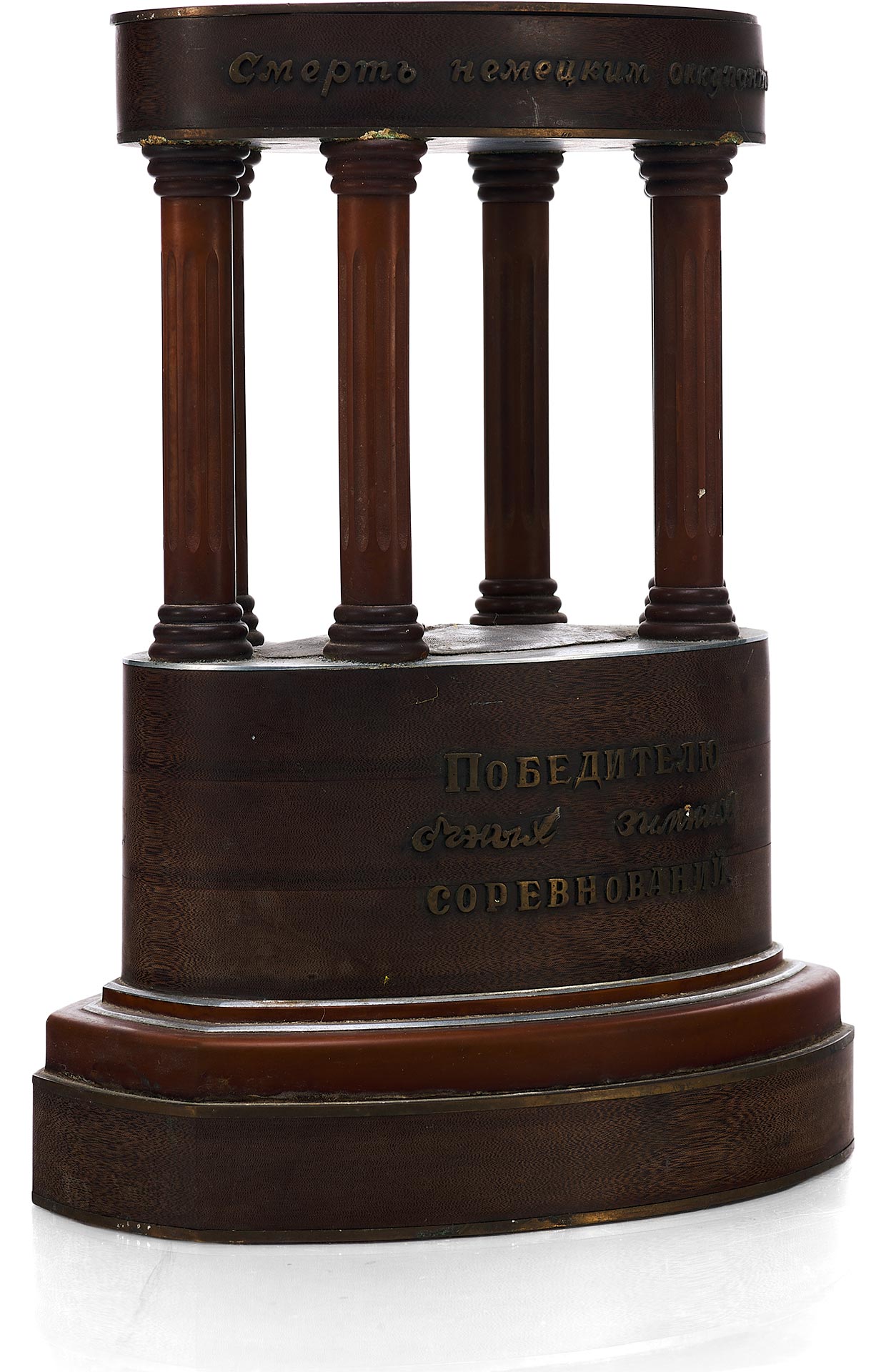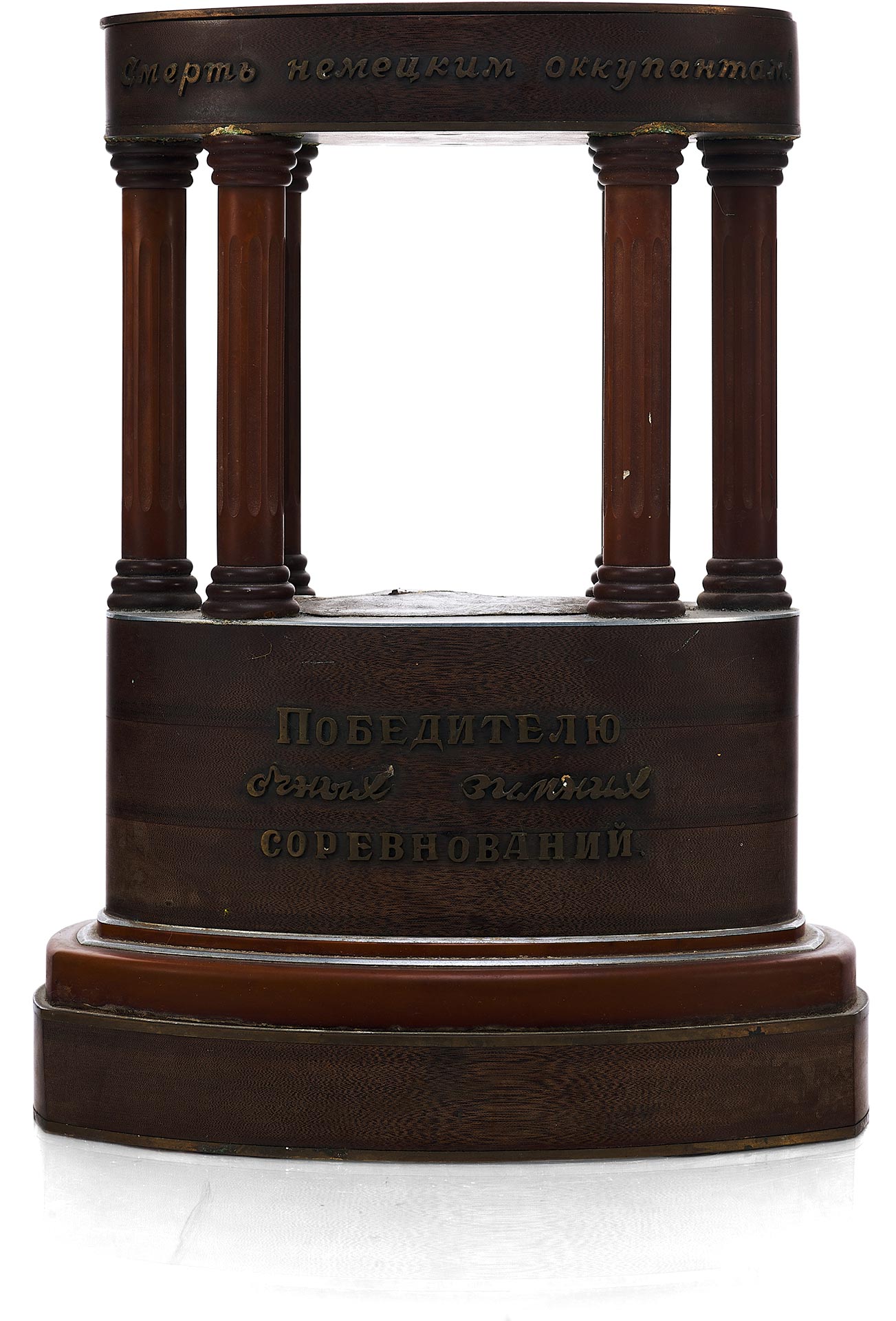 Переходящий приз соцсоревнования в форме классицистической ротонды. Надпись вверху: «Смерть фашистским оккупантам». Внизу: «Победителю очных зимних соцсоревновании ». На оборотной стороне, на медной табличке: «Переходящий приз ВВС УралВО 1943-44 год Латку, 1944-45 г. МВАШП, 1945-1947 ТВАШМ».