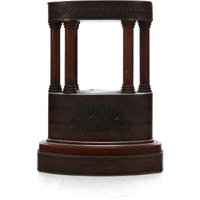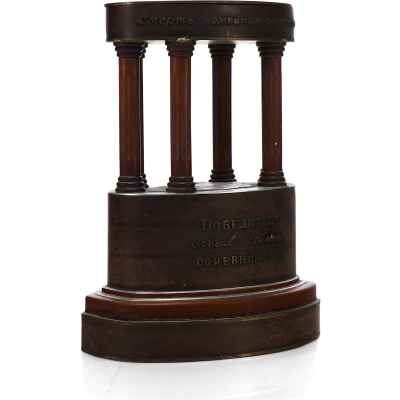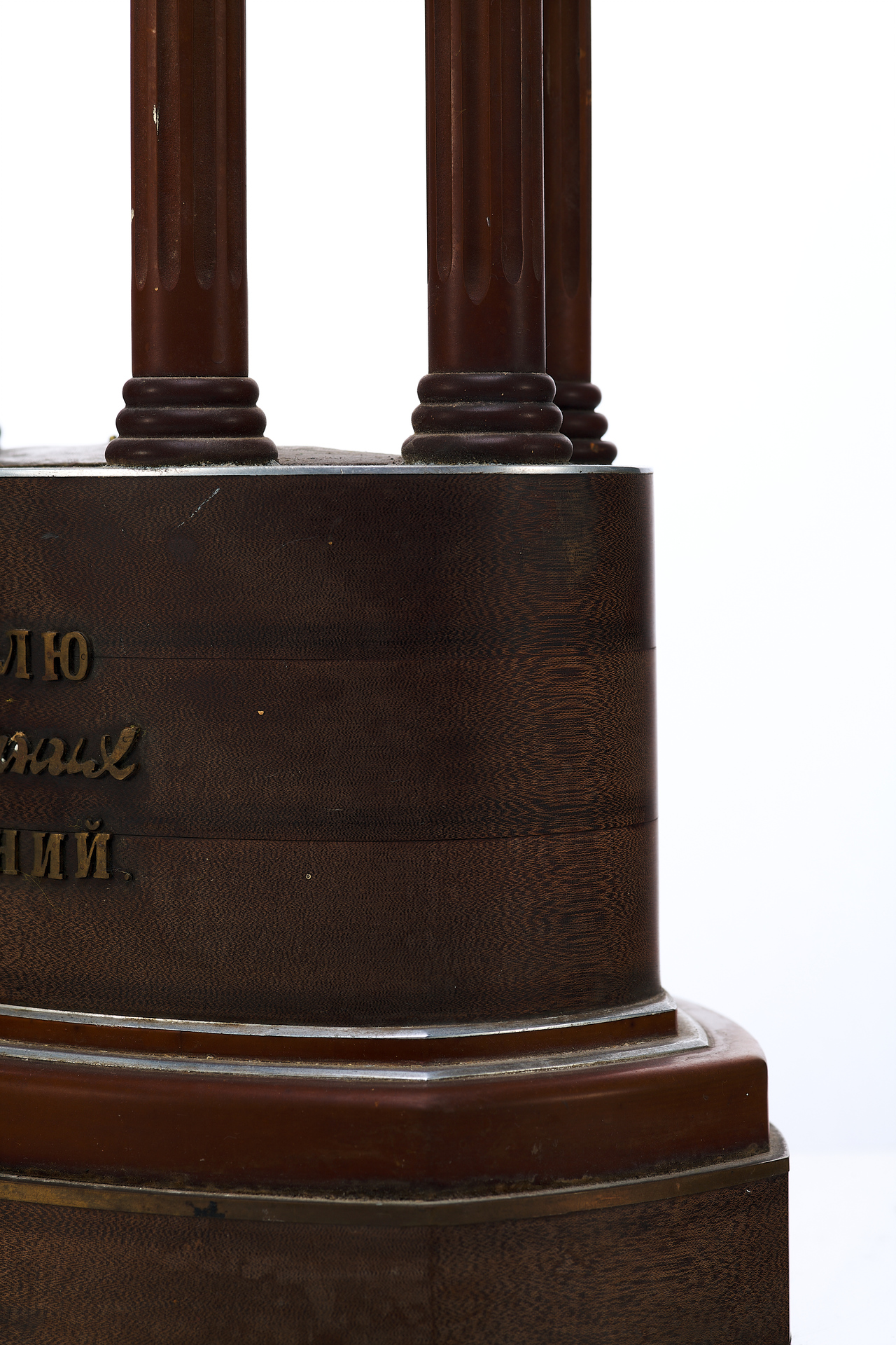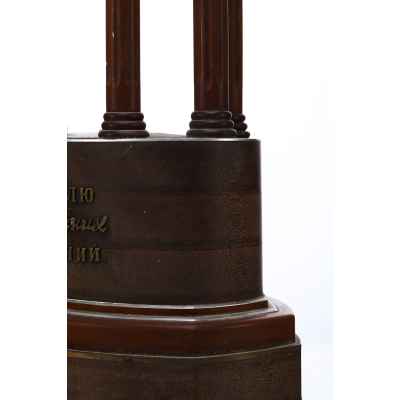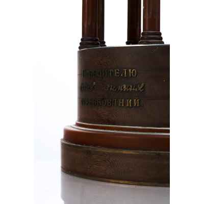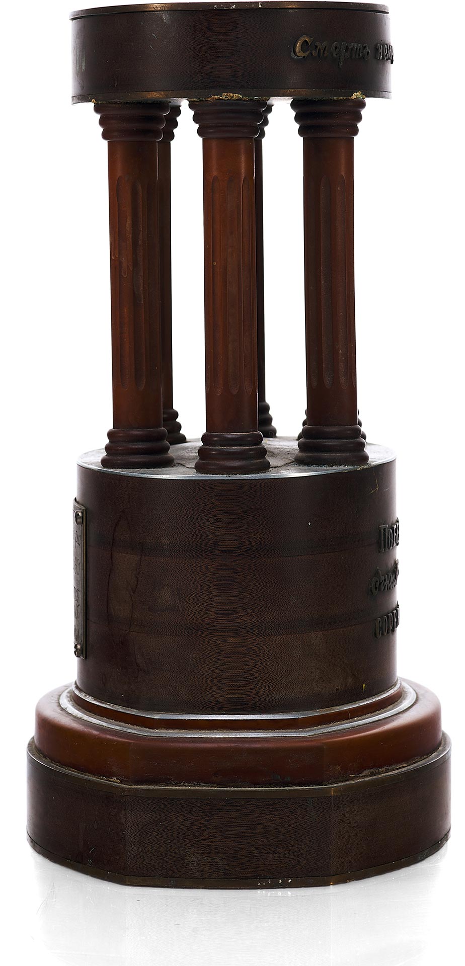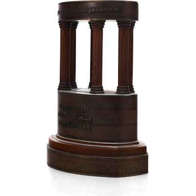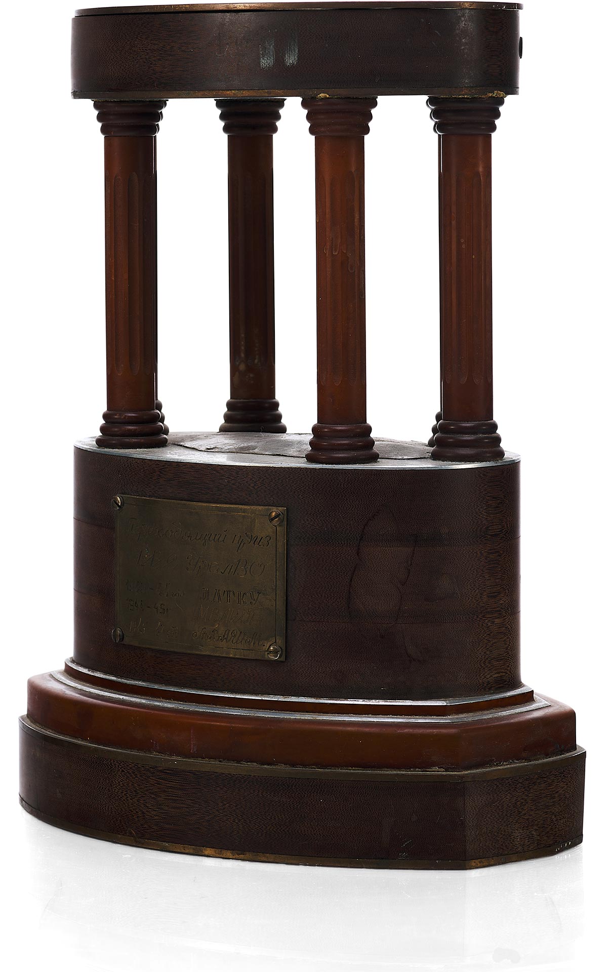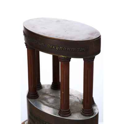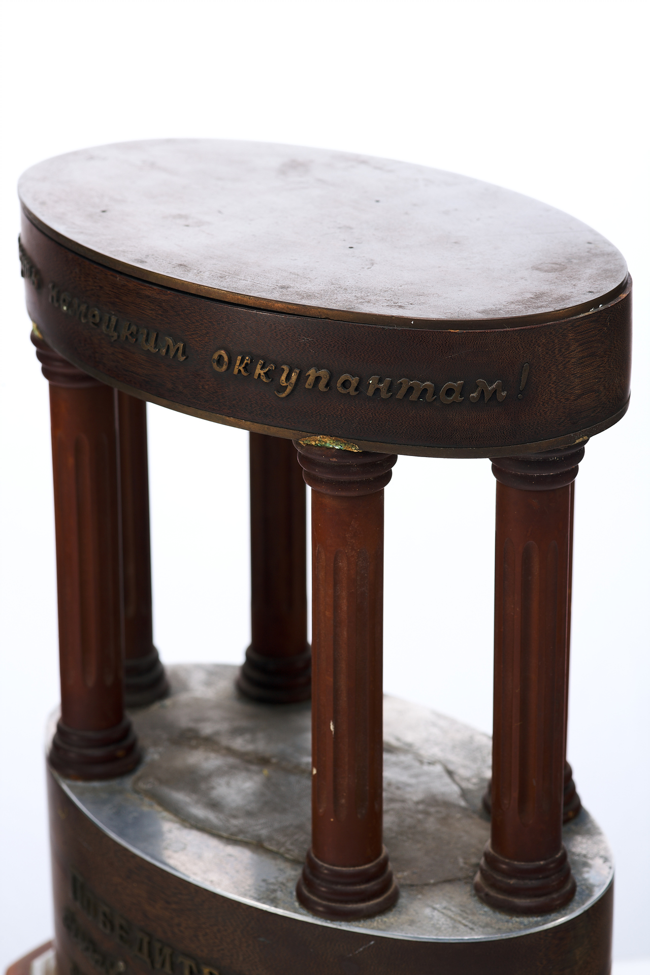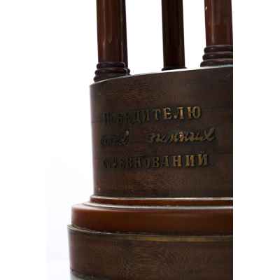 Переходящий приз соцсоревнования в форме классицистической ротонды. Надпись вверху: «Смерть фашистским оккупантам». Внизу: «Победителю очных зимних соцсоревновании ». На оборотной стороне, на медной табличке: «Переходящий приз ВВС УралВО 1943-44 год Латку, 1944-45 г. МВАШП, 1945-1947 ТВАШМ».