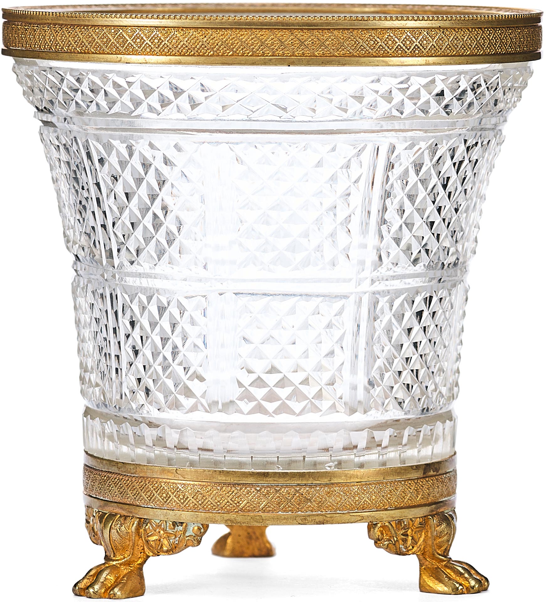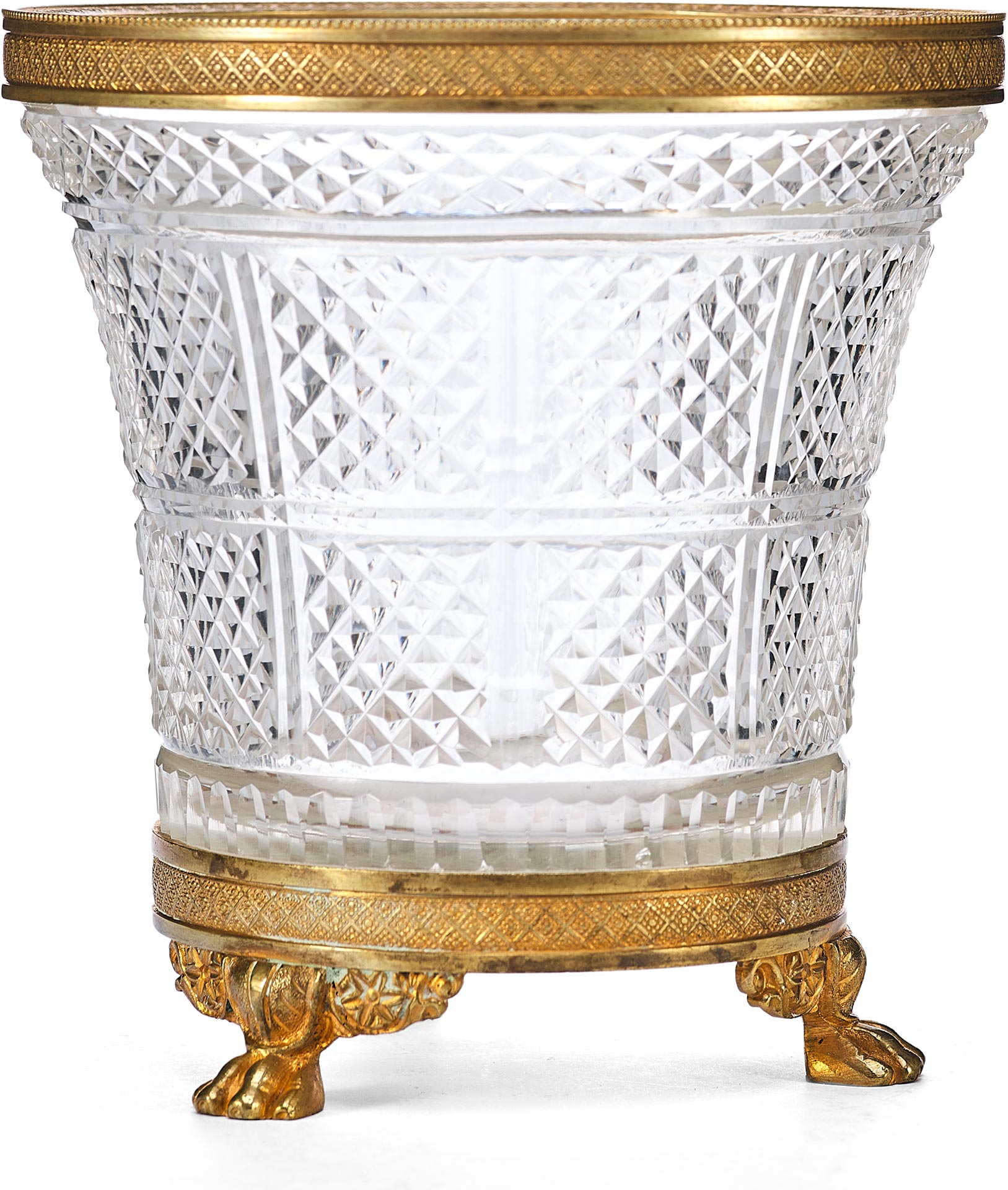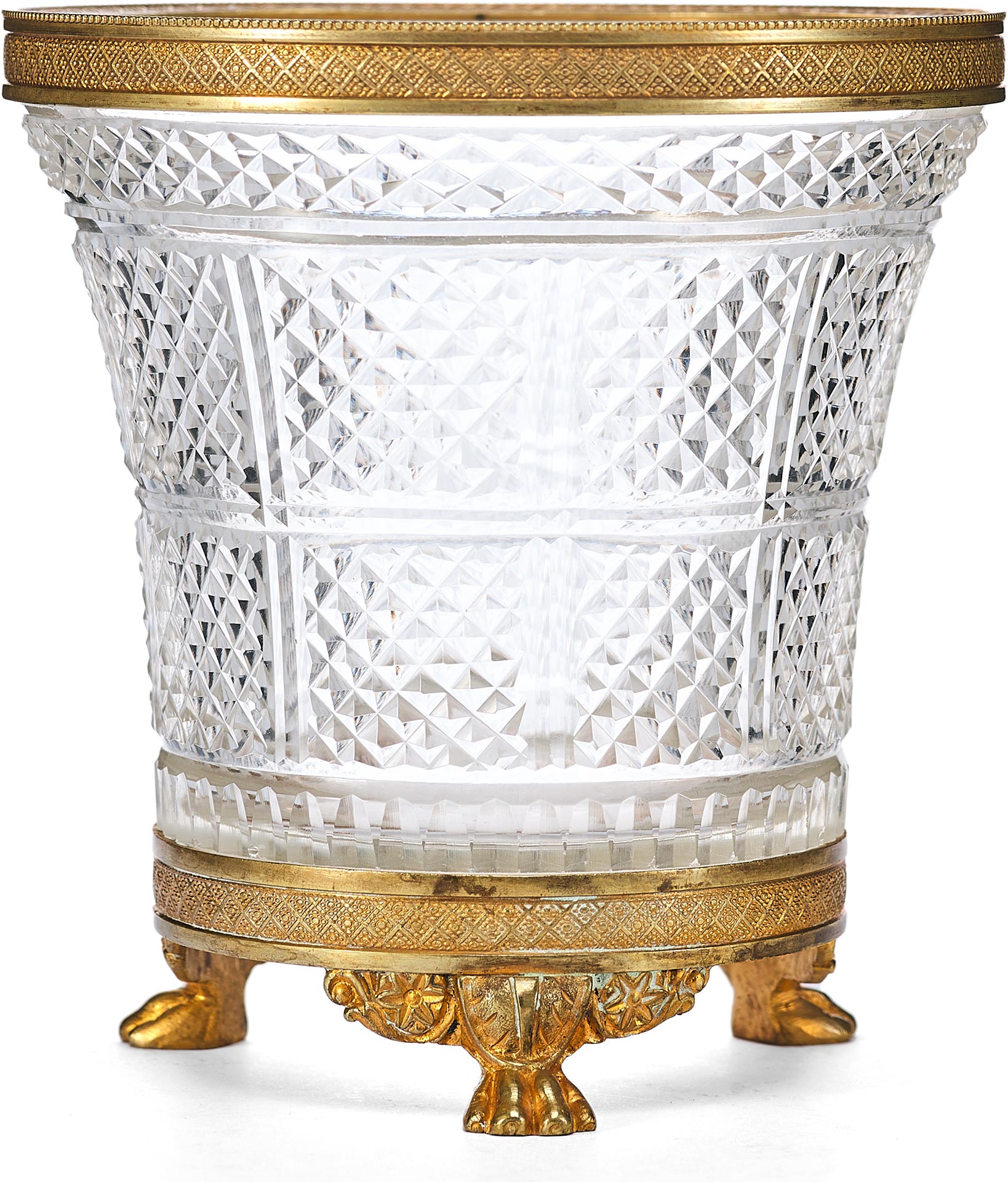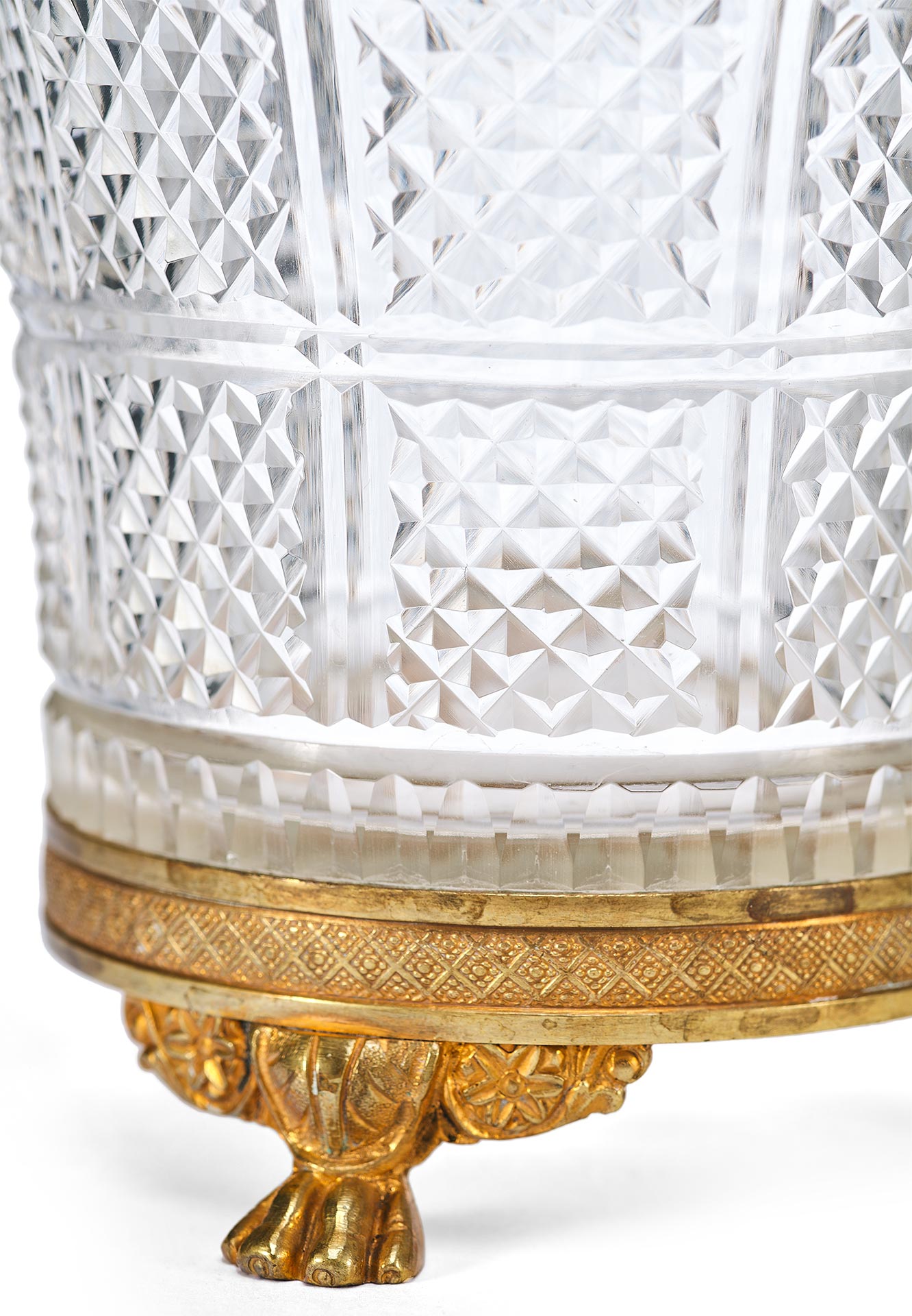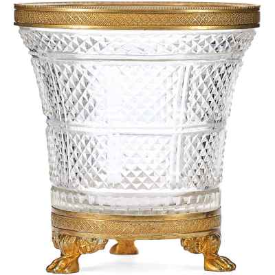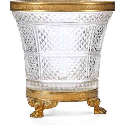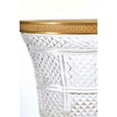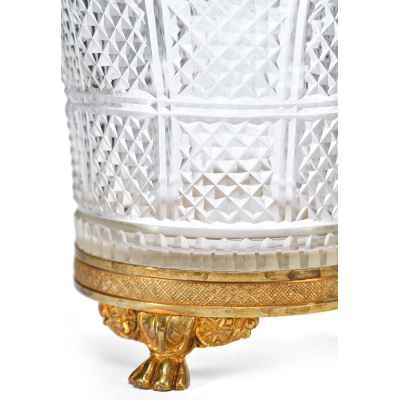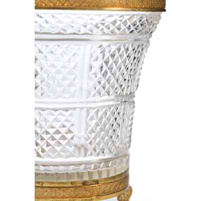 Этот антикварный сосуд в стиле ампир, датируемый концом XIX – началом XX века, представляет собой образец европейского декоративно-прикладного искусства, вдохновленного классическими традициями. Ваза выполнена из хрусталя с характерным диагональным зернистым гранением, придающим поверхности особую игру света. Обрамление в виде бронзовой каймы и массивного основания подчеркивает торжественность и монументальность, свойственные стилю ампир.
