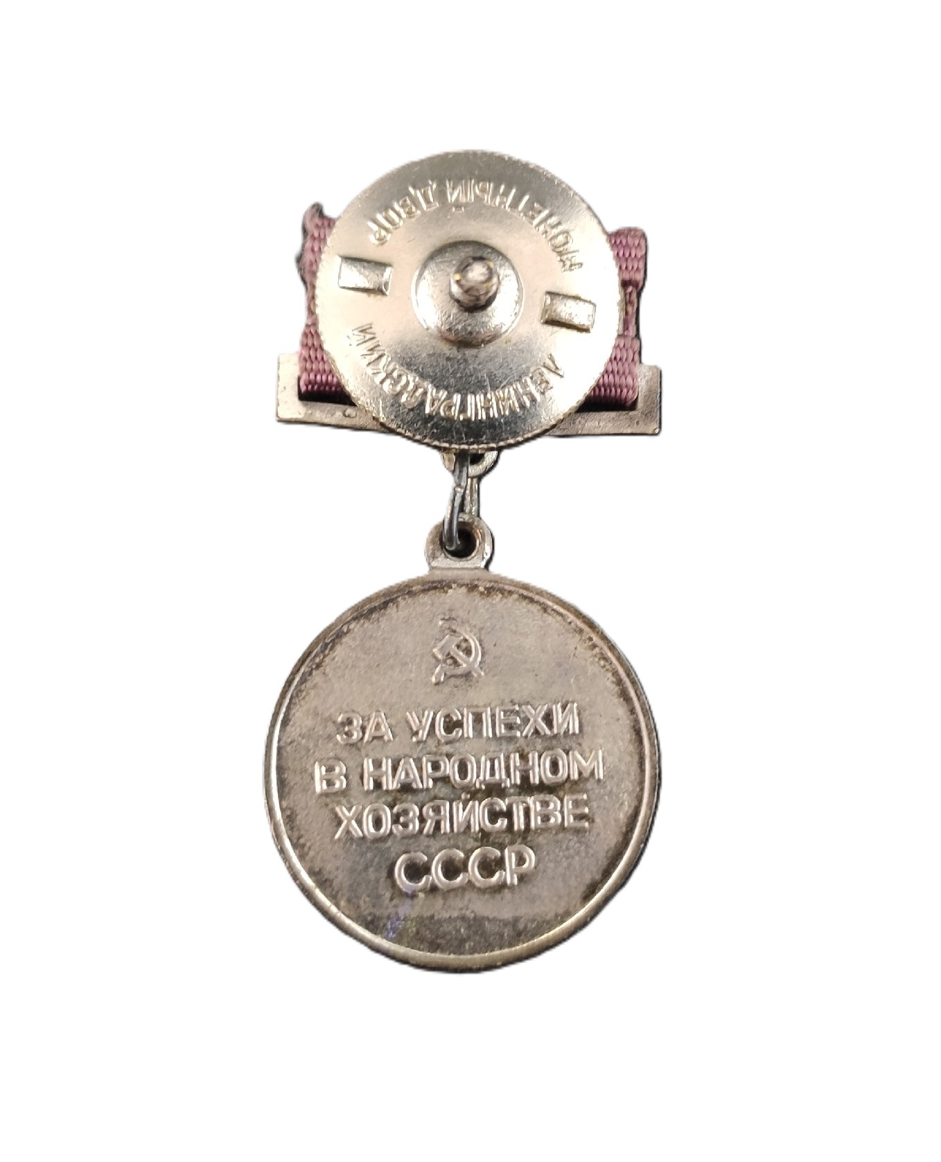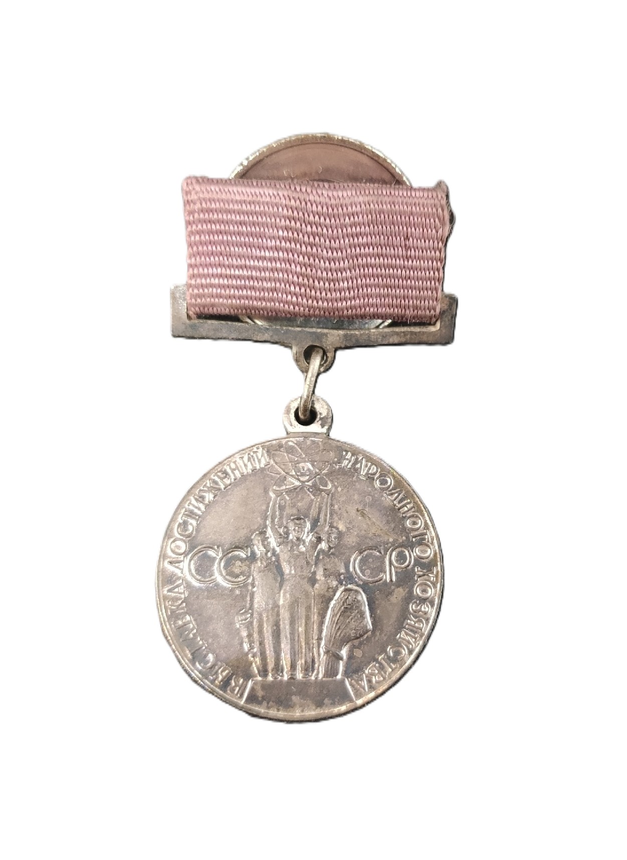«Серебряная» медаль выставки достижений народного хозяйства. Медаль крепится на штифте, на который накручивается гайка. На гайке надпись: «Ленинградский монетный двор». Выставка достижений народного хозяйства была открыта в 1959 г. после объединения всесоюзной сельскохозяйственной выставки, промышленной и строительной выставки. Для награждения