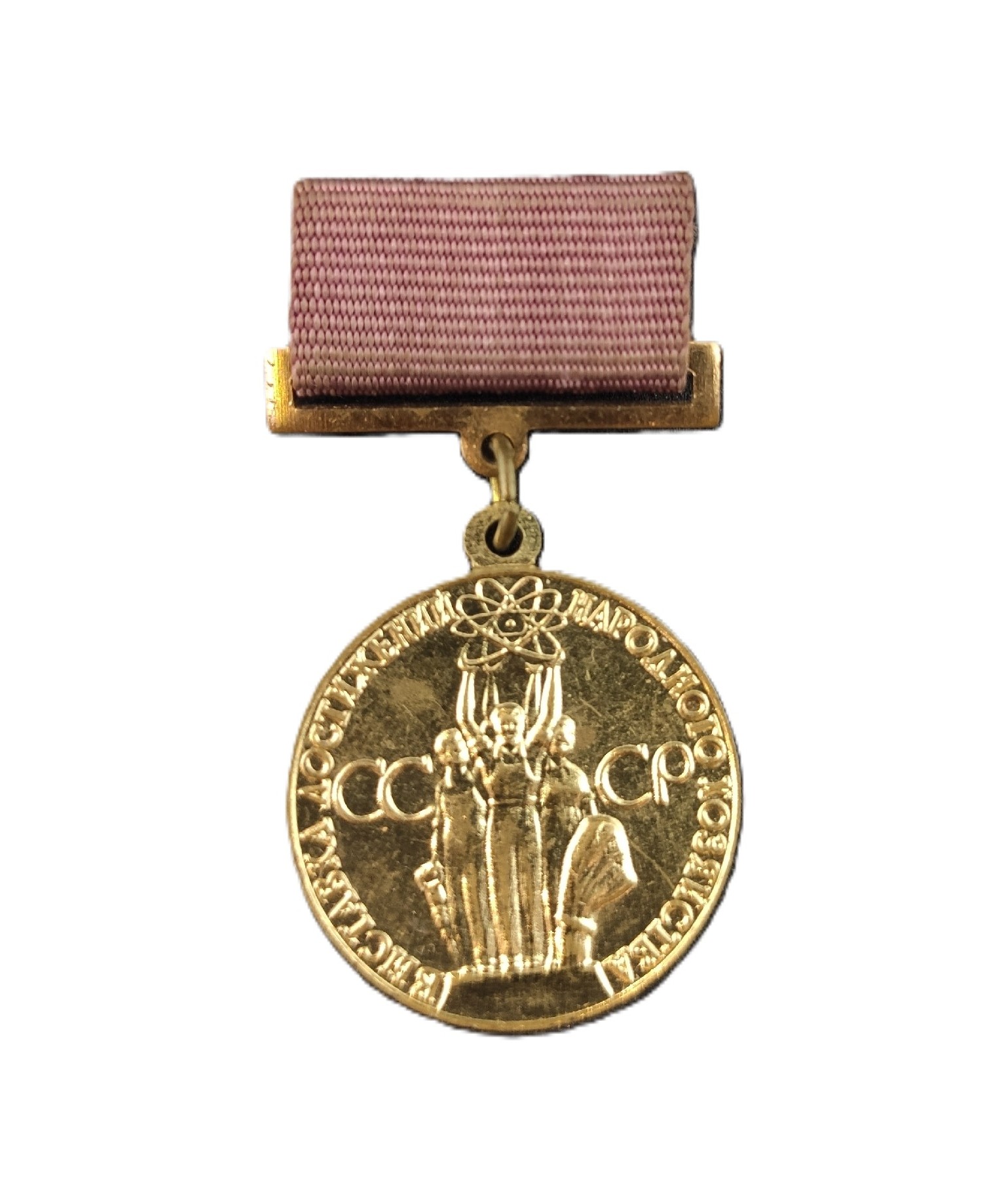 просушествовали до 1963г. С 1963 г. стали выдавать просто "золотая" "серебряная" и "бронзовая". С 1988 г. изменился внешний вид медалей На лицевой стороне по центру помещено изображение скульптурной композиции, символизирующей союз рабочих и крестьян: в центре стоит мужчина в комбинезоне и рубашке с подкатанными выше локтей рукавами, на поднятых вверх руках он удерживает символ мирного атома: чуть позади него стоят мужчина и женщина: мужчина в рабочей одежде с отбойным молотком в правой руке, женщина в платье, левой рукой придерживает стоящий около нее сноп колосьев; левая рука мужчина и правая рука женщина также подняты вверх и держа i "мирный атом". По окружности находится надпись: «ВЫСТАВКА ДОСТИЖЕНИЙ НАРОДНОГО ХОЗЯЙСТВА». Реверс: На оборотной стороне по центру выполена надпись: "ЗА