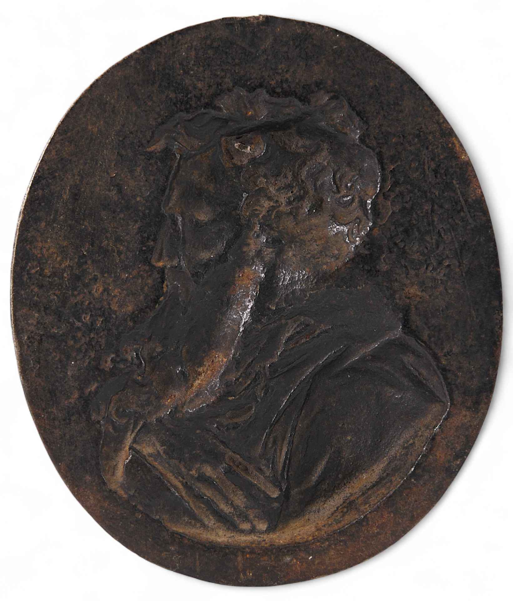 На гладкой овальной пластине рельефное, погрудное. профильное (вправо) изображение пожилого мужчины в тоге, с кудрявыми волосами и бородой. Кисть правой руки прижата к груди.