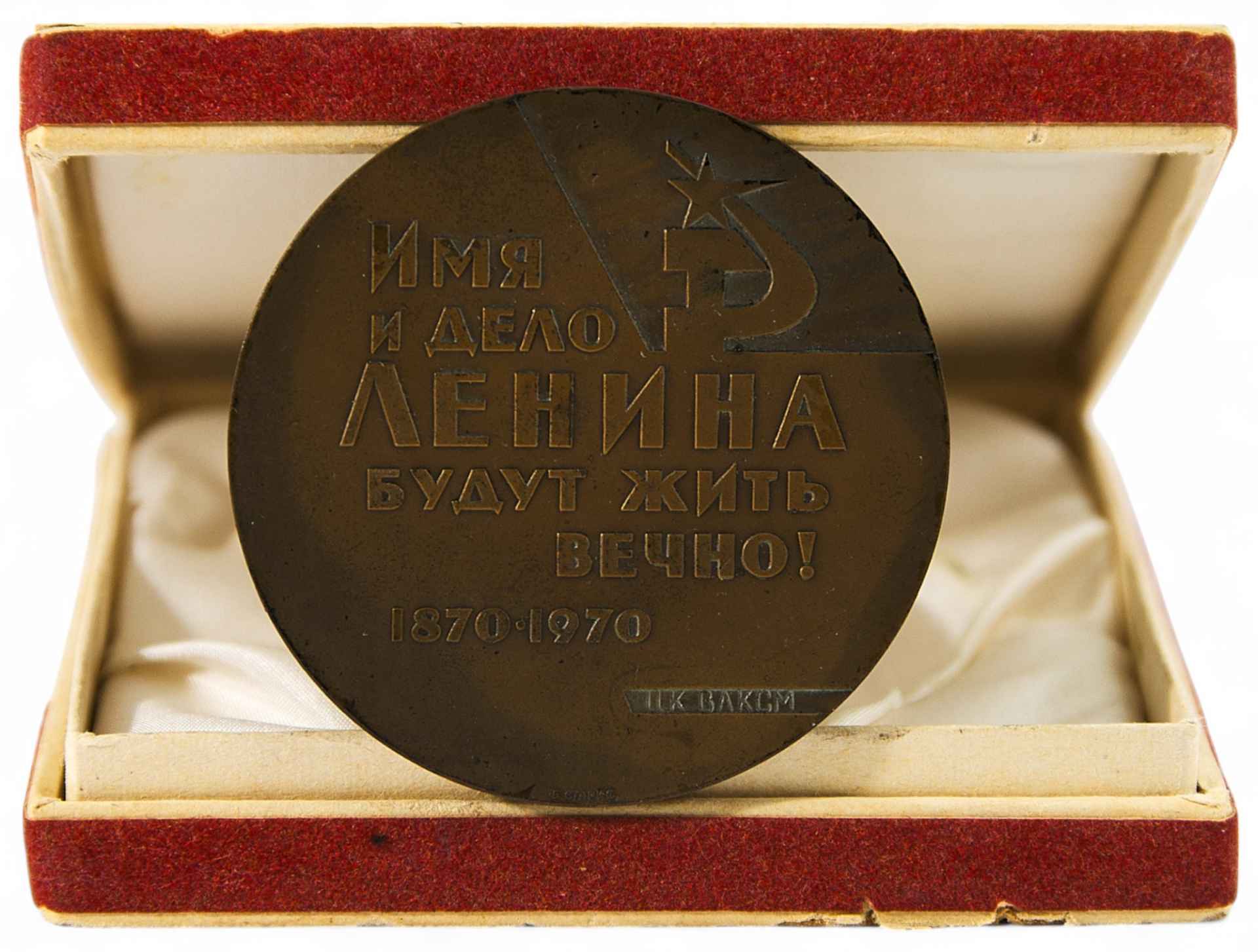 героизированными чертами в его изображении. На обороте надпись на : «Имя и дело Ленина будут жить вечно! 18701970 / ЦК ВСЛКСМ». В правом верхнем углу символ коммунистической партии - серп и молот. Эта медаль вручалась делегатам съезда ВЛКСМ.