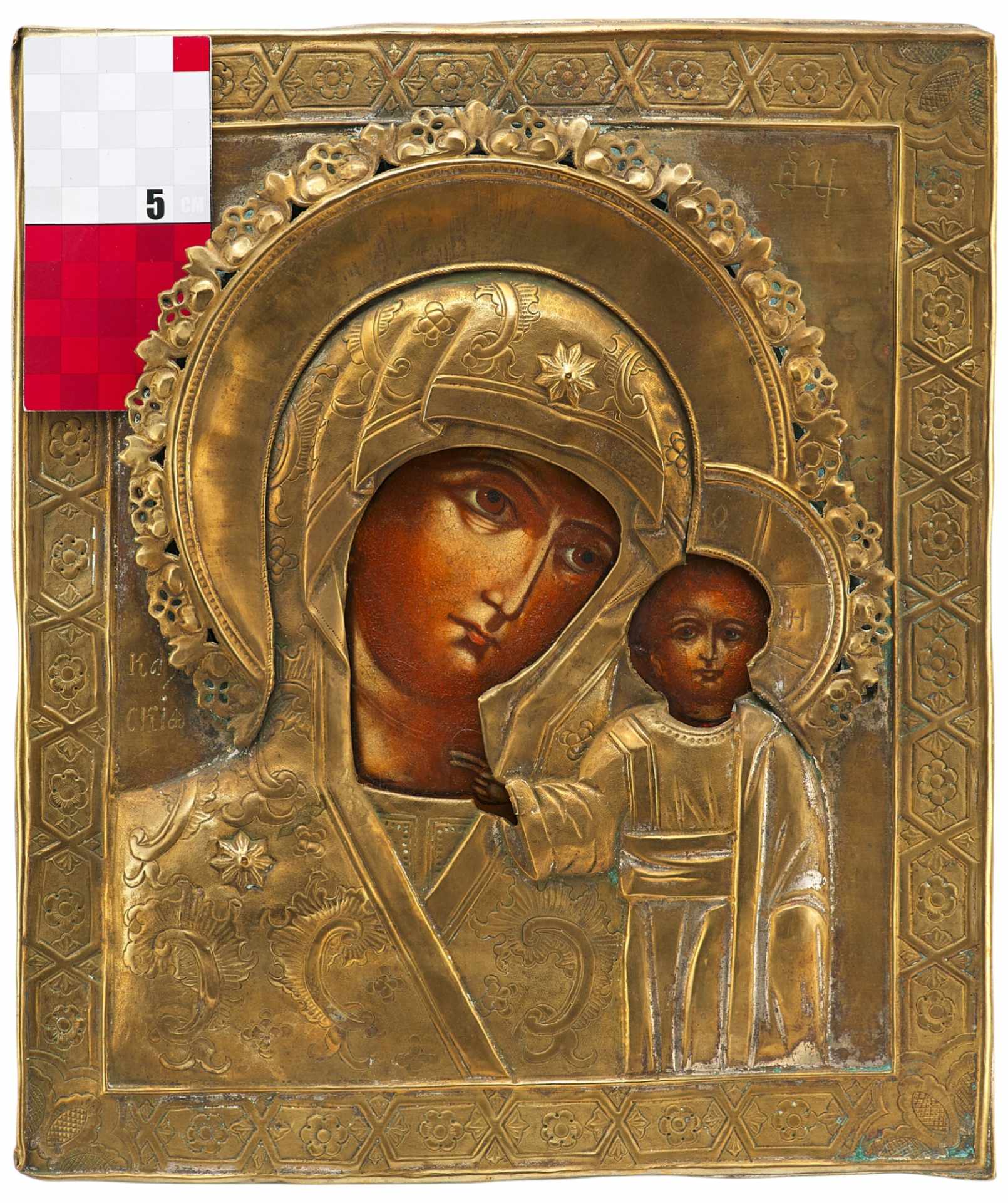 Икона в окладе Богоматерь Казанская масло, латунь, кон. XIX в. 31x26,3x2,9 см. Конец XIX века