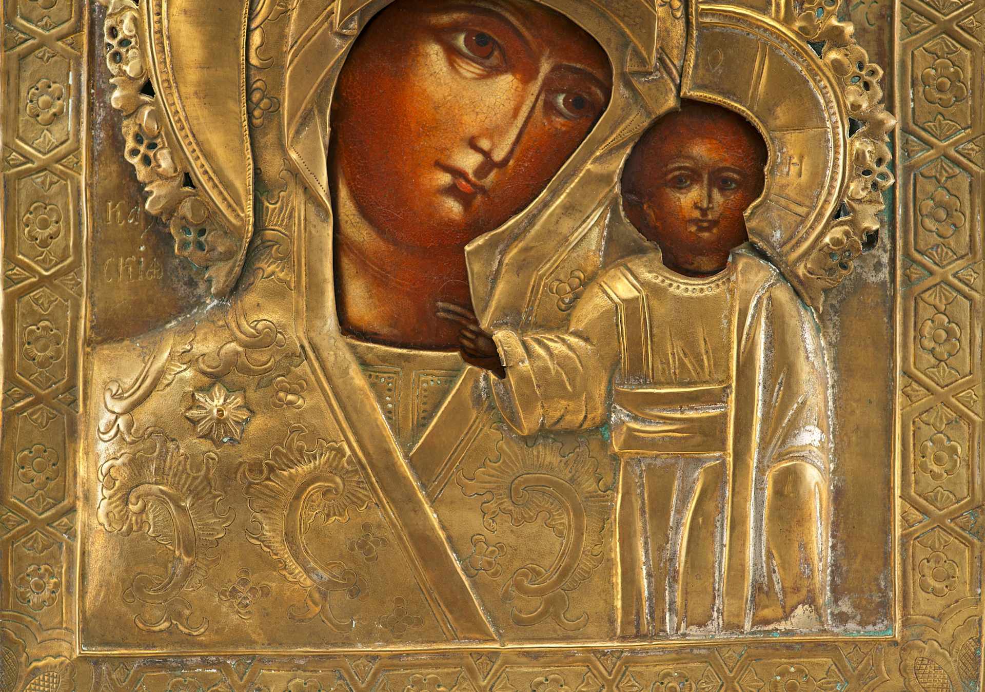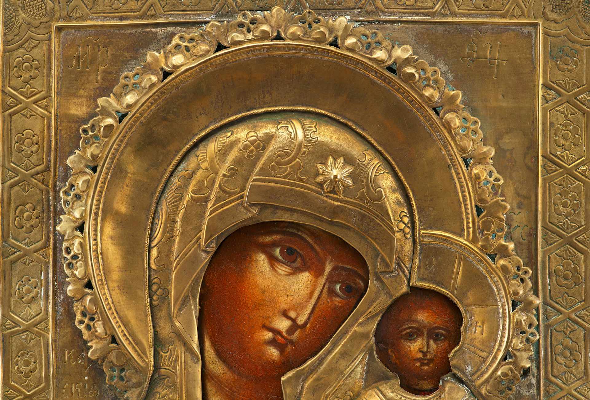 На иконе - Богоматерь и поколенное изображение младенца Христа. Богоматерь Казанская одна из наиболее почитаемых на Руси икон Божией Матери. Чудесное явление этой иконы совершилось в Казани в июле 1579 г. С чудотворной иконы по указанию архиепископа сделали список и отослали в том же году вместе с описанием ее явления и чудес в Москву, к царю Иоанну Грозному. Почитание этого образа усилилось после освобождения Москвы от польско-литовских захватчиков в 1612 г. это событие было приписано заступничеству иконы, принесенной народным ополчением и находившейся в стане князя Димитрия Пожарского. В 1710 году. По повелению Петра Первого икона из Казани перенесена в Санкт-Петербург, ас 1811 г. находилась в Казанском соборе.