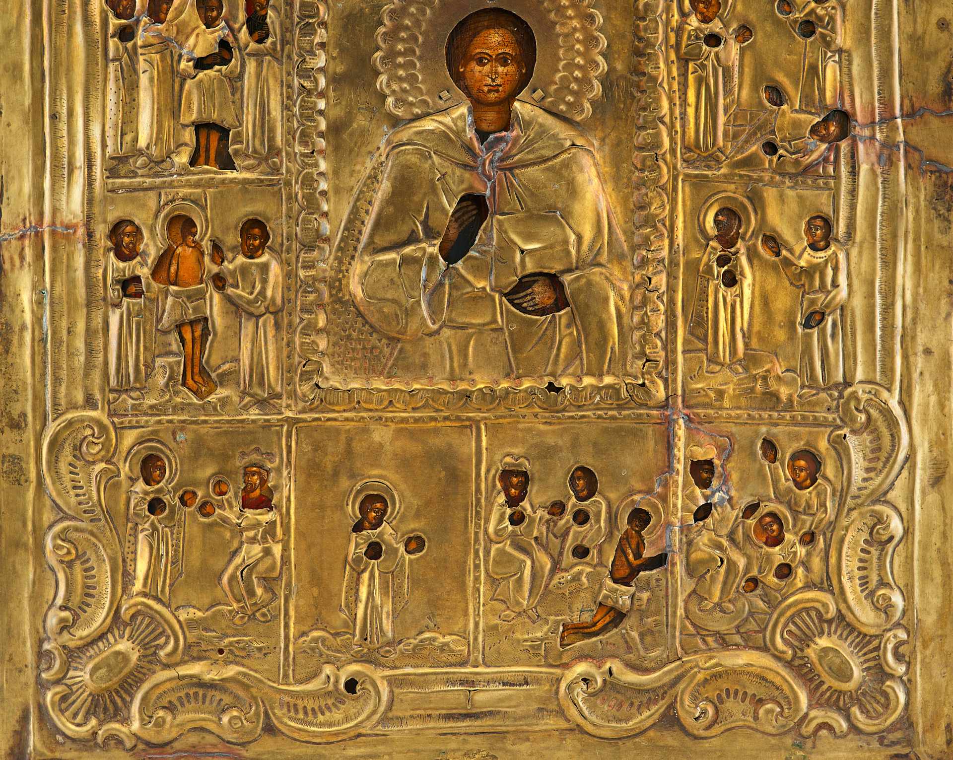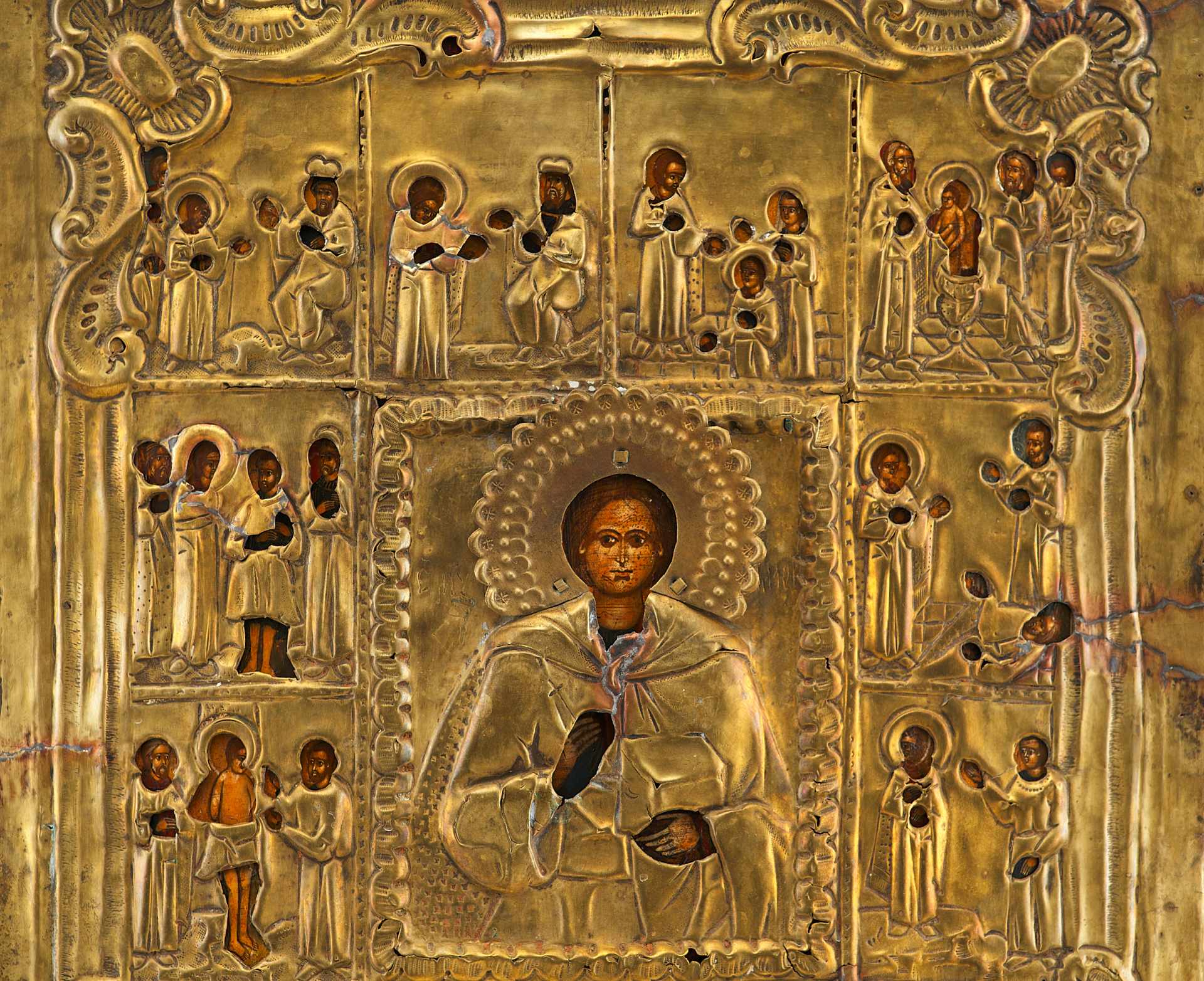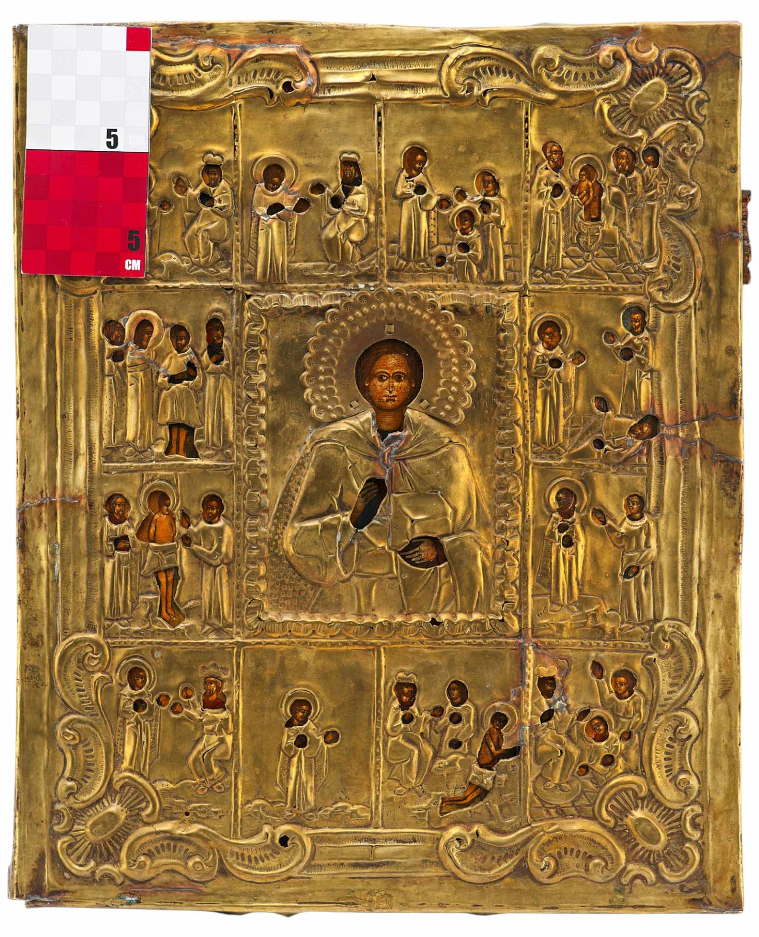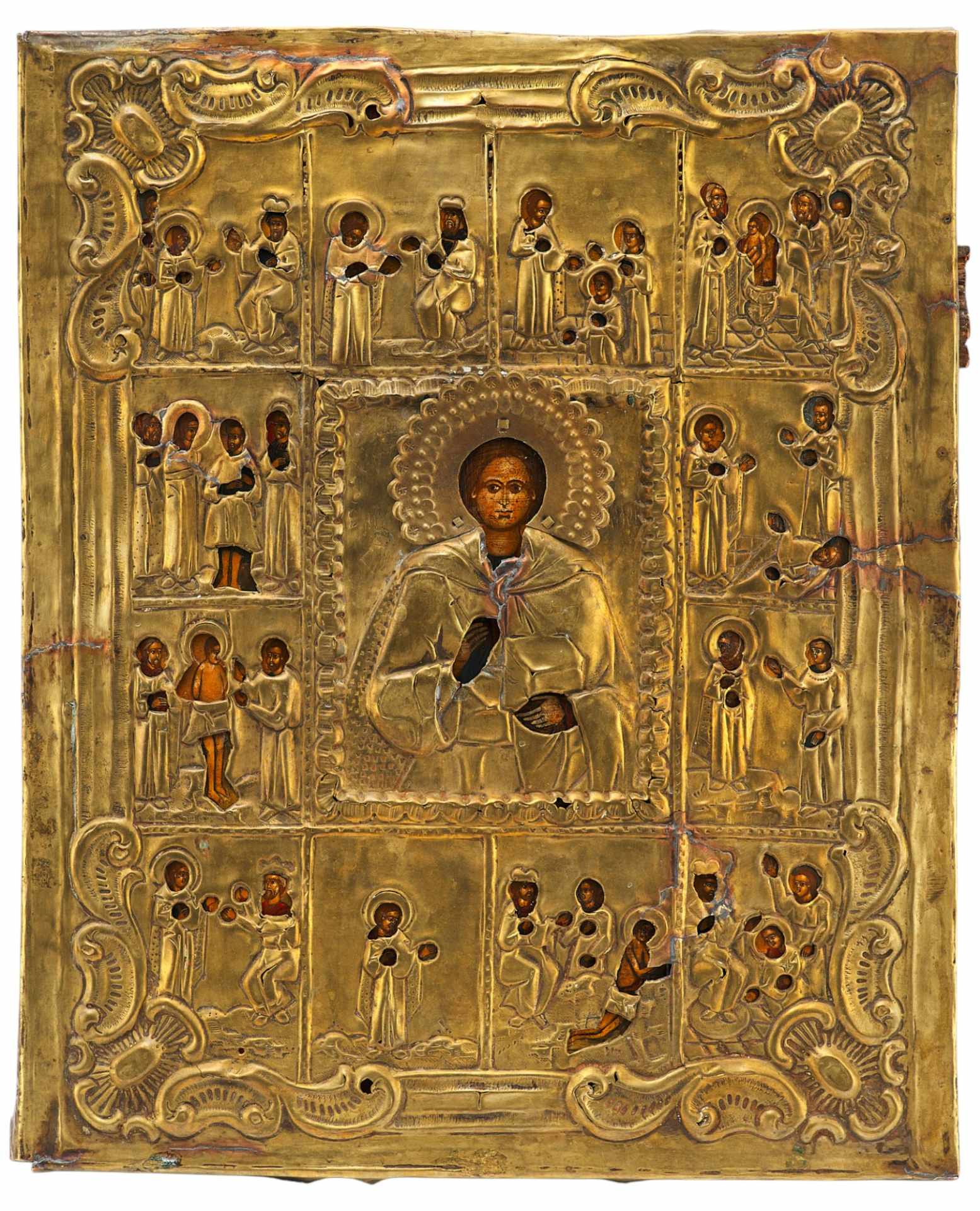 Икона Пантелеймон Целитель в житие масло латунь кон. XIX в. 36x30x2.5 см. Россия Последняя четверть XIX века