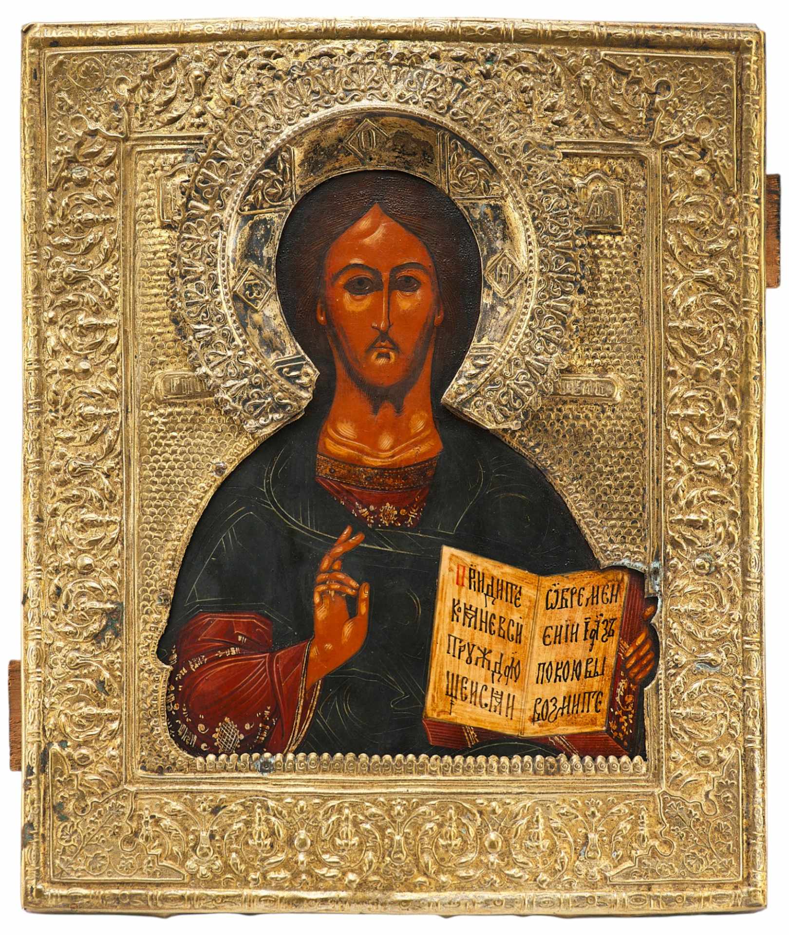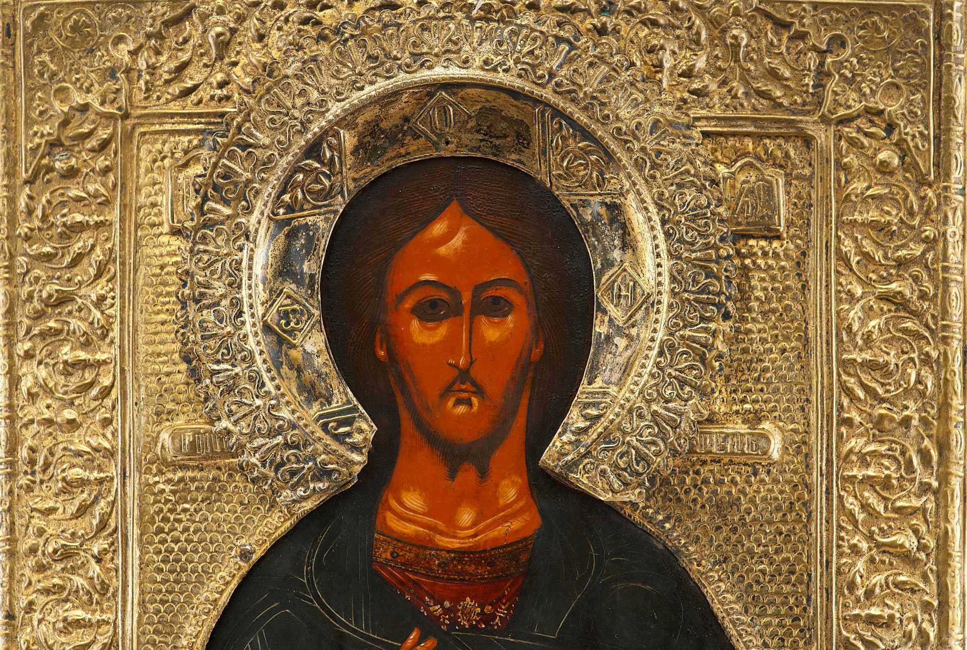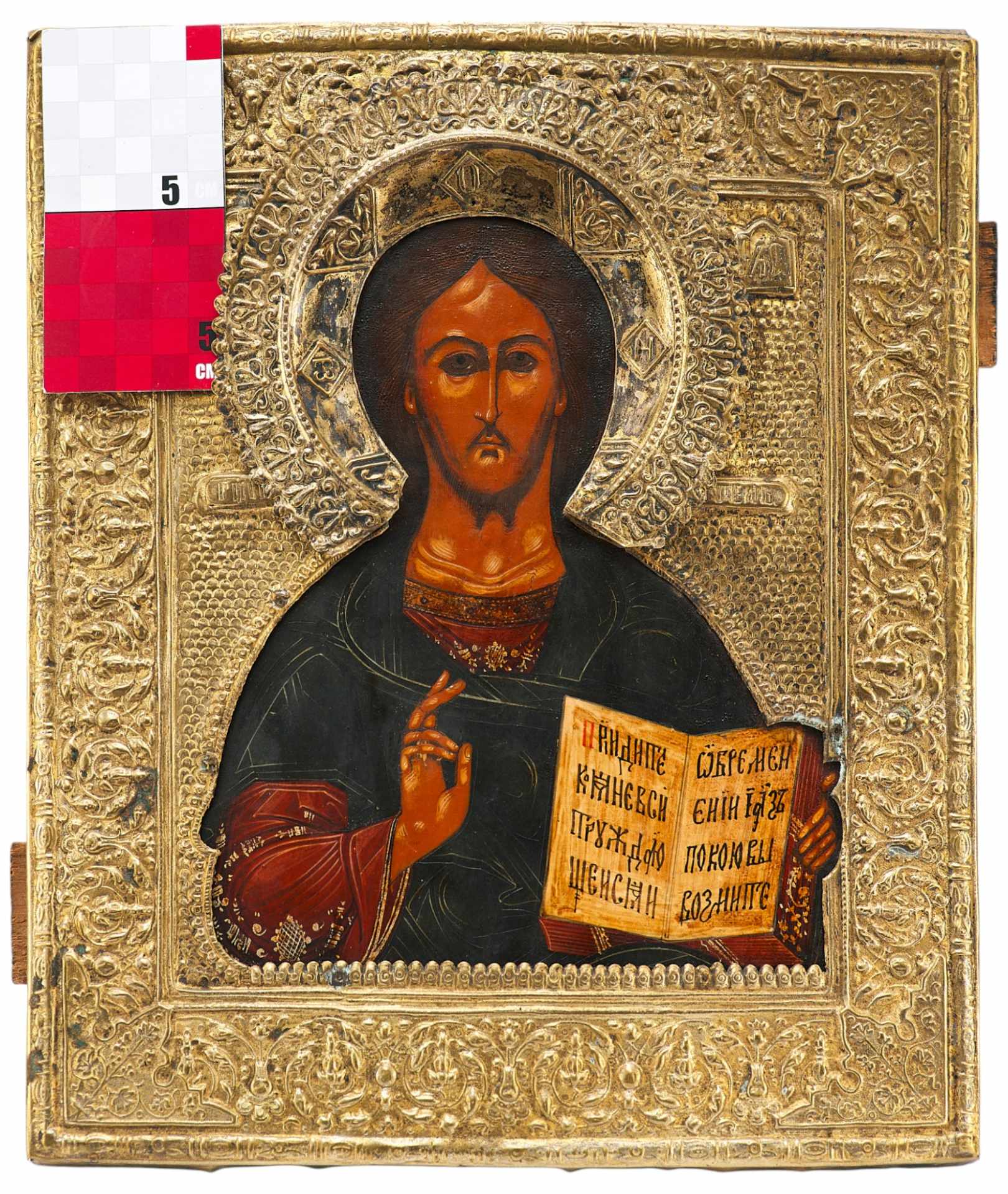 Икона Господь Вседержитель темпера, латунь кон. XIX в. 31,5x26x2 см. конец ХІХ в