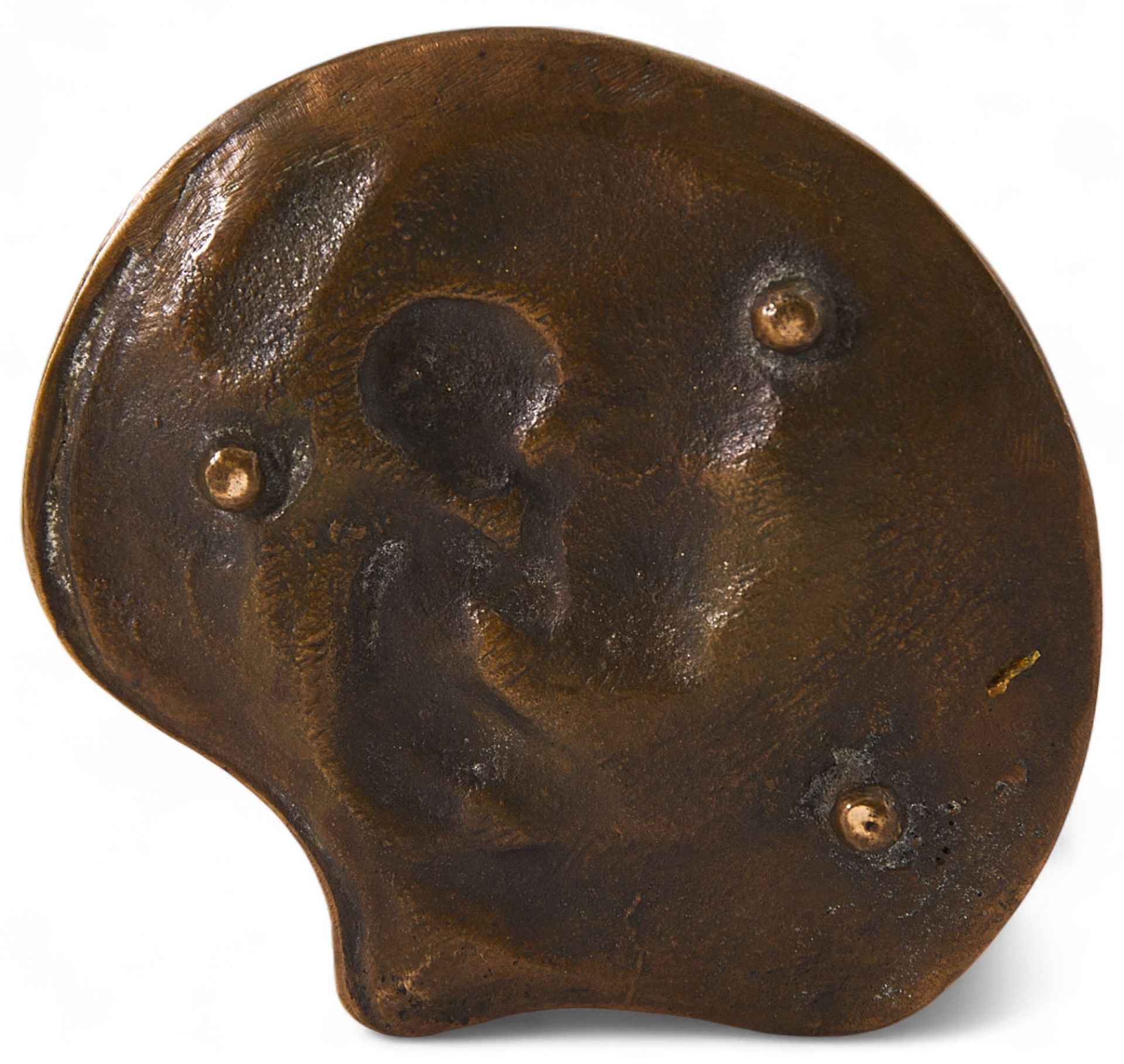 На овальной пластине рельефное профильное изображение головы женщины. Рукой она держит цветок и вдыхает его аромат. На плече у женщины сидит амур и что-то нашёптывает ей на ухо. Её густые вьющиеся волосы красивой волной окаймляют плечи.