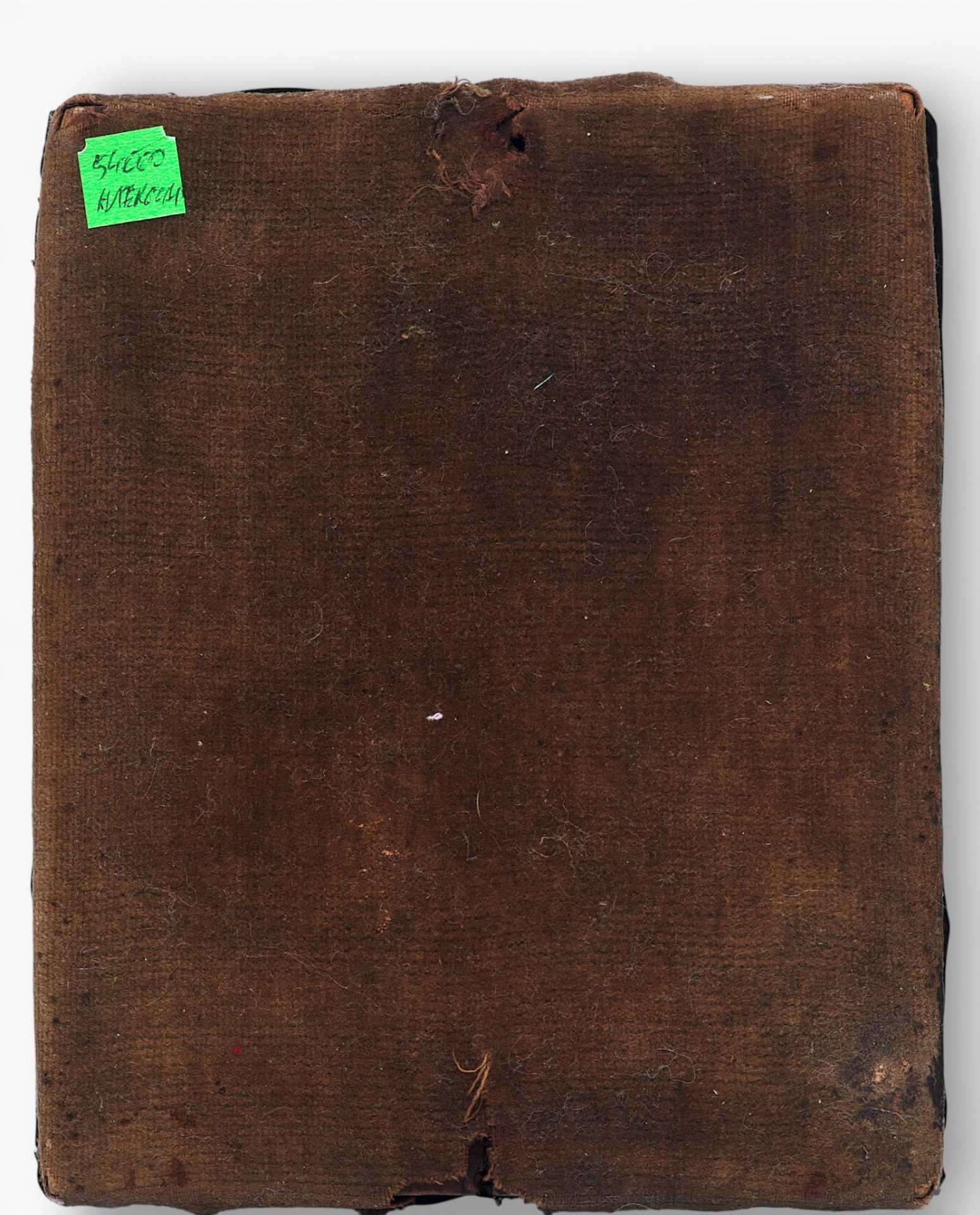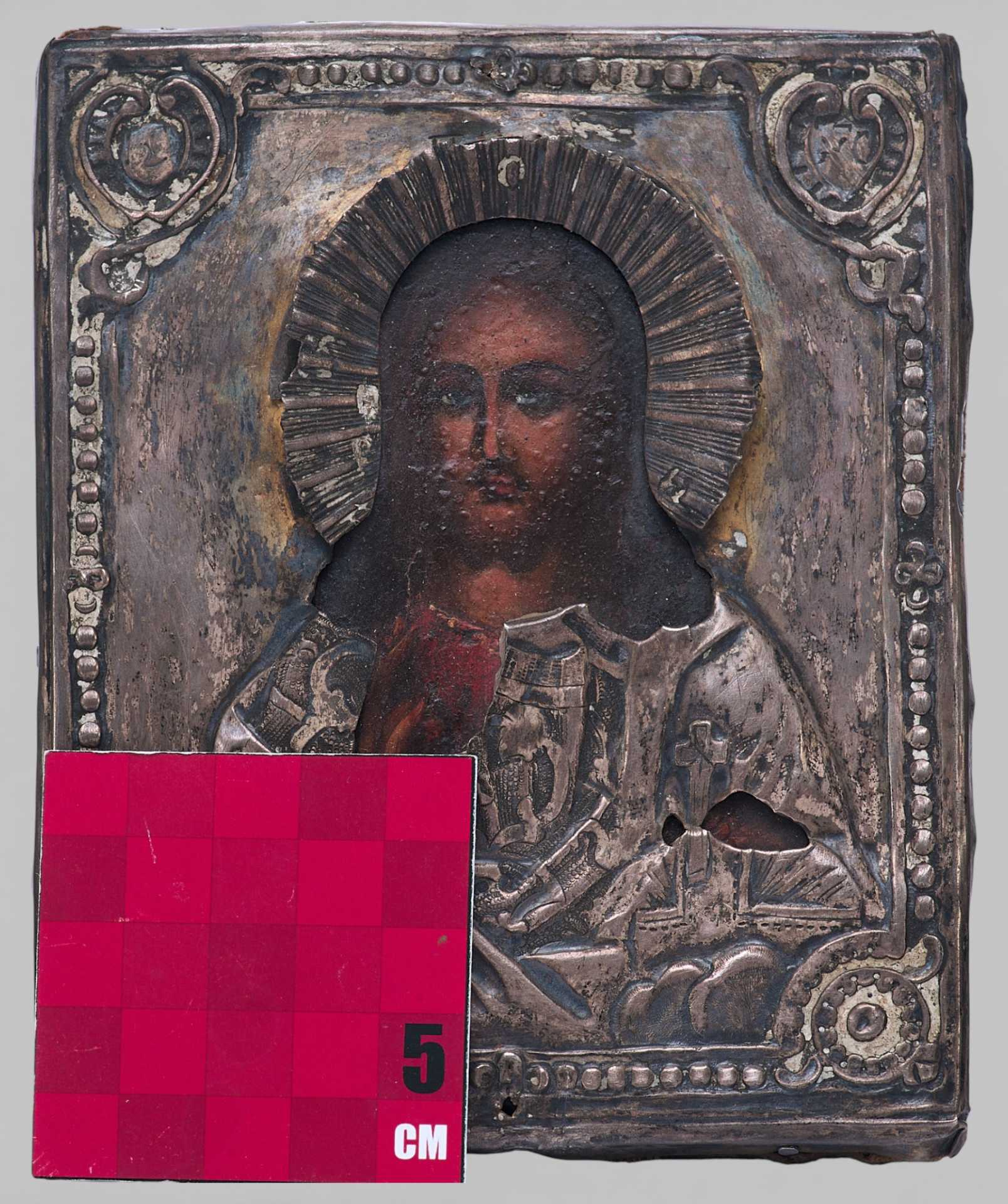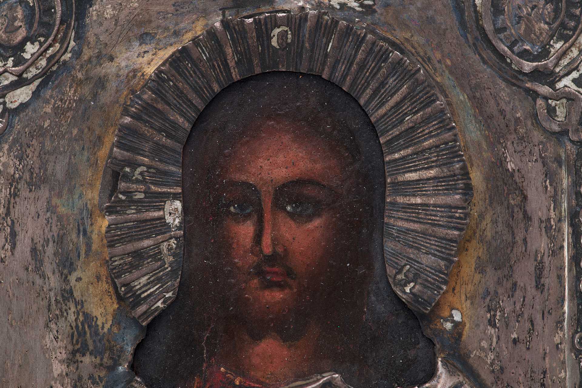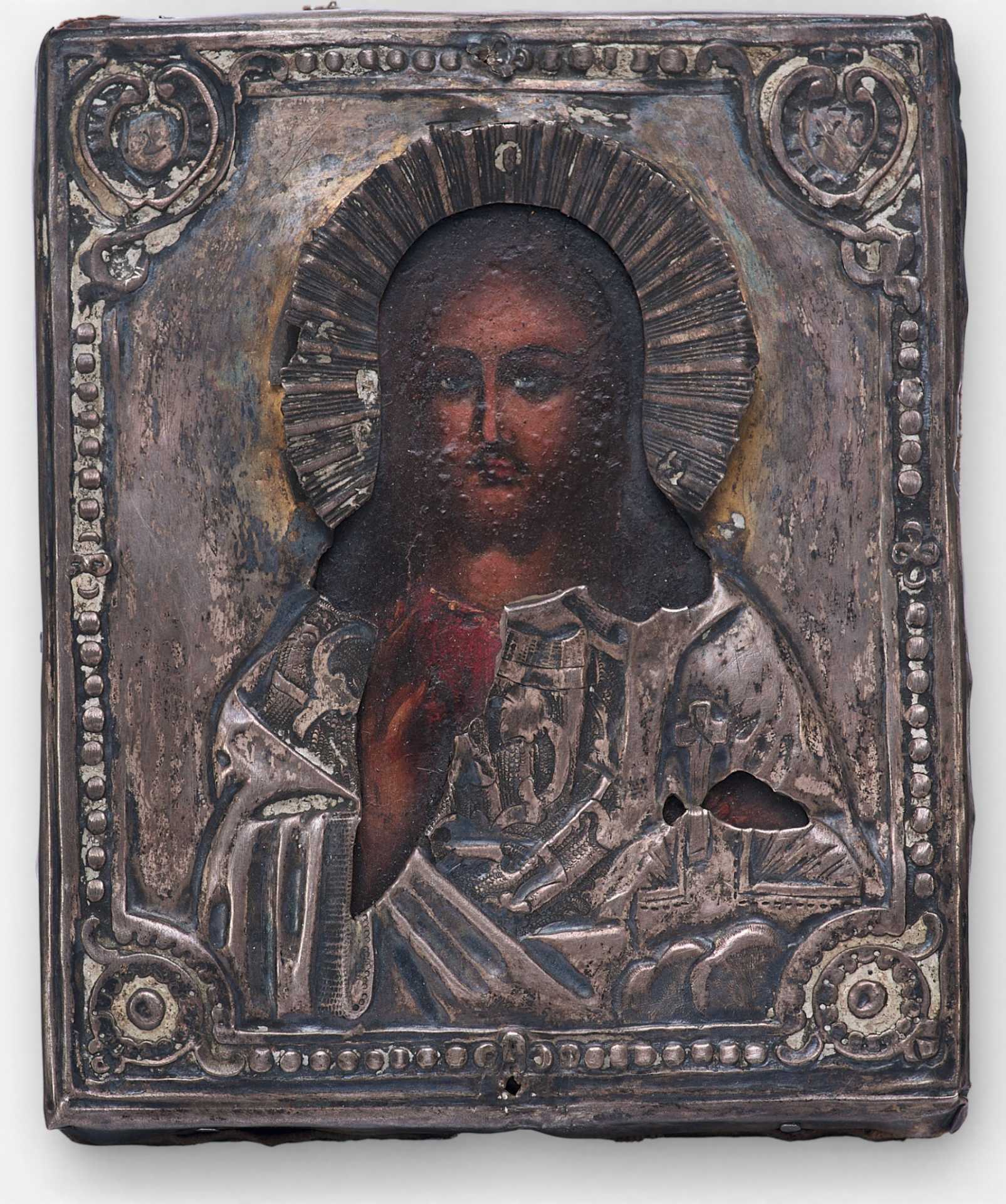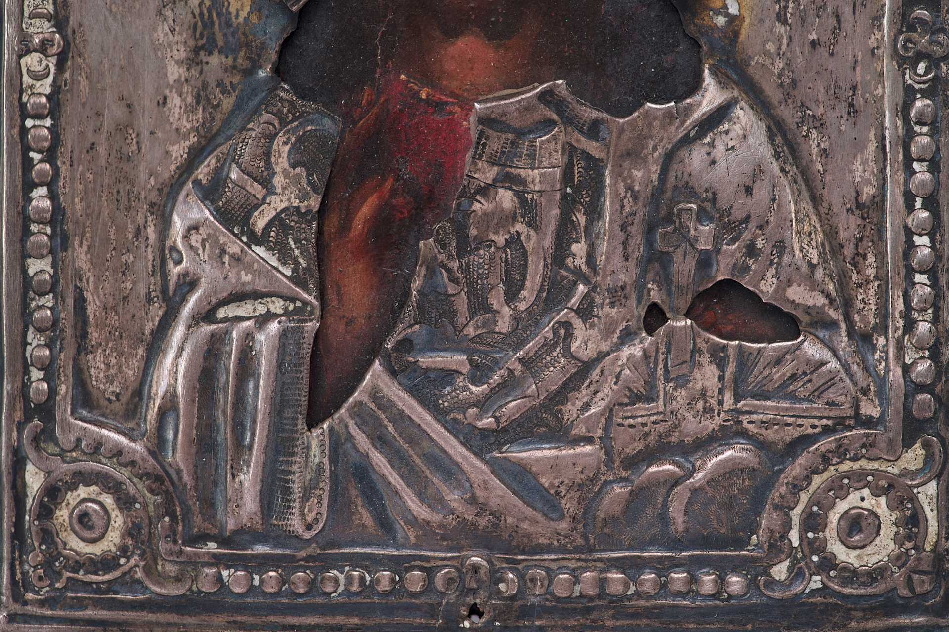 Правой рукой он благословляет, а в левой держит не раскрытое Евангелие, как это было принято, а державу. Живопись на иконе написана профессиональным мастером под оклад. На окладе имеются клейма: