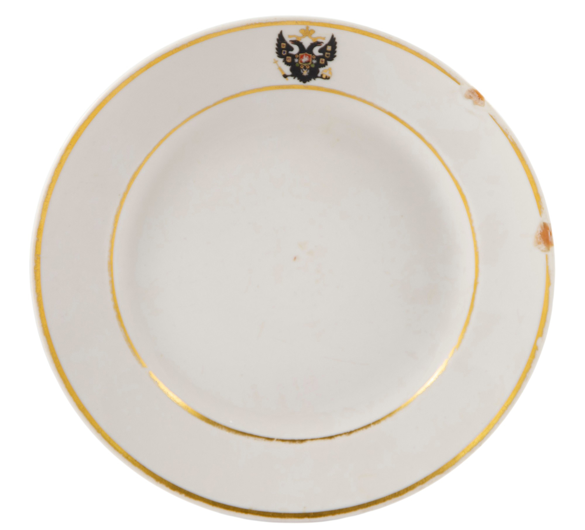 Представлена глубокая фарфоровая тарелка из коронационного сервиза императора Александра II с гербом. Герб изображен в технике ручной росписи эмалевыми красками.