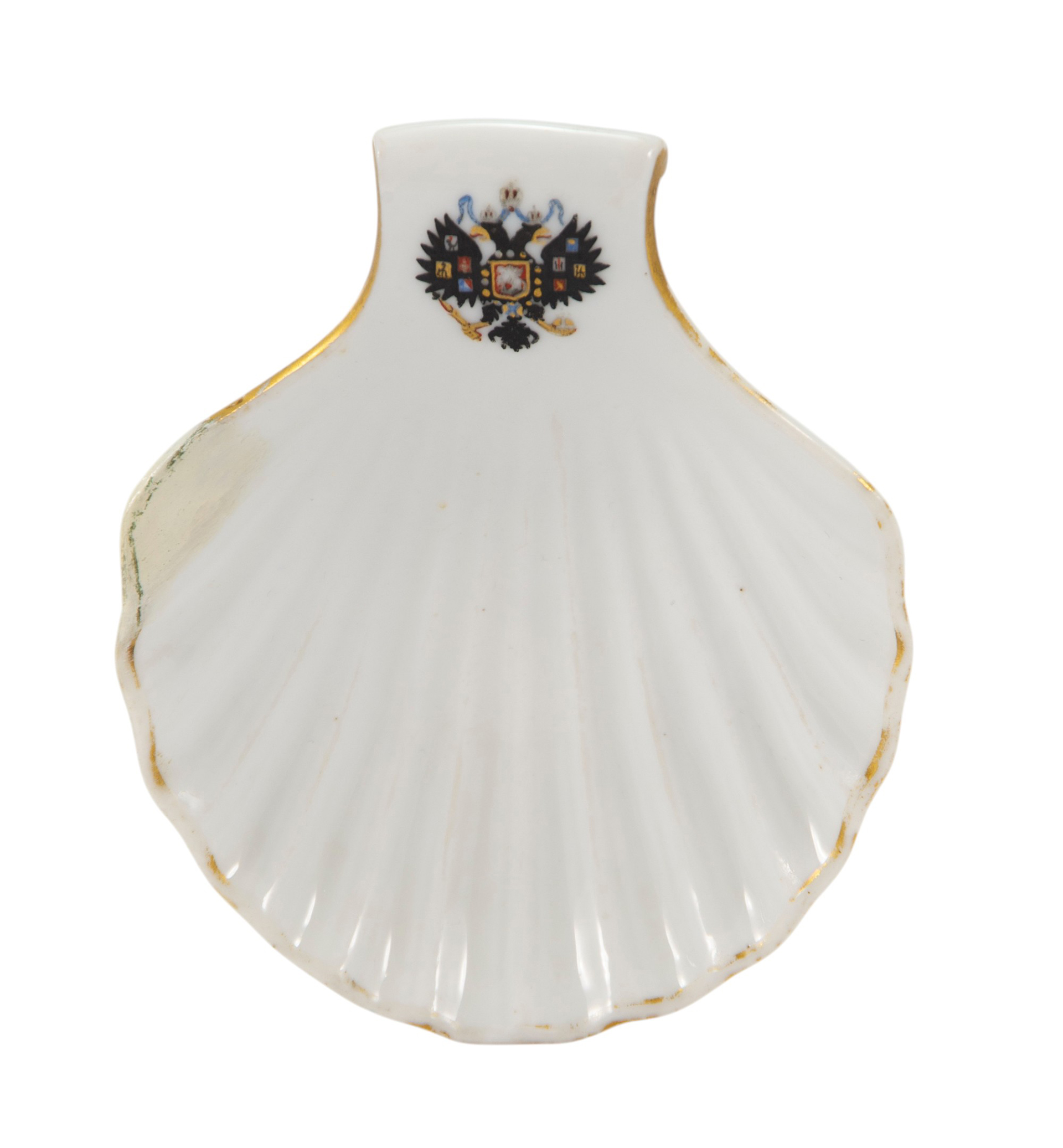 Представлена фарфоровая икорница в форме морской раковины из коронационного сервиза императора Александра III с гербом нового образца. Герб изображен в технике ручной росписи эмалевыми красками.