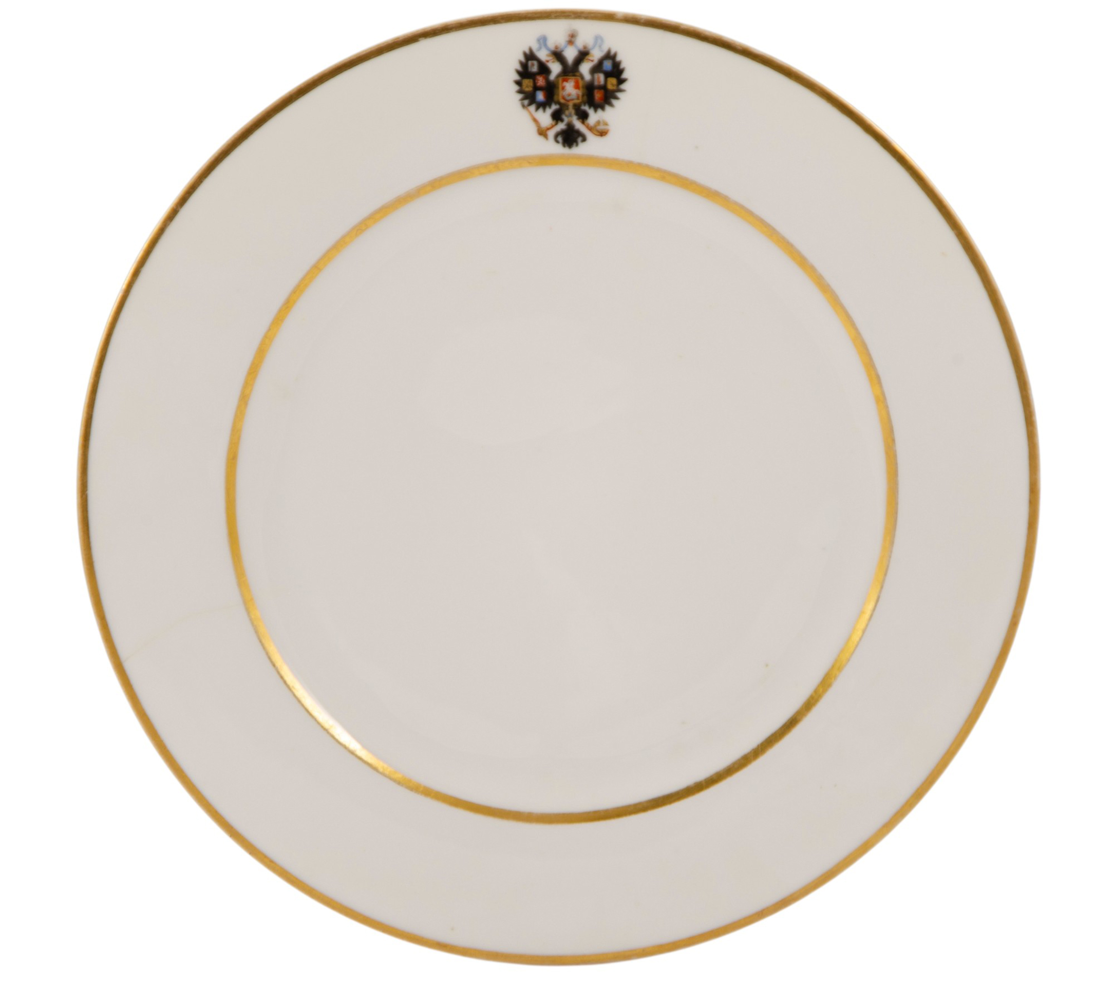 Представлена закусочная фарфоровая тарелка из коронационного сервиза императора Александра III с гербом нового образца. Из Зимнедворских сервизов. Фарфор тяжелый , высшего качества белизны. Герб изображен в технике ручной росписи эмалевыми красками. Роспись -отводки золотом.