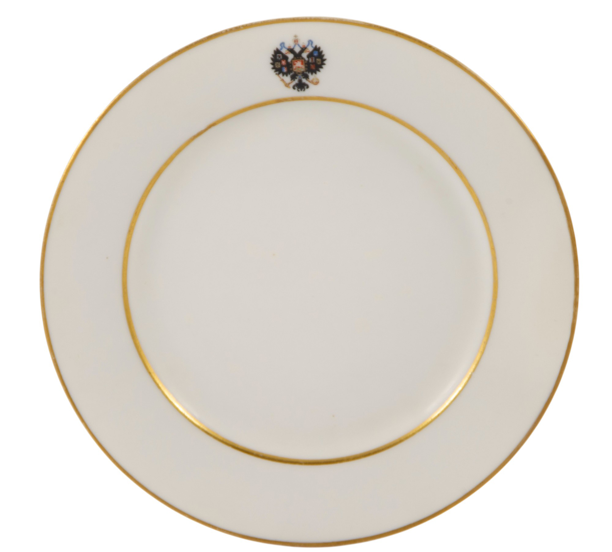 Представлена десертная фарфоровая тарелка из коронационного сервиза императора Александра III с гербом нового образца. Из Зимнедворских сервизов. Фарфор тяжелый , высшего качества белизны. Герб изображен в технике ручной росписи эмалевыми красками. Роспись - отводки золотом.