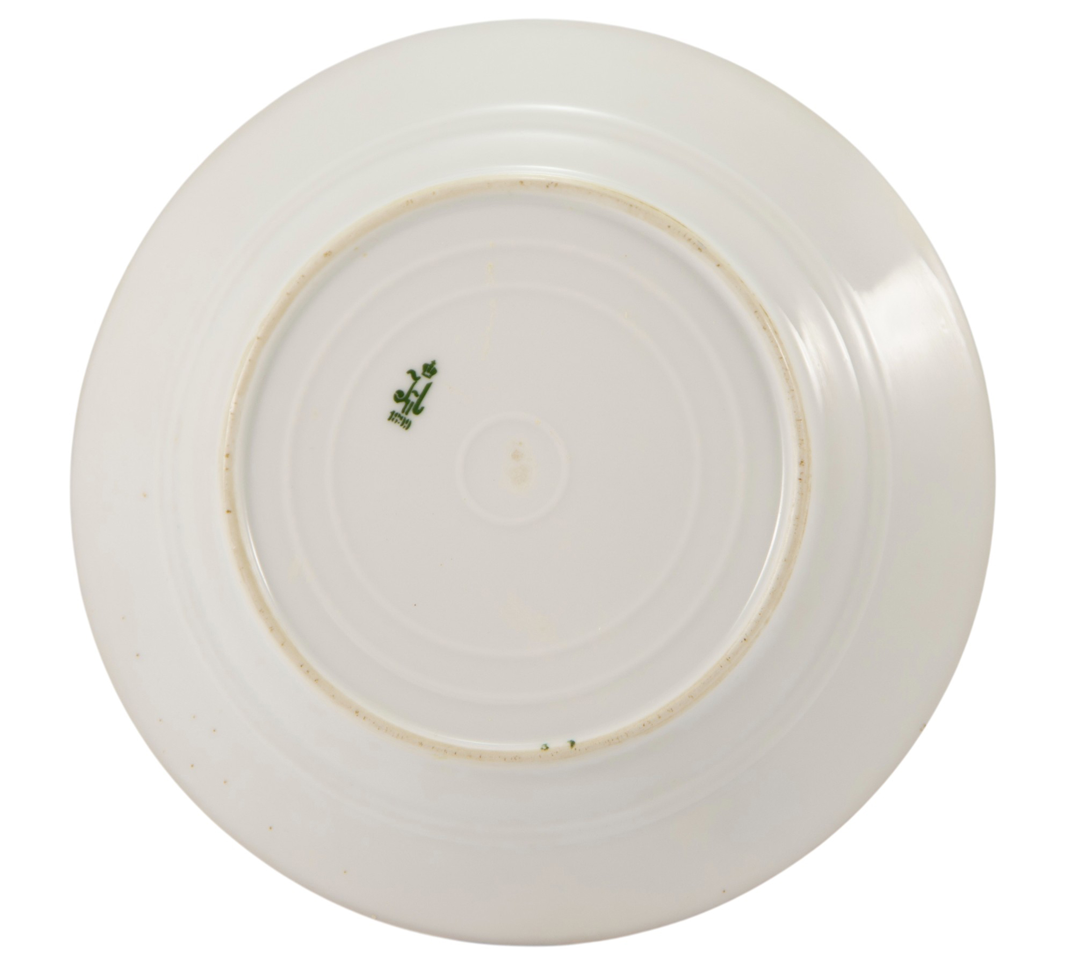 На донышке тарелки клеймо Императорского фарфорового завода - вензель императора Николая И, под императорским вензелем, дата - 1899 г. Согласно легенде тарелка находилась в доме инженера Н.Н. Ипатьева во время пребывания в Екатеринбурге императорской семьи Романовых. Императорский фарфоровый завод (ИФЗ).