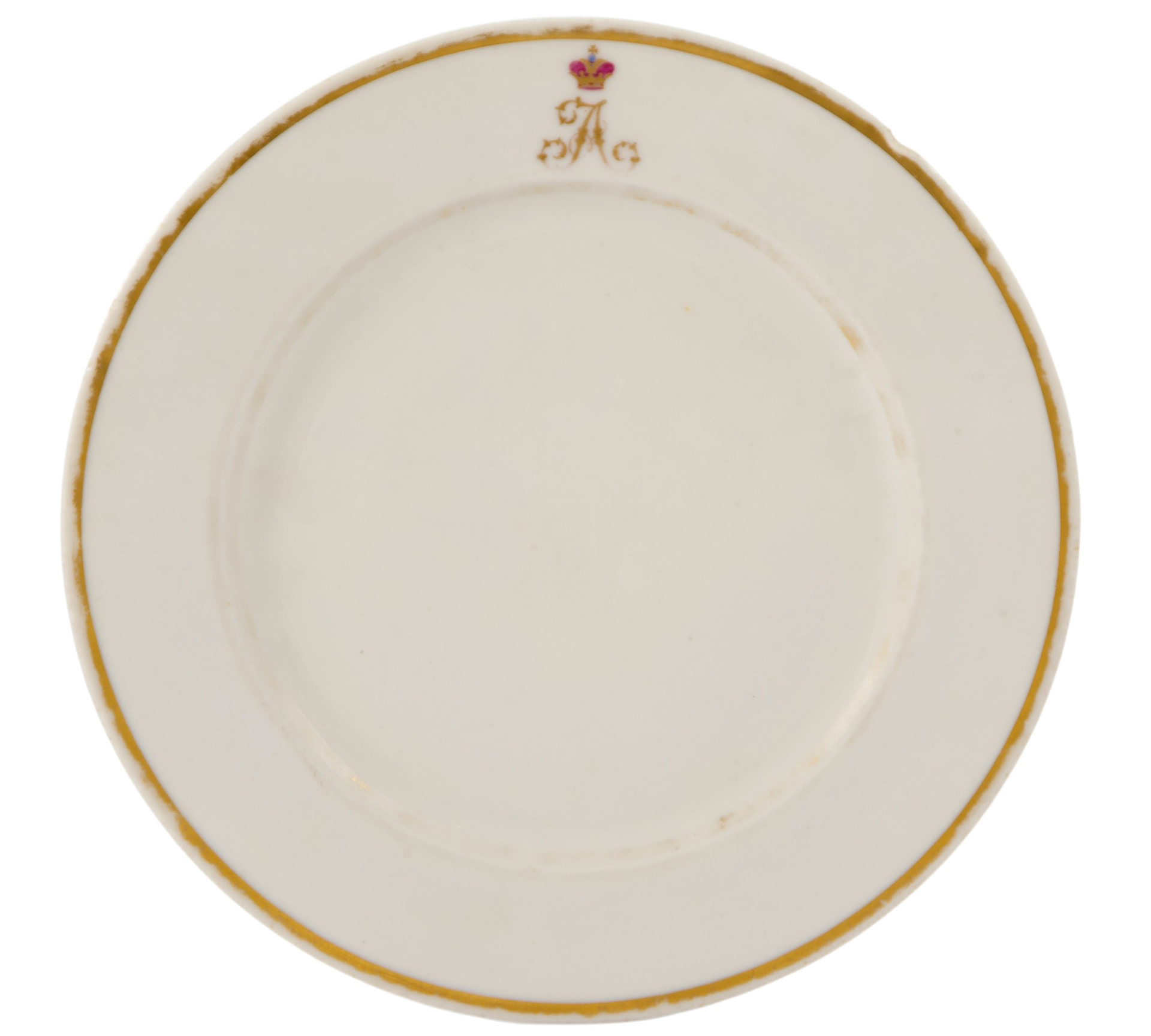 Представлена столовая фарфоровая тарелка из «Фермерского» сервиза императора Александра II, для Фермерсого дворца в имении Александрия. Вензель изображен в технике ручной росписи эмалевыми красками.