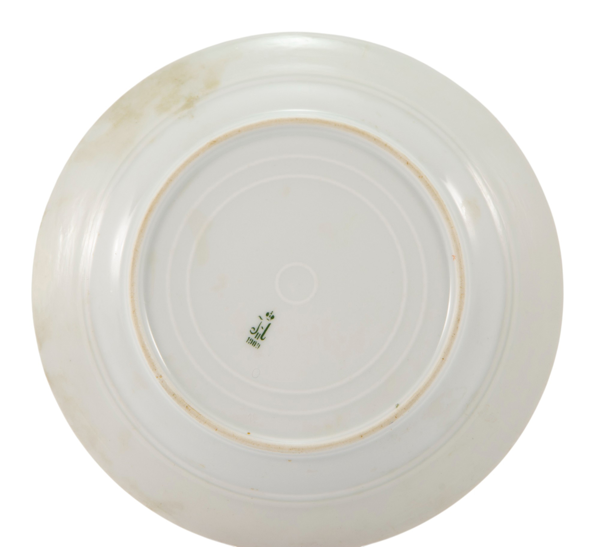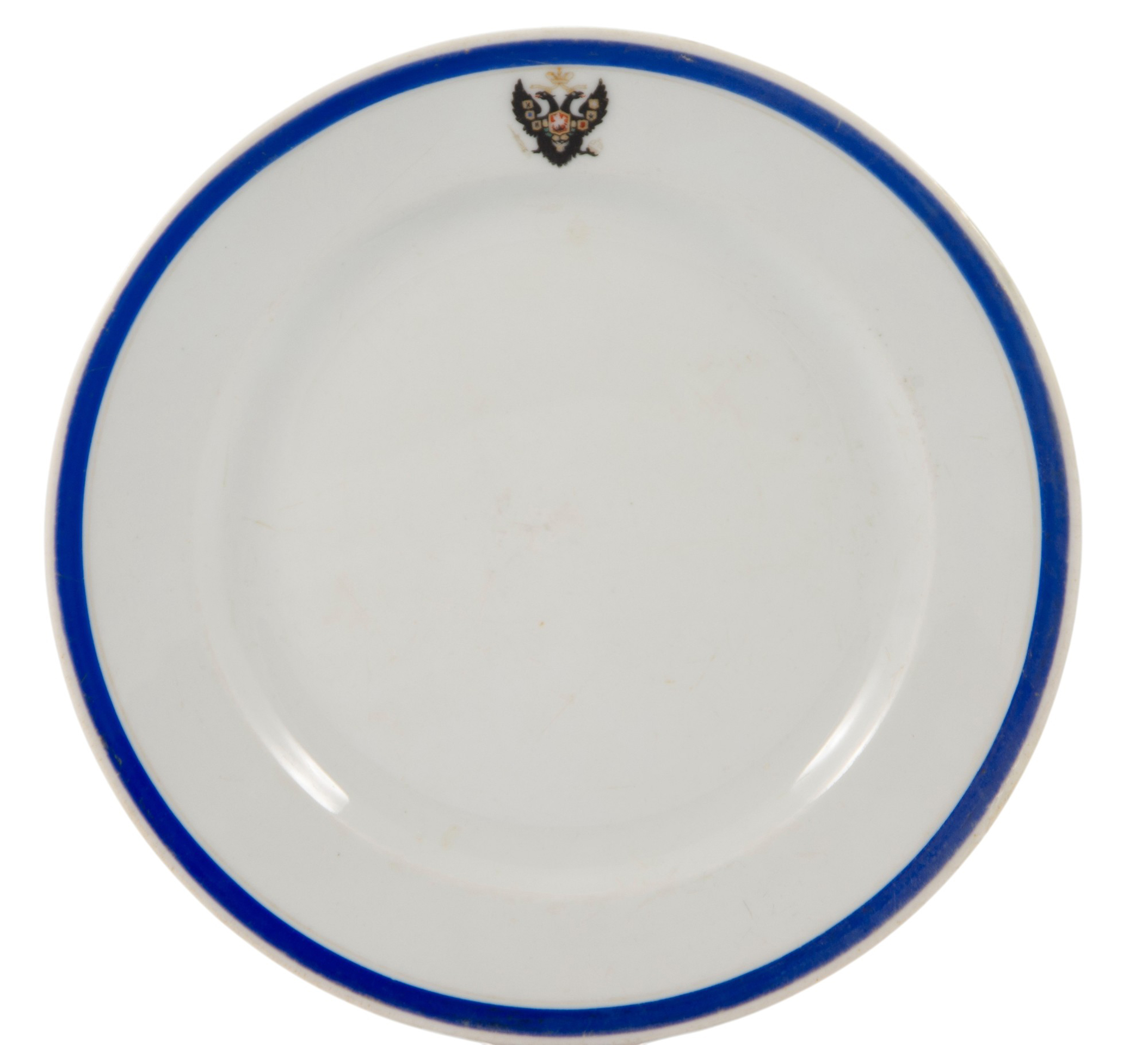Представлена сервировочная фарфоровая тарелка из «Царскосельского дворца» с гербами, золотою и синей полоскою. На донышке тарелки Марка: зеленым «Н И» с датой 1909 г.- Россия, Санкт-Петербург, Императорский Фарфоровый завод, (период правления Николая II), с 1899 по 1912 гг. Для повседневных трапез в 1840 г. на ИФЗ был изготовлен сервиз «с гербом, голубой полосой и золотым узким рантом» или «Царскосельского дворца с гербами, золотою и синей полоскою» на 300 персон, для которого в 1838 г. было поручено изобрести новый рисунок и сделать по нему одну тарелку. Вещи должны были «быть лучшей доброты, но не простого вида и не слишком однако богато украшены» Отличительной чертой царскосельского повседневного сервиза является тонкая синяя полоса, дополненная золотым кантом. Исходя их документа 1881 г., сервиз использовался «во время больших фриштиков (завтраков) и обедов, ежедневно для Собственных столов Высочайших