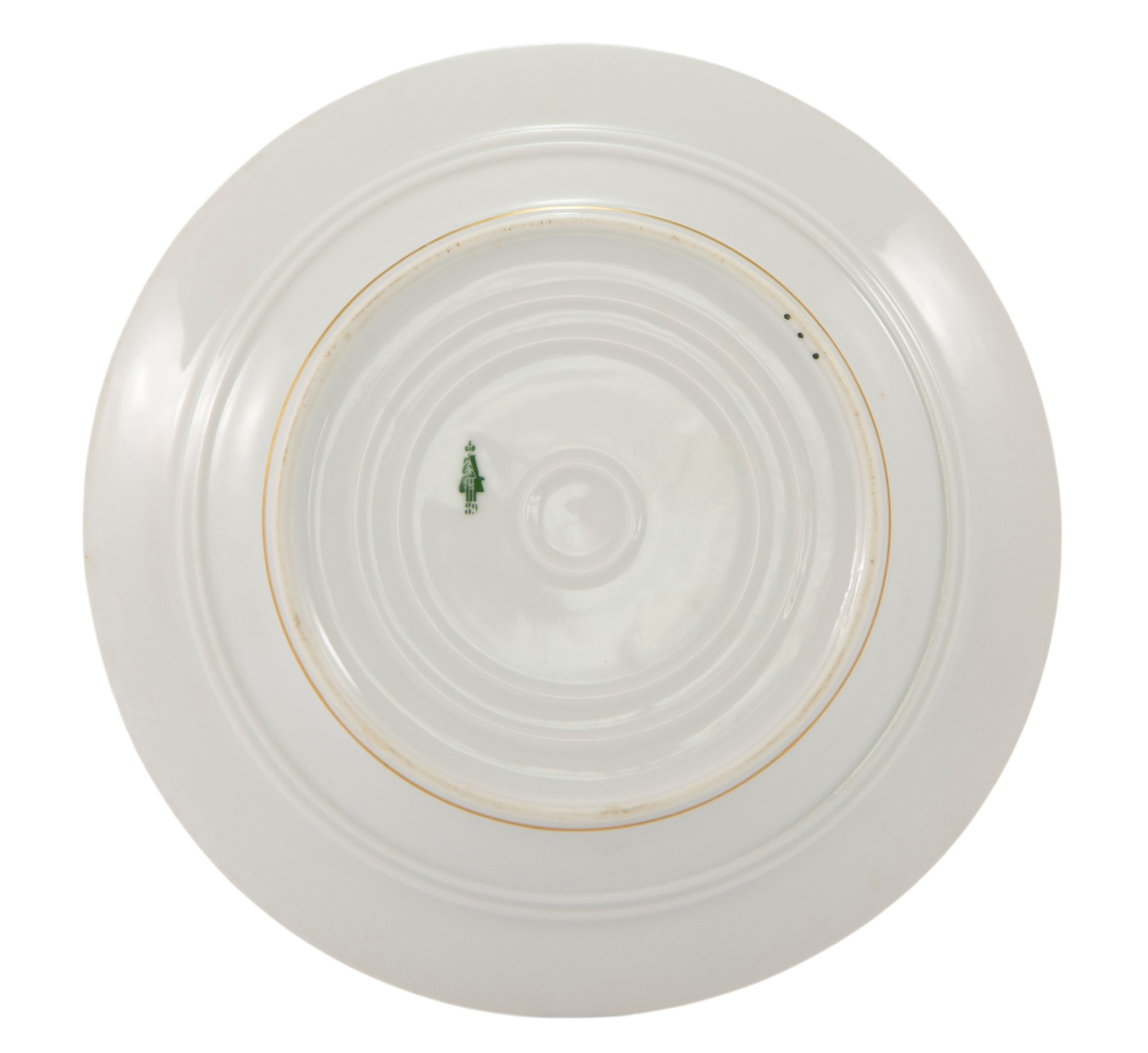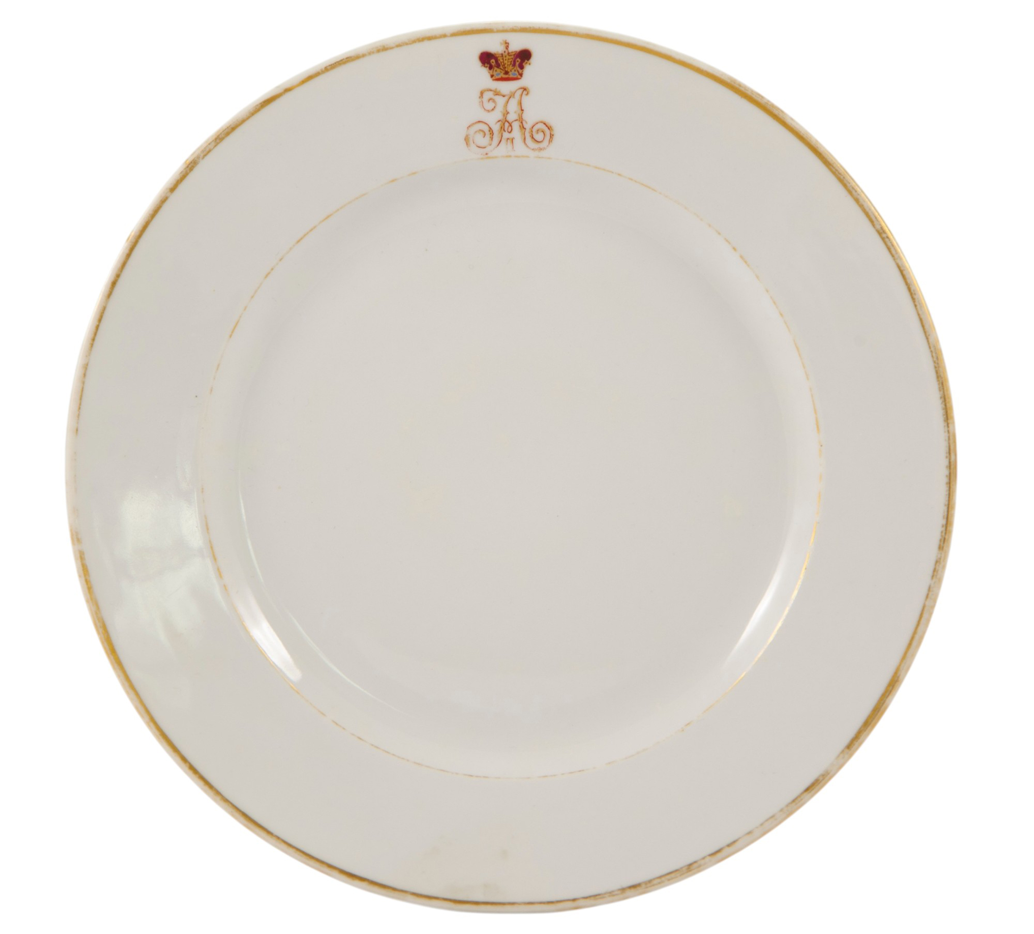 Представлена глубокая фарфоровая тарелка из «Фермерского» сервиза императора Александра II, для Фермерсого дворца в имении Александрия. Вензель изображен в технике ручной росписи эмалевыми красками. На донышке тарелки оливково-зеленое подглазурное клеймо Императорского фарфорового завода, ставящееся в период 1884-1894 гг. Состояние использованных материалов не противоречит указанной датировке.