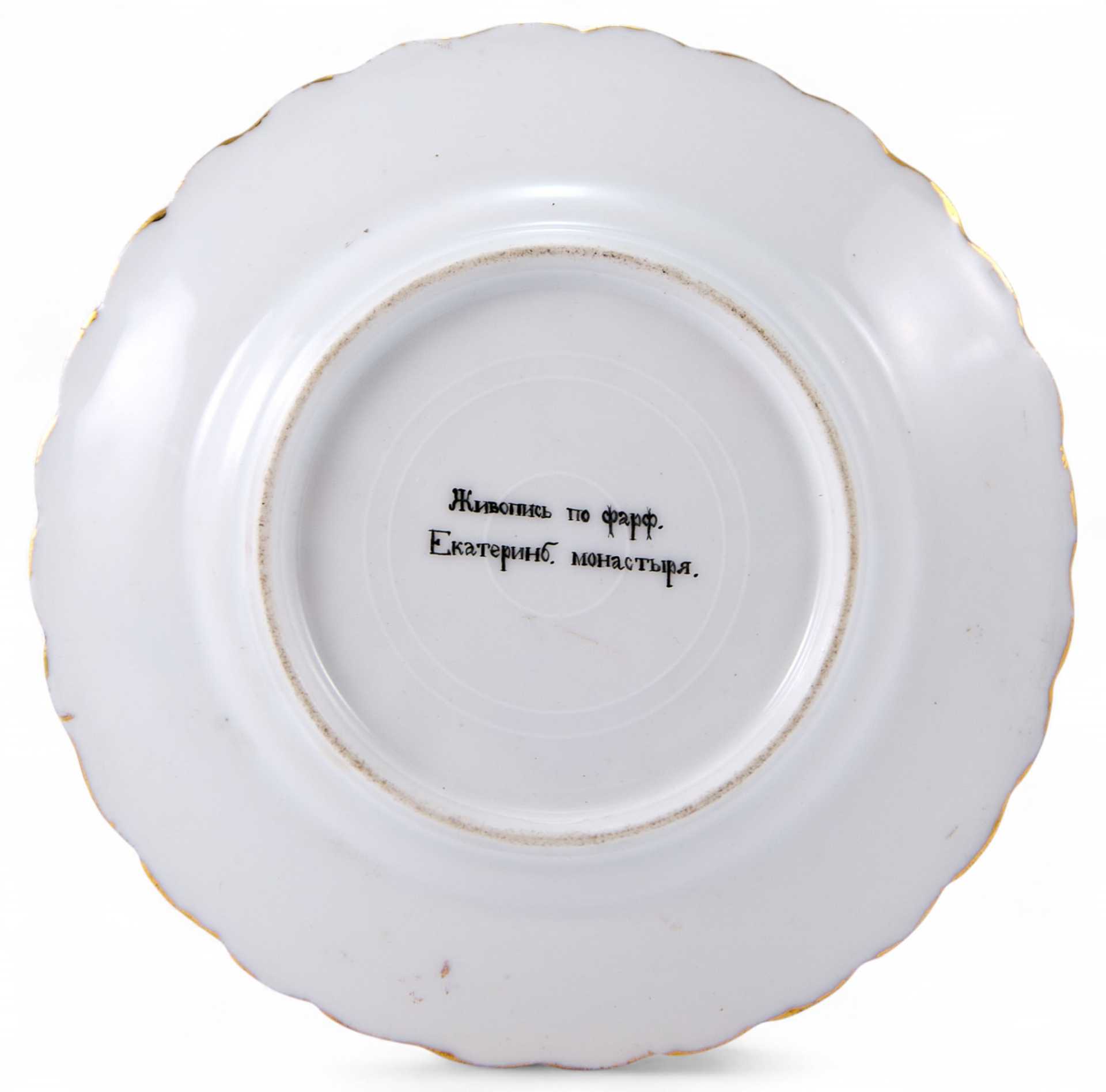 Представленная десертная тарелочка выполнена из фарфора. Фигурный фриз украшены золочением и рельефной пунктирной полосочкой, в центре - цветной натюрморт. Колористическая гамма насыщенная, яркая, но вместе с тем аккуратная, приятная, не вызывающая. На бортике тарелочки - печатный вензель с инициалами «А.С.». Предмет