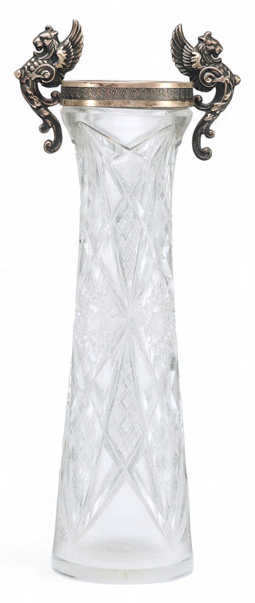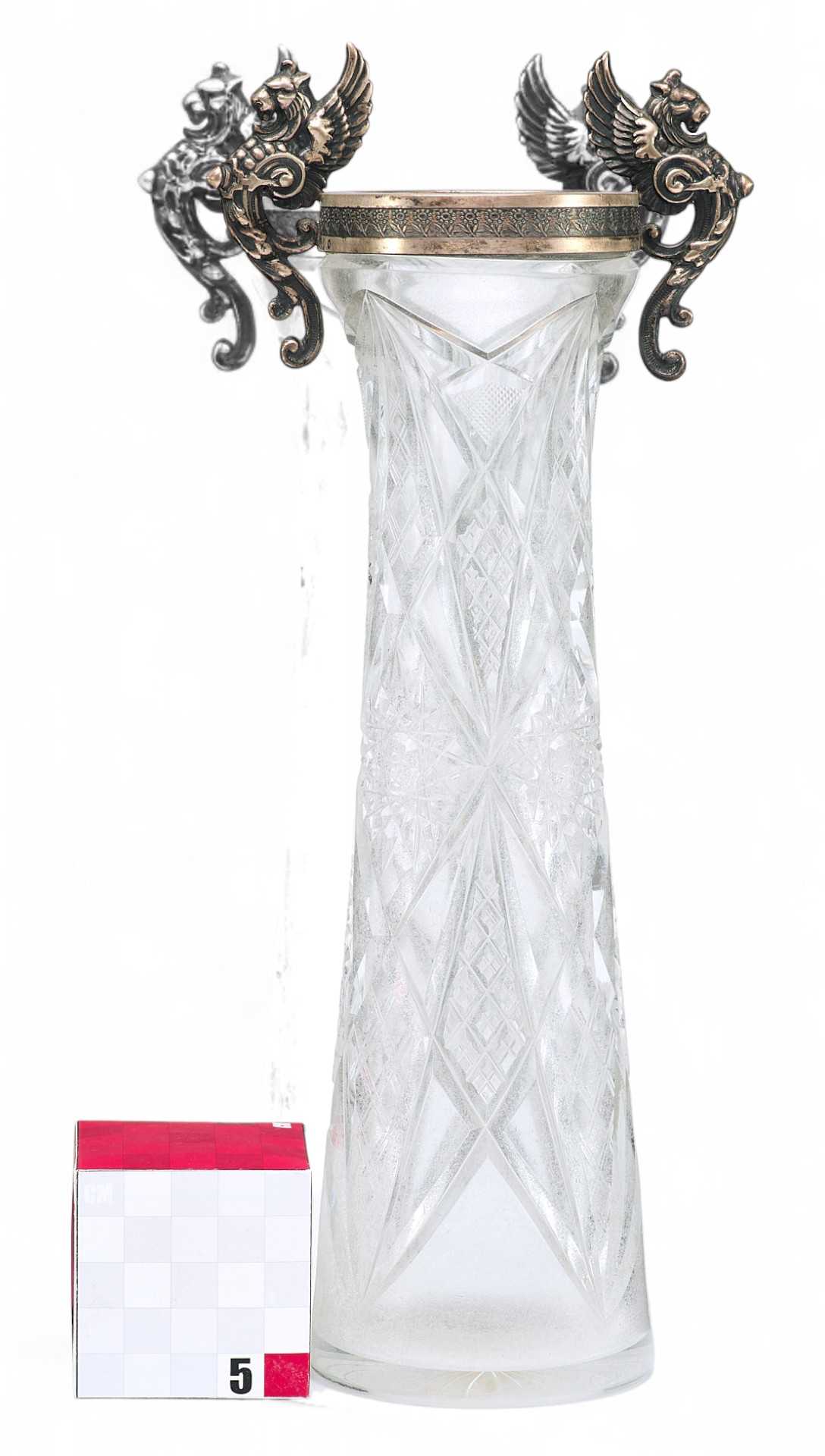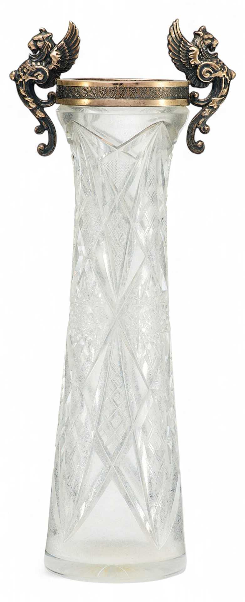 На серебряной части изделия имеются клейма: Обозначение «84» пробы. Женская головка в кокошнике, обращенная вправо, в круглом щитке - клеймо окружного московского пробирного управления в 1908-1926 гг. Инициалы «АИ» в щитке - клеймо Иванова А. Т., владельца фабрики серебряной посуды и других изделий (1893-1917 гг.) Высокая узкая ваза конусообразной формы с небольшим расширением кверху выполнена из хрусталя. Изнутри поверхность украшена эффектом ледяного стекла, имитирующего изморозь, что придает изделию матовость и тонирует, смягчает резные геометрические узоры на внешней стороне вазы. Горлышко сосуда оформлено серебряным кантом с штампованным цветочным орнаментом и двумя фигурными ручками в виде стилизованных фигур мифических животных - грифонов. Изделие выполнено на высоком техническом и художественном уровне и является прекрасным образцом органичного слияния различных материалов и техник. Стилистически вазу можно отнести к стилю интернационального модерна, главенствующему в декоративно-прикладном искусстве начала XX века.