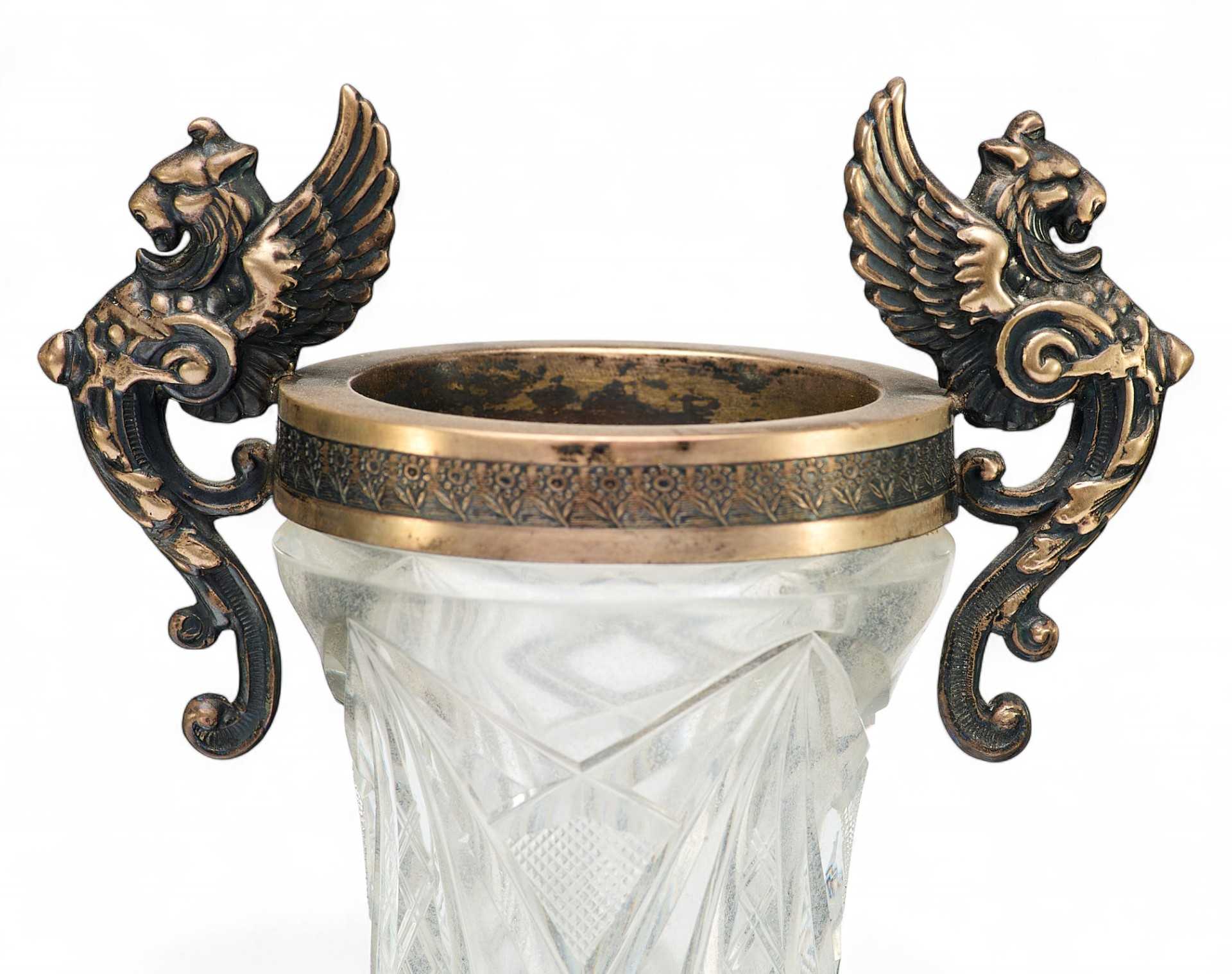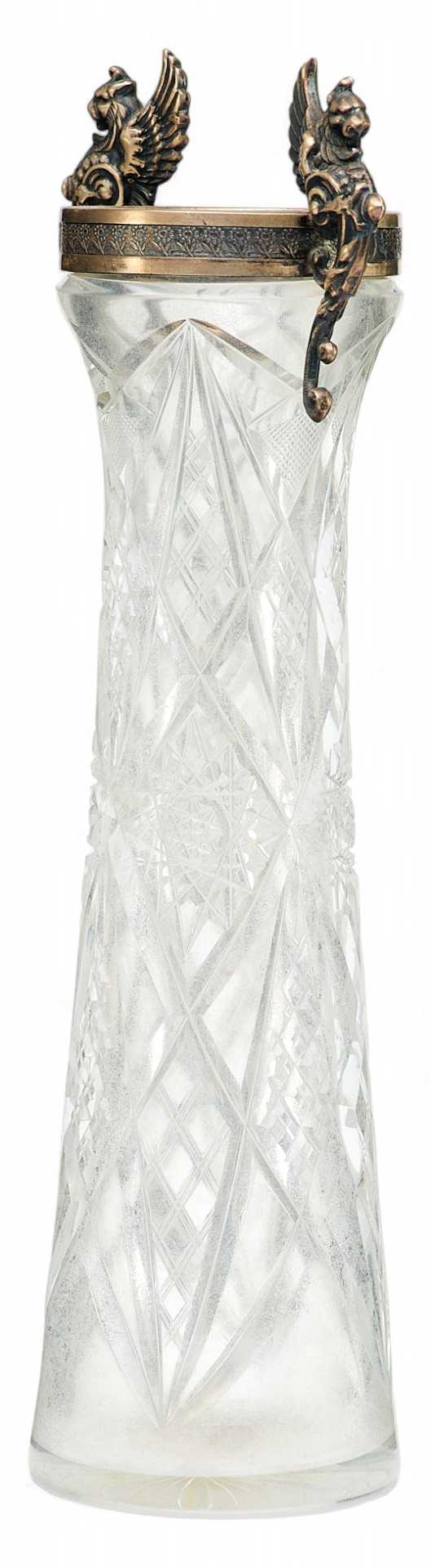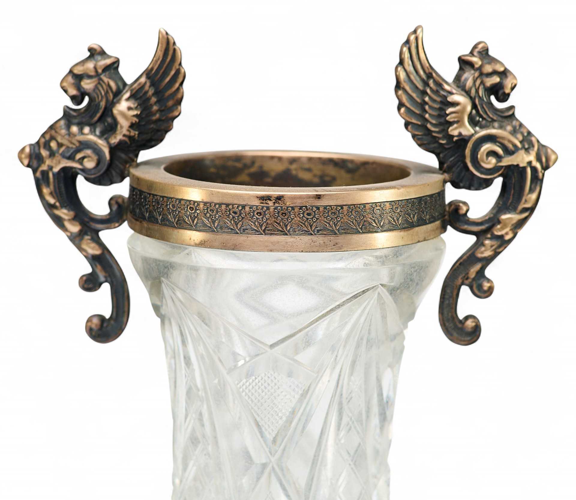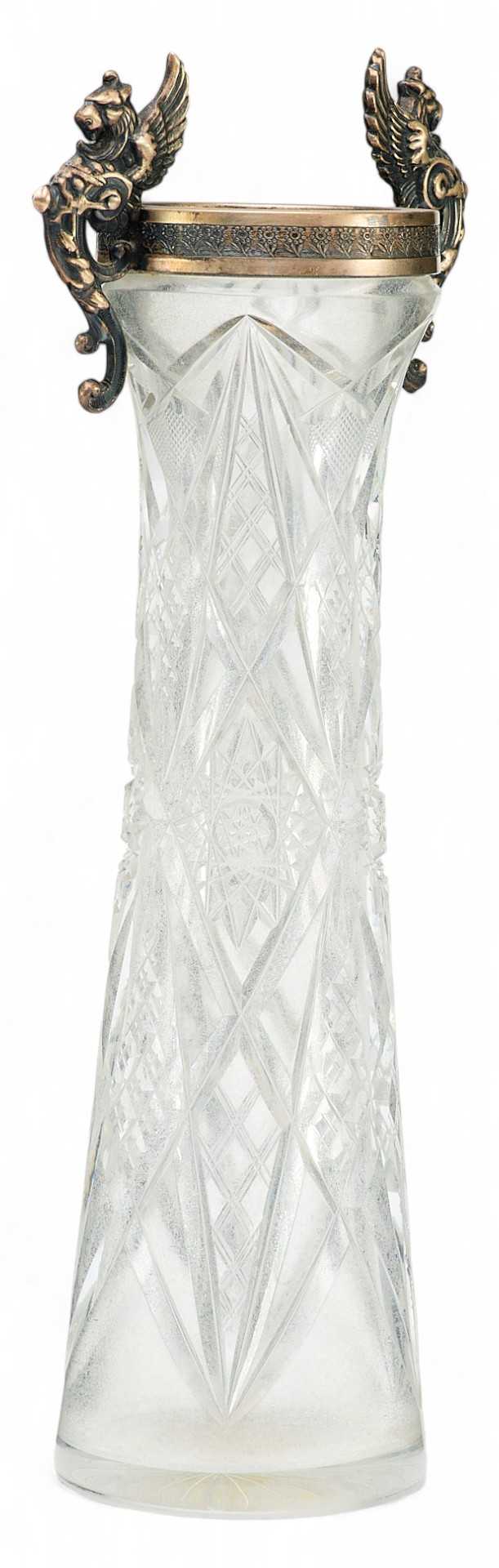 На серебряной части изделия имеются клейма: Обозначение «84» пробы. Женская головка в кокошнике, обращенная вправо, в круглом щитке - клеймо окружного московского пробирного управления в 1908-1926 гг. Инициалы «АИ» в щитке - клеймо Иванова А. Т., владельца фабрики серебряной посуды и других изделий (1893-1917 гг.) Высокая узкая ваза конусообразной формы с небольшим расширением кверху выполнена из хрусталя. Изнутри поверхность украшена эффектом ледяного стекла, имитирующего изморозь, что придает изделию матовость и тонирует, смягчает резные геометрические узоры на внешней стороне вазы. Горлышко сосуда оформлено серебряным кантом с штампованным цветочным орнаментом и двумя фигурными ручками в виде стилизованных фигур мифических животных - грифонов. Изделие выполнено на высоком техническом и художественном уровне и является прекрасным образцом органичного слияния различных материалов и техник. Стилистически вазу можно отнести к стилю интернационального модерна, главенствующему в декоративно-прикладном искусстве начала XX века.