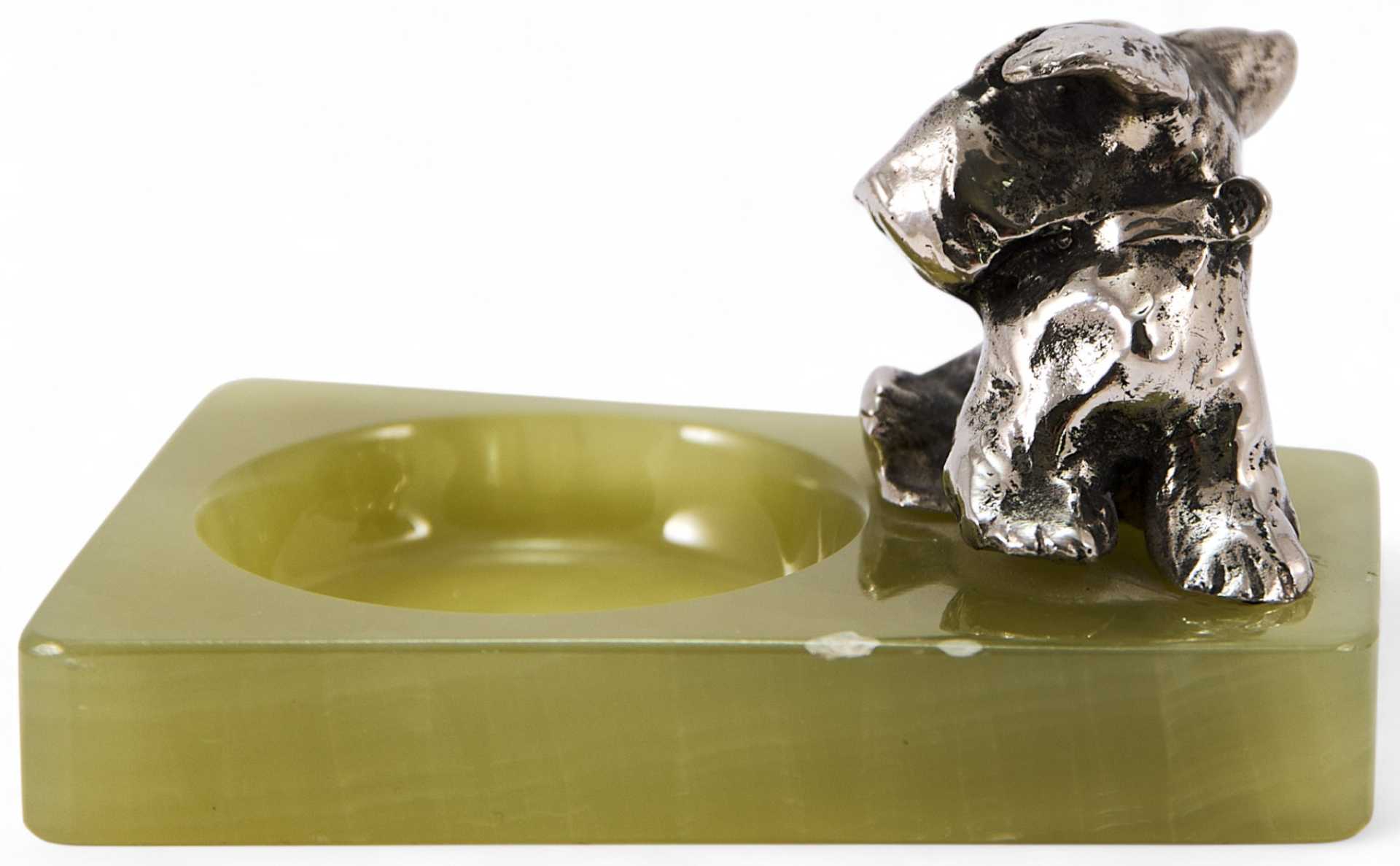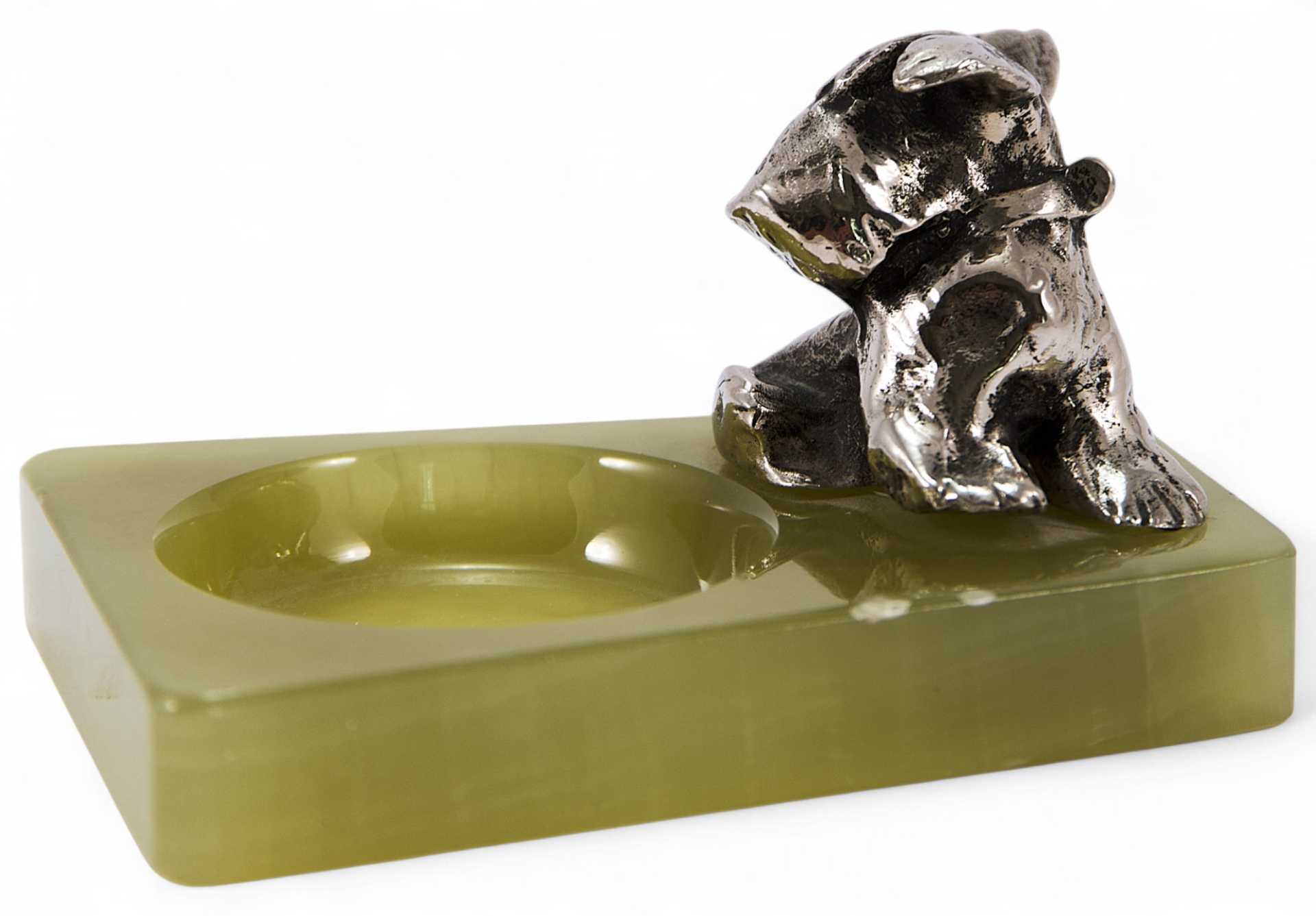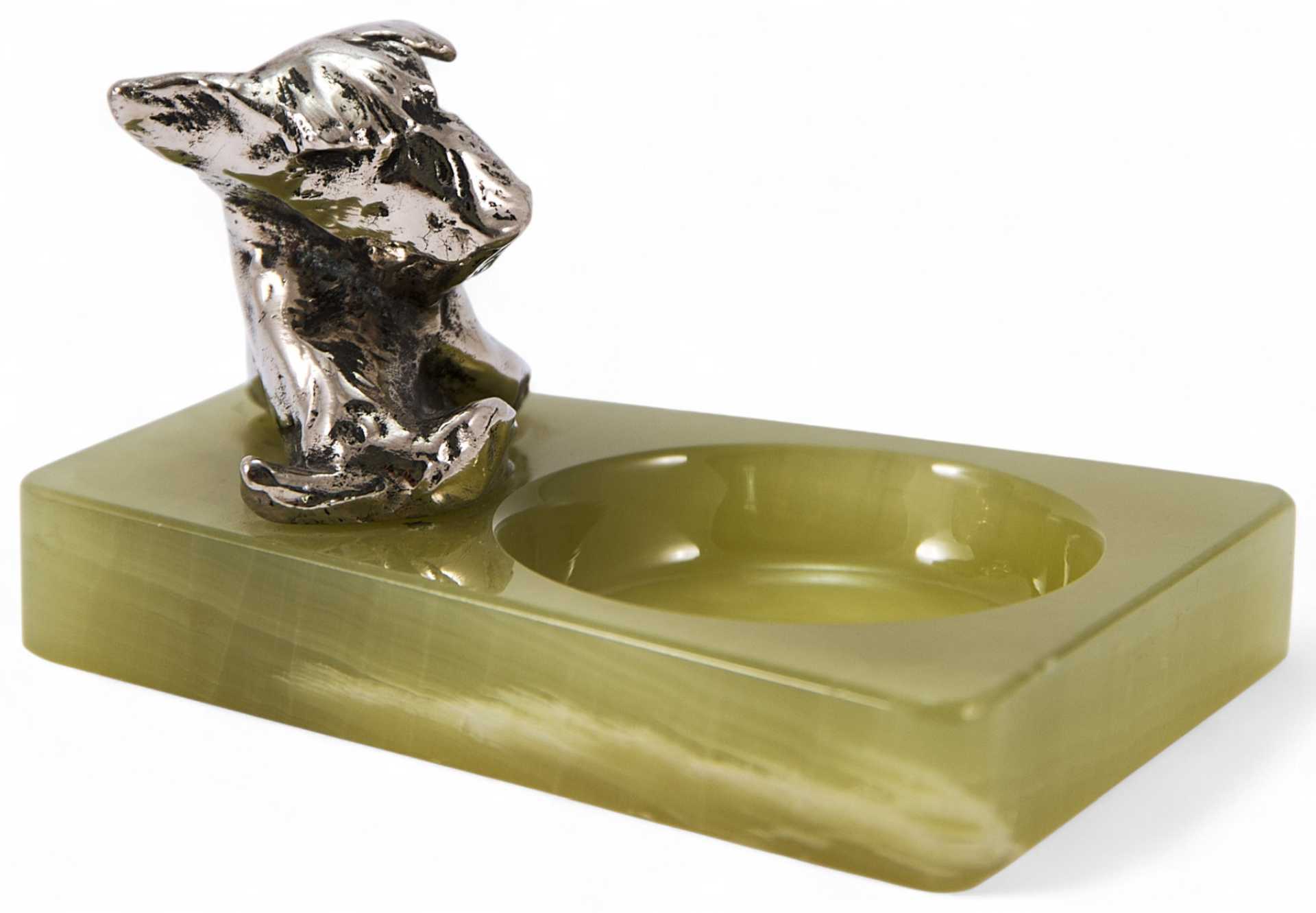 Представлен агатовый лоток, украшенный миниатюрной скульптурой шнауцера. Скульптура представляет собой типичный пример кабинетной «бронзовой» пластики первой трети XX в. довольно популярной в Европе.