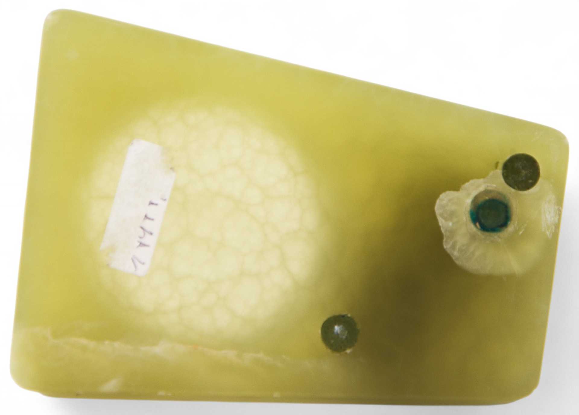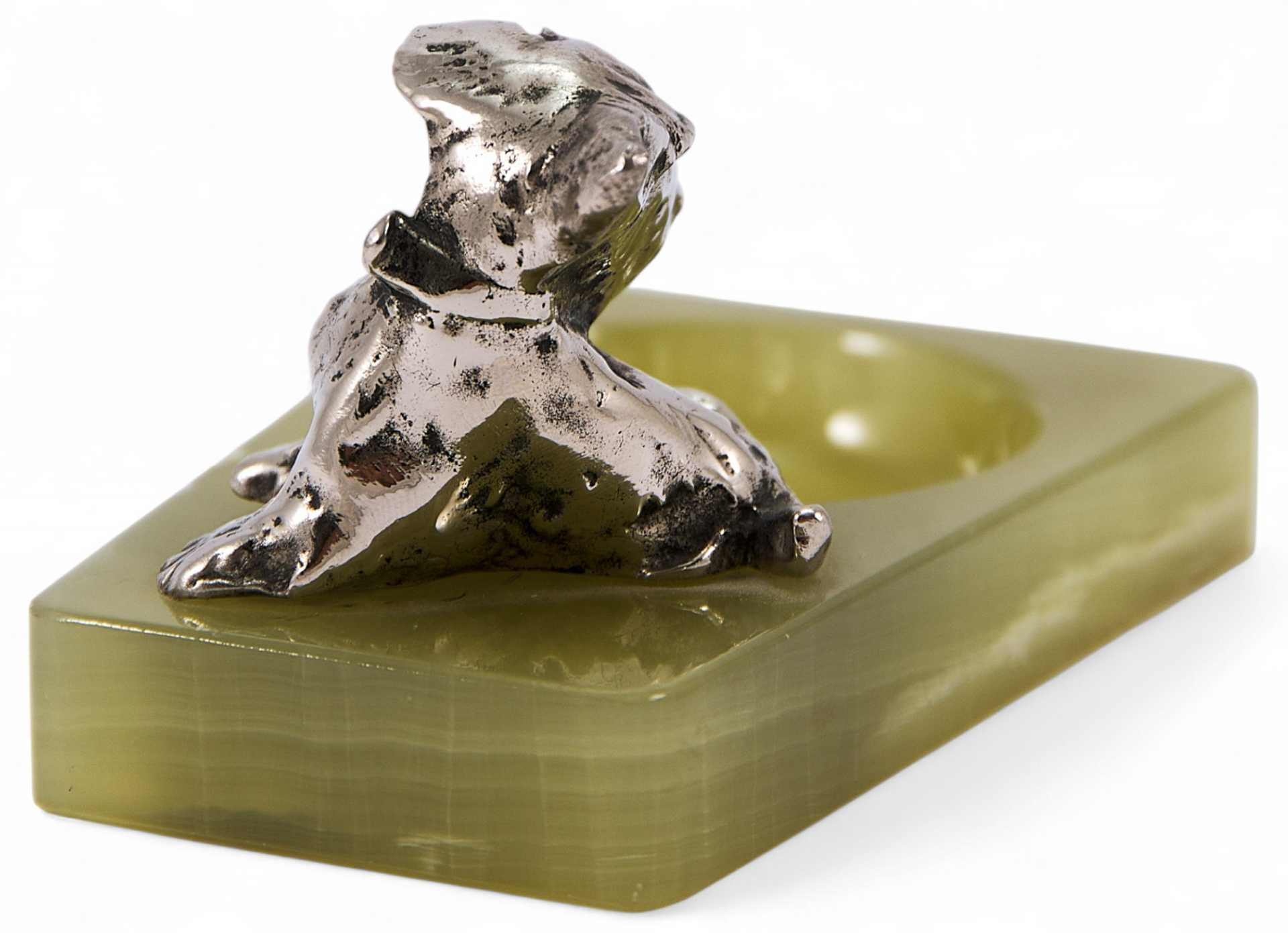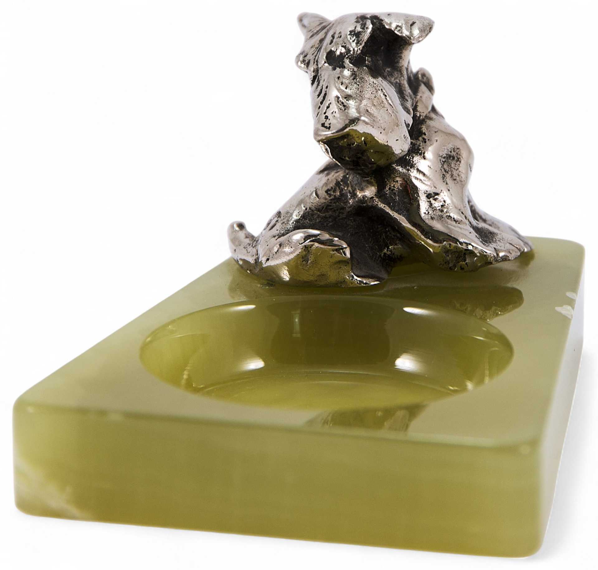 Представлен агатовый лоток, украшенный миниатюрной скульптурой шнауцера. Скульптура представляет собой типичный пример кабинетной «бронзовой» пластики первой трети XX в. довольно популярной в Европе.