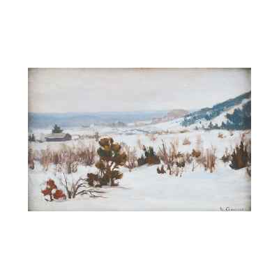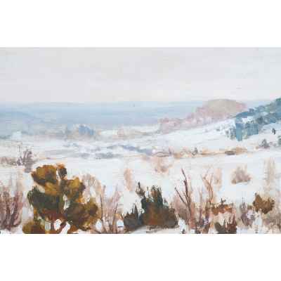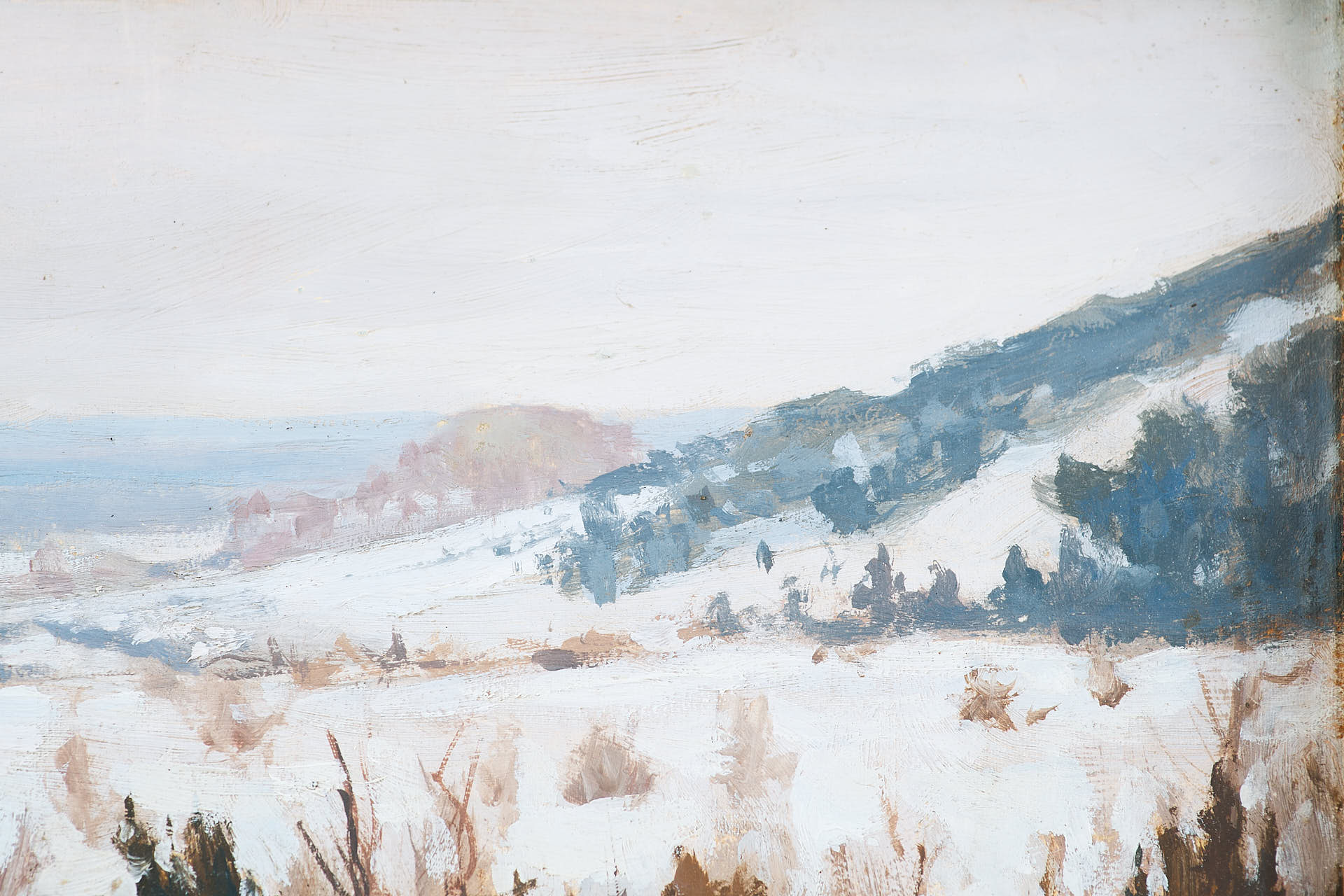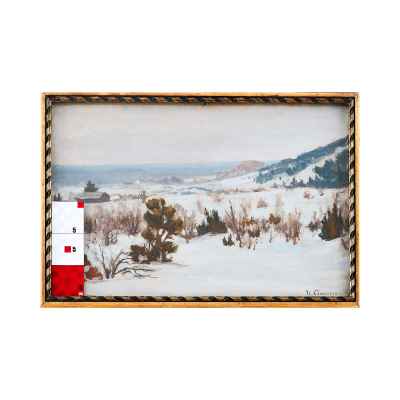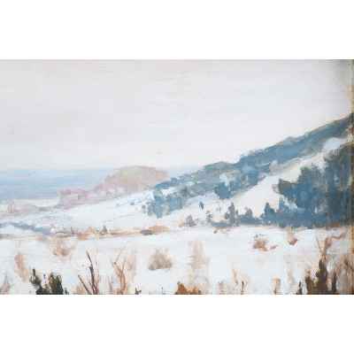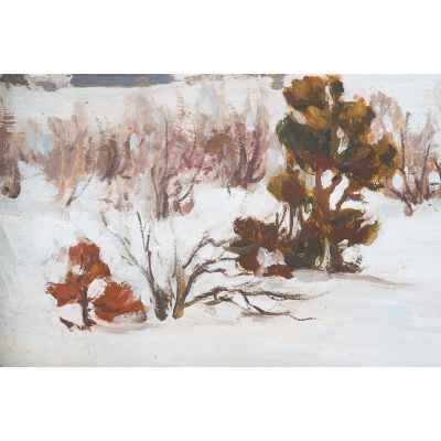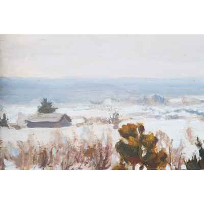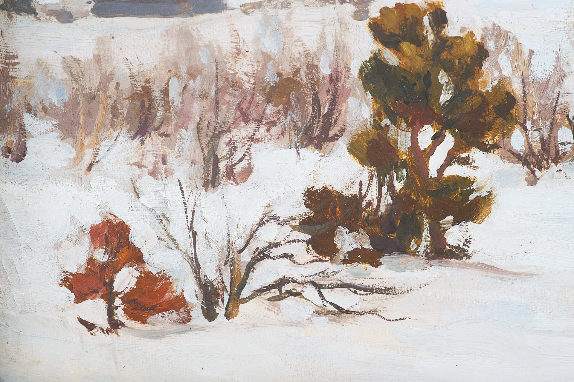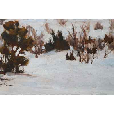 На картине изображена заснеженная местность. На переднем плане из-под чистого снега выглядывают низкие кустарники и молодые сосны и ели. На дальнем плане виден длинный деревянный сарай, над которым возвышается ель. Справа - гора, покрытая хвойным лесом. На горизонте ровной голубовато-серой полосой изображен лес, над которым тянется холодное зимнее небо. Справа внизу авторская подпись: “И. Слюсарев”.