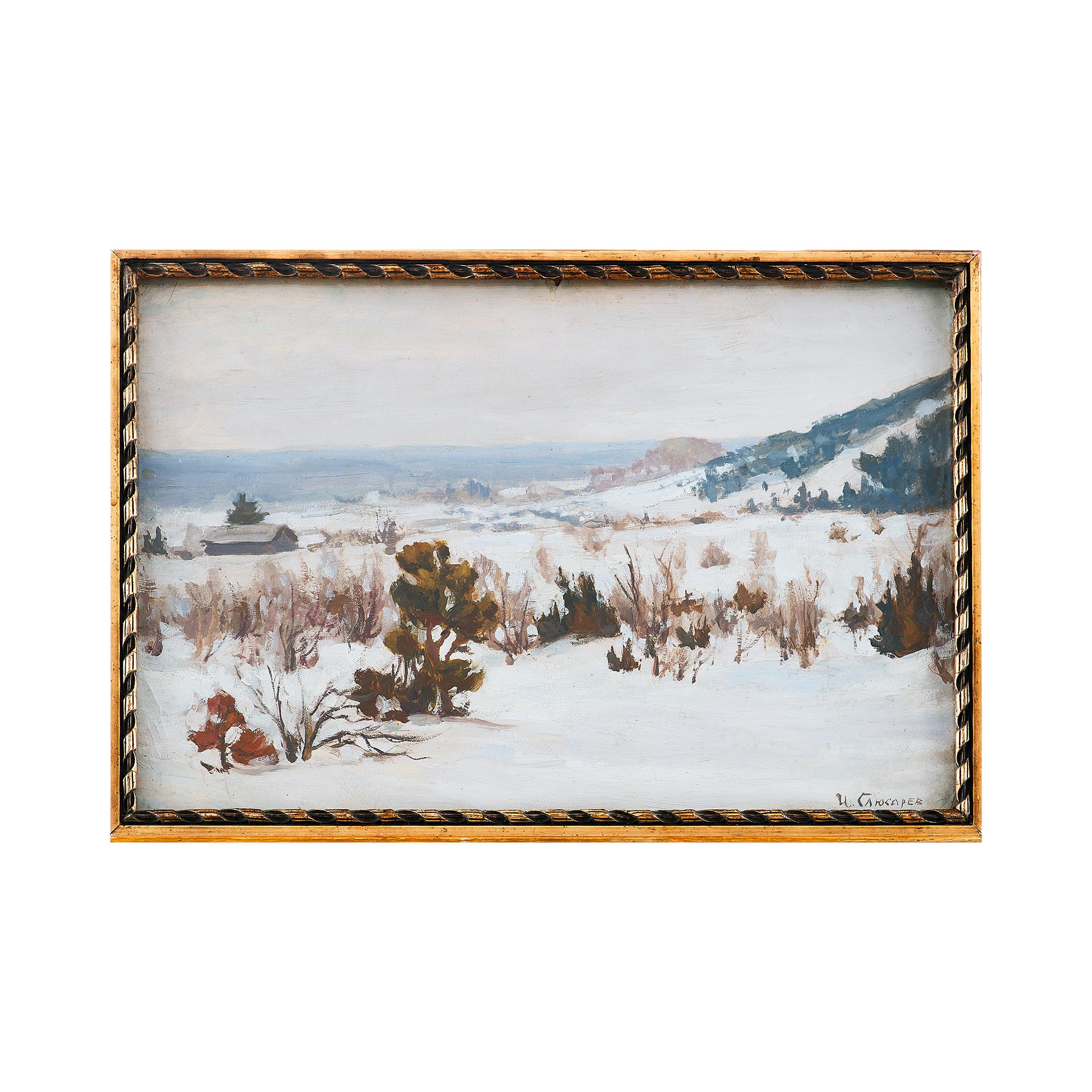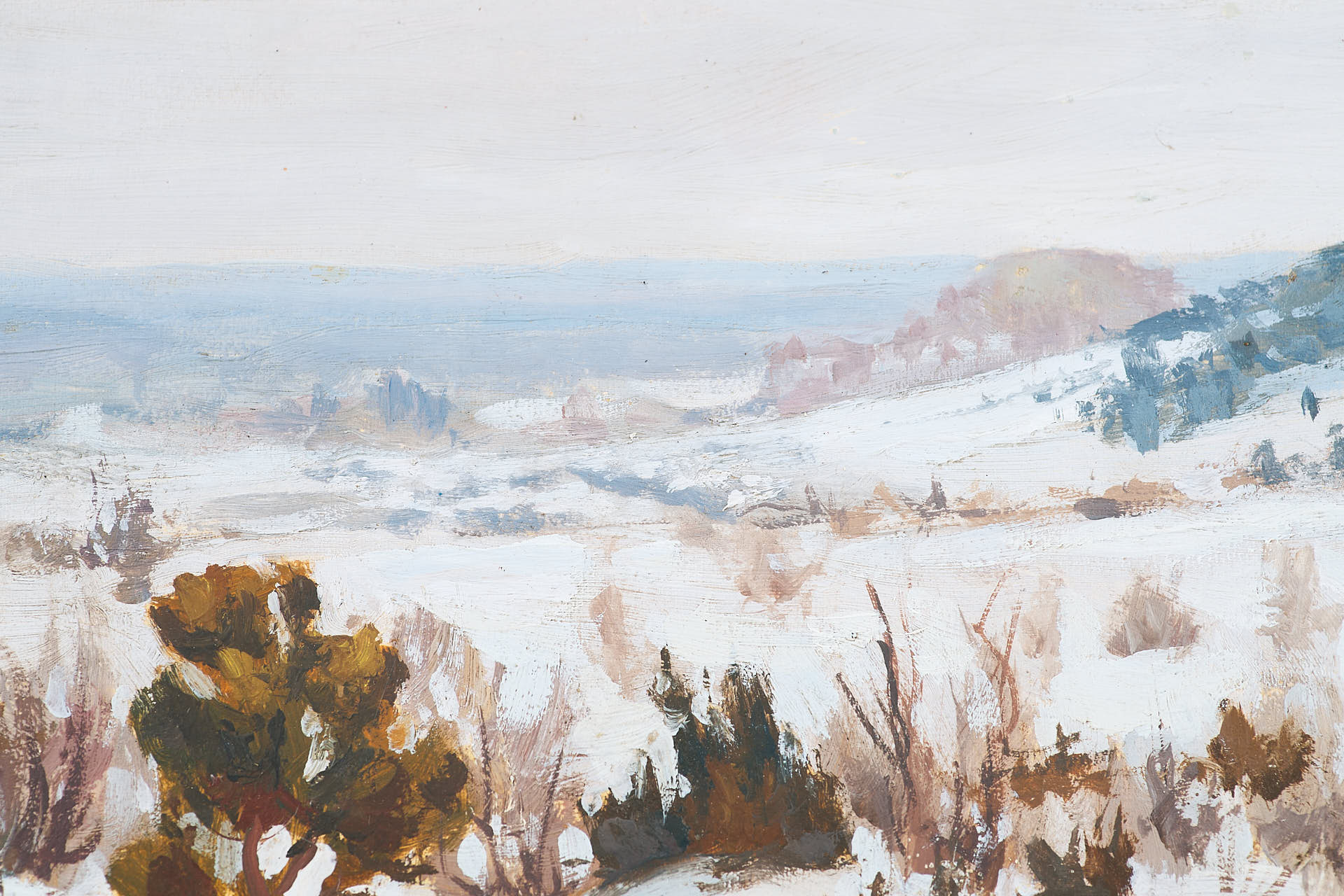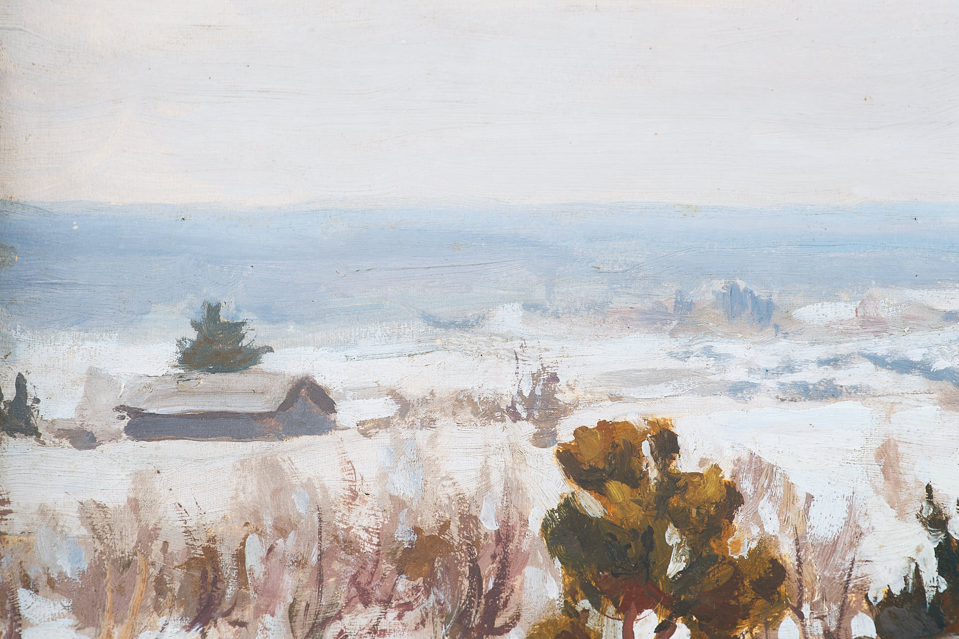 На картине изображена заснеженная местность. На переднем плане из-под чистого снега выглядывают низкие кустарники и молодые сосны и ели. На дальнем плане виден длинный деревянный сарай, над которым возвышается ель. Справа - гора, покрытая хвойным лесом. На горизонте ровной голубовато-серой полосой изображен лес, над которым тянется холодное зимнее небо. Справа внизу авторская подпись: “И. Слюсарев”.