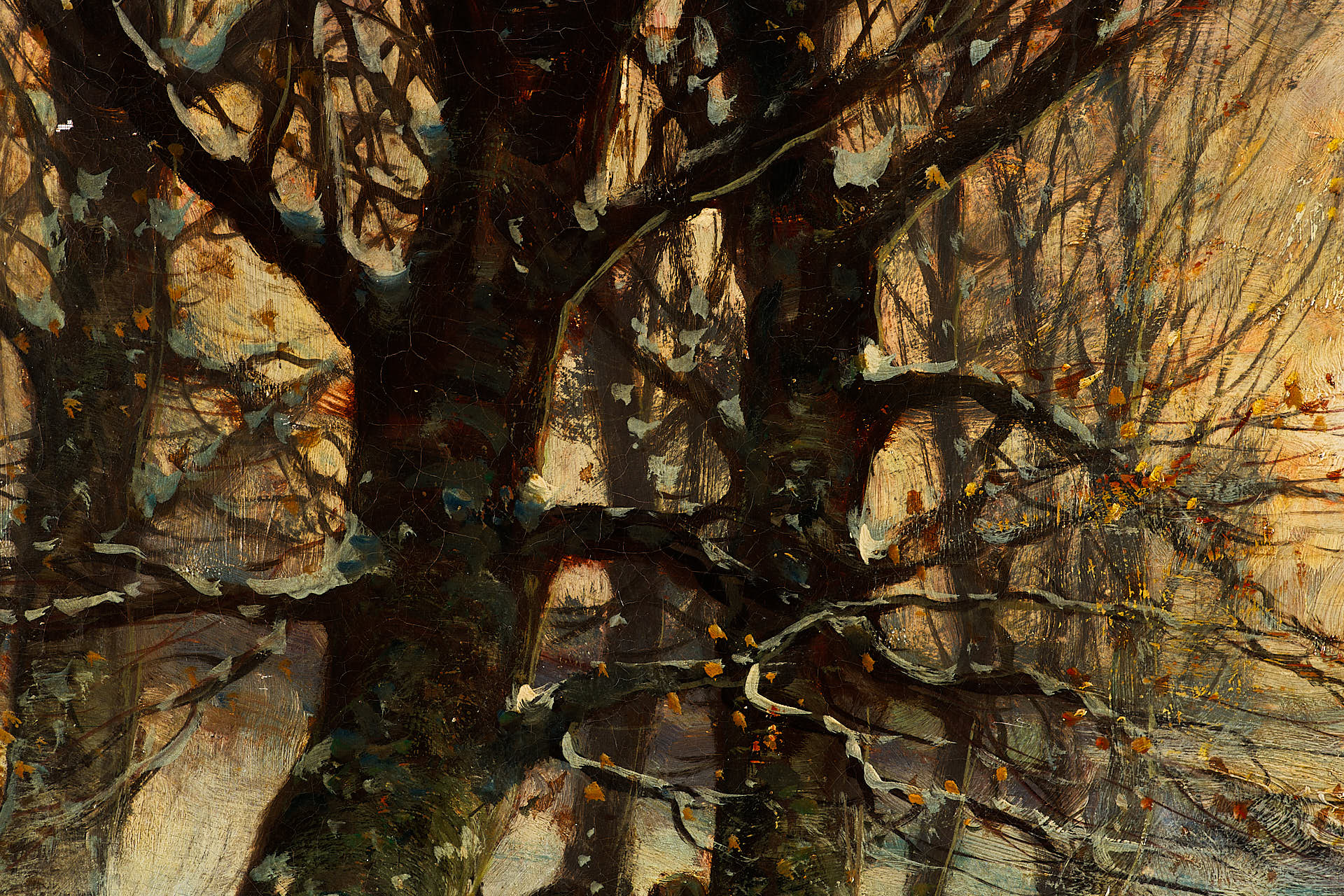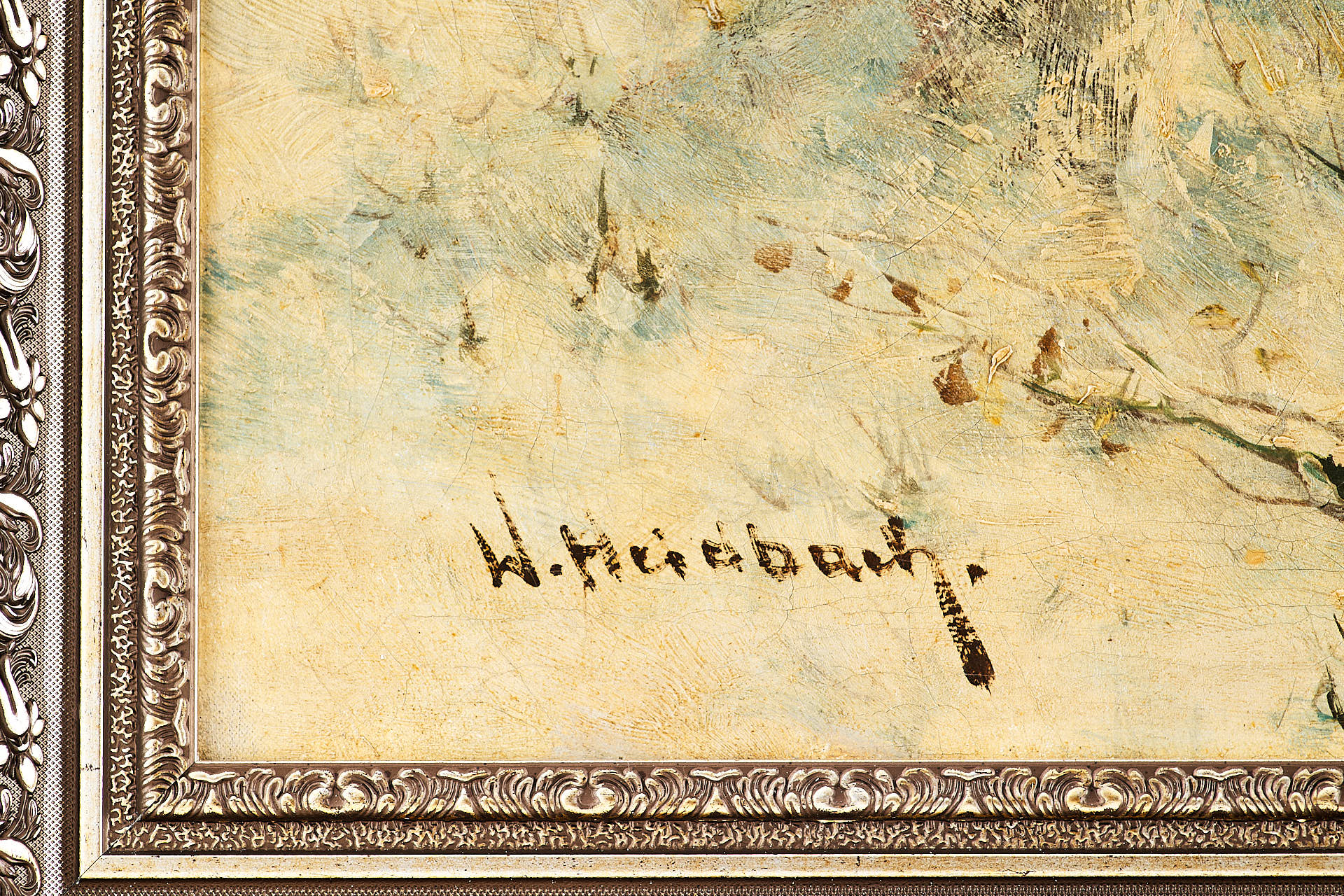 Таким образом, можно заключить, что изображена постановочная композиция охотничьего жанра. Слева внизу подпись: “W. Heidbach." Приемы изображения и красочная палитра произведения соотносятся с художественной практикой европейской живописи того времени. Подобные сцены были популярны в конце XIX - начале XX вв. (и позднее) среди немецко-австрийских художников, среди которых было много художников-анималистов посвятивших себя изображению охотничьих сцен.