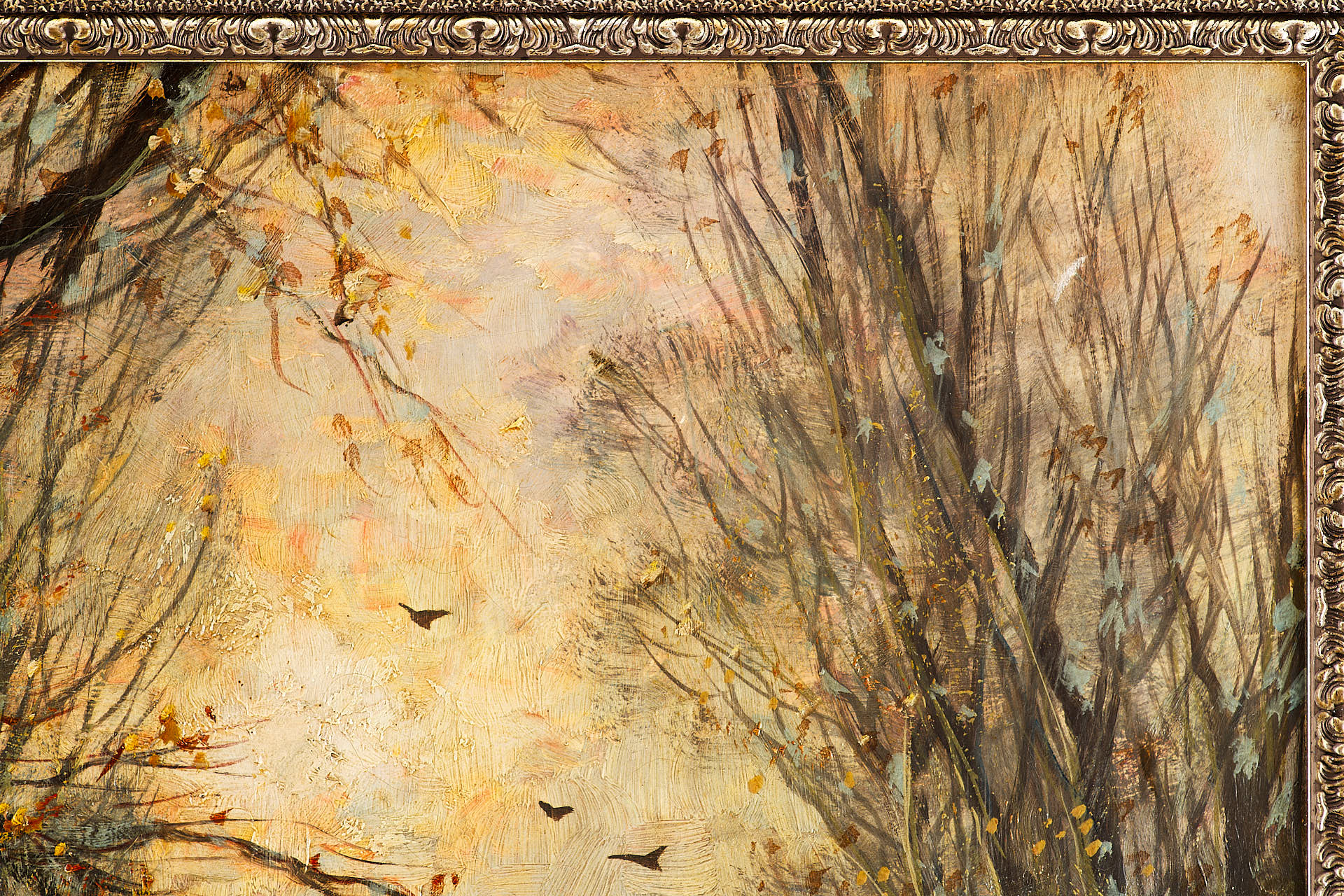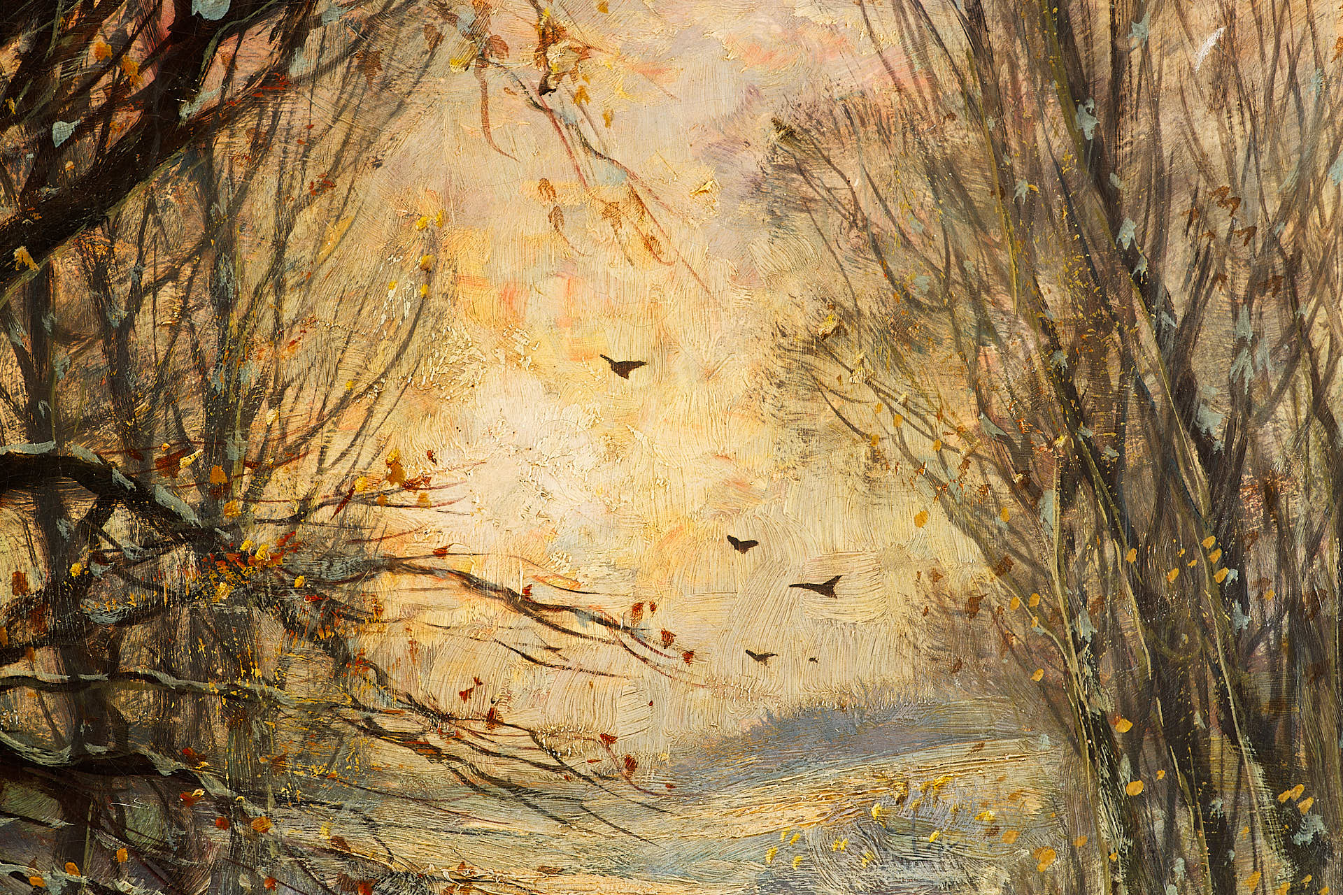 На картине изображено несколько диких вепрей (кабанов) идущих у лесной тропы. Вдали над горной грядой желтеют отблески