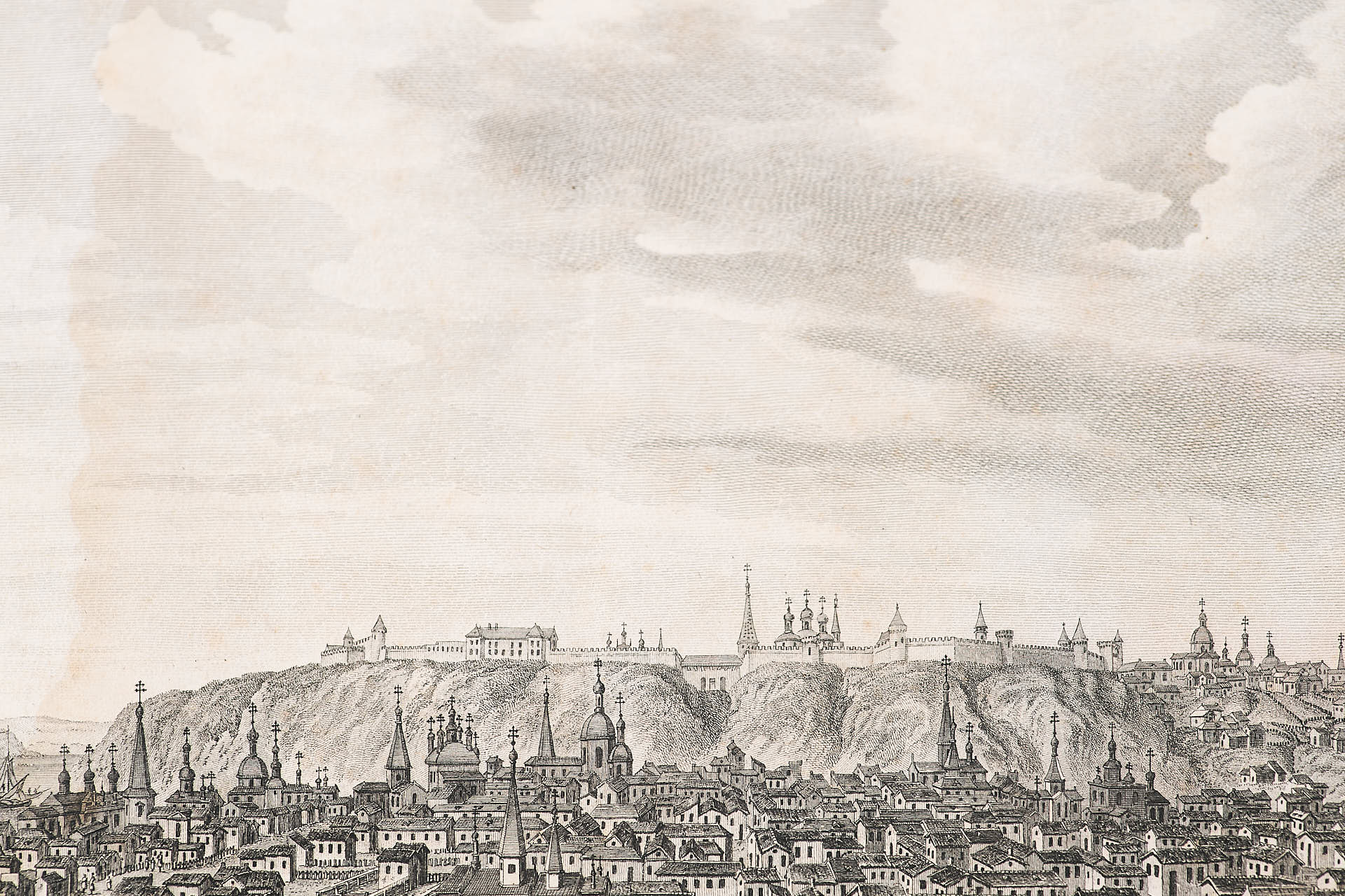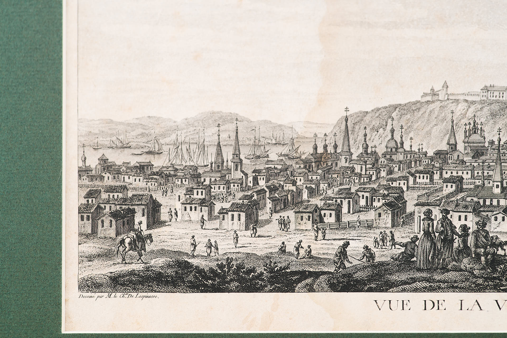 Вид Тобольска. По рисунку г. Ш. де Леспинасе. Гравировал Овре, под руководством Ф.-Д.Нее. Лист из атласа к изданию Н.Г.Леклерка «Физическая,моральная, гражданская и политическая история современной России» (1786).Гравюра на меди (офорт, резец). В паспарту. Гравюра выполнена по оригиналу французского художника Шарля де Леспинаса гравером Овре под руководством известного французского мастера Франсуа-Дени Нее (1732-1817) для альбома к популярному в XVIII веке