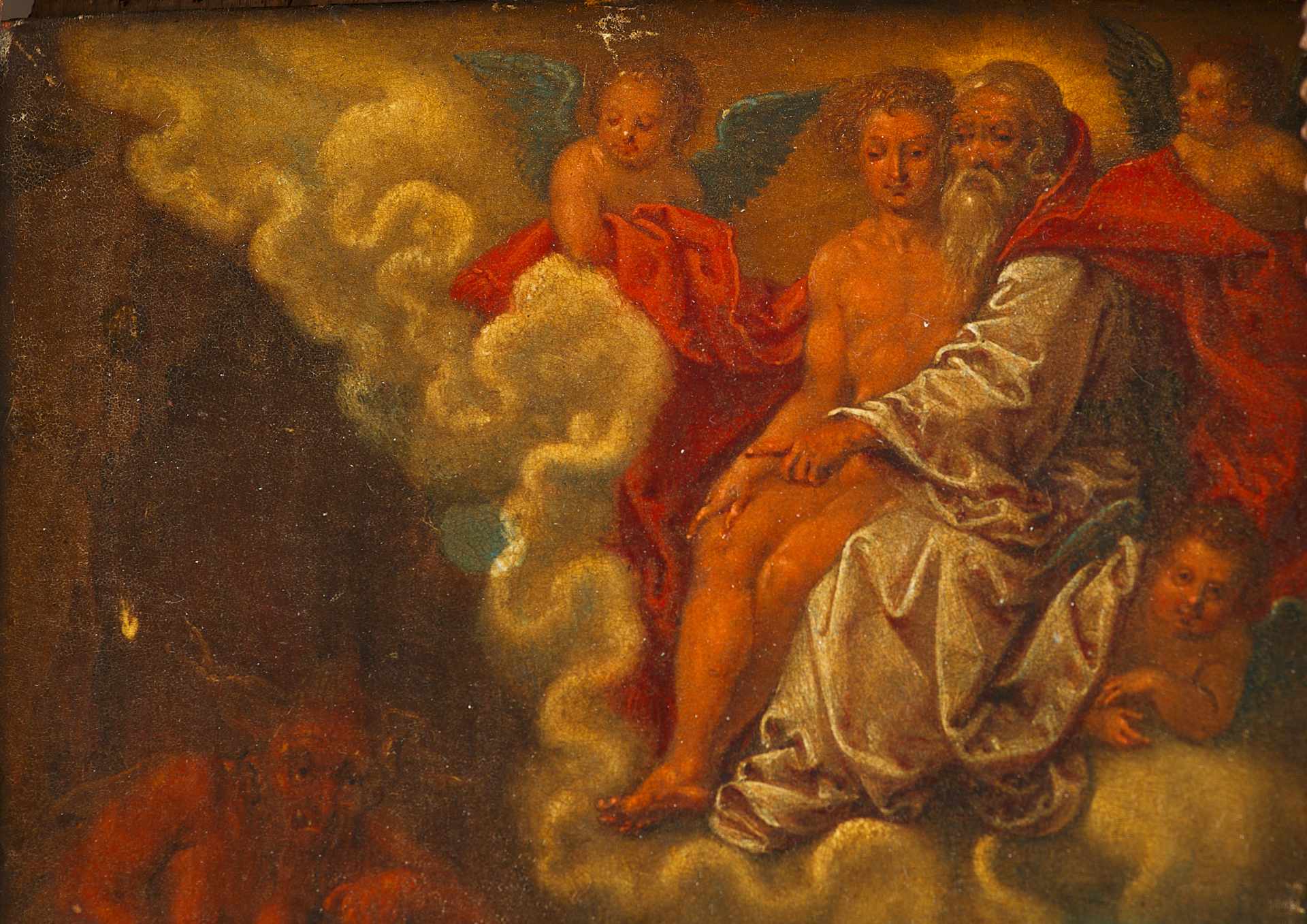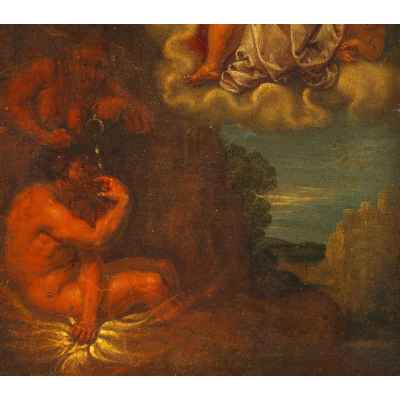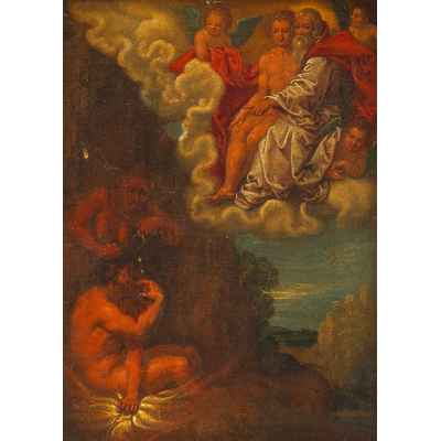 Картина представляет собой выразительное воплощение известного евангельского сюжета — притчи о богаче и бедном Лазаре из Евангелия от Луки. Художник искусно разделил композицию на два контрастных мира, отражая яркое противопоставление небесного блаженства и мучений ада. В верхней части работы на облаке изображены Авраам и Лазарь в окружении ангелов, их позы и жесты выдержаны в классической традиции фламандского барокко первой половины XVII века с его характерным эмоциональным накалом, драматизмом и динамичным контрастом света и тени. В нижней левой части изображён страдающий богач, над которым возвышается фигура демона, подчёркивая безысходность его мук. Его жест мольбы о капле воды отсылает зрителя непосредственно к библейскому тексту.