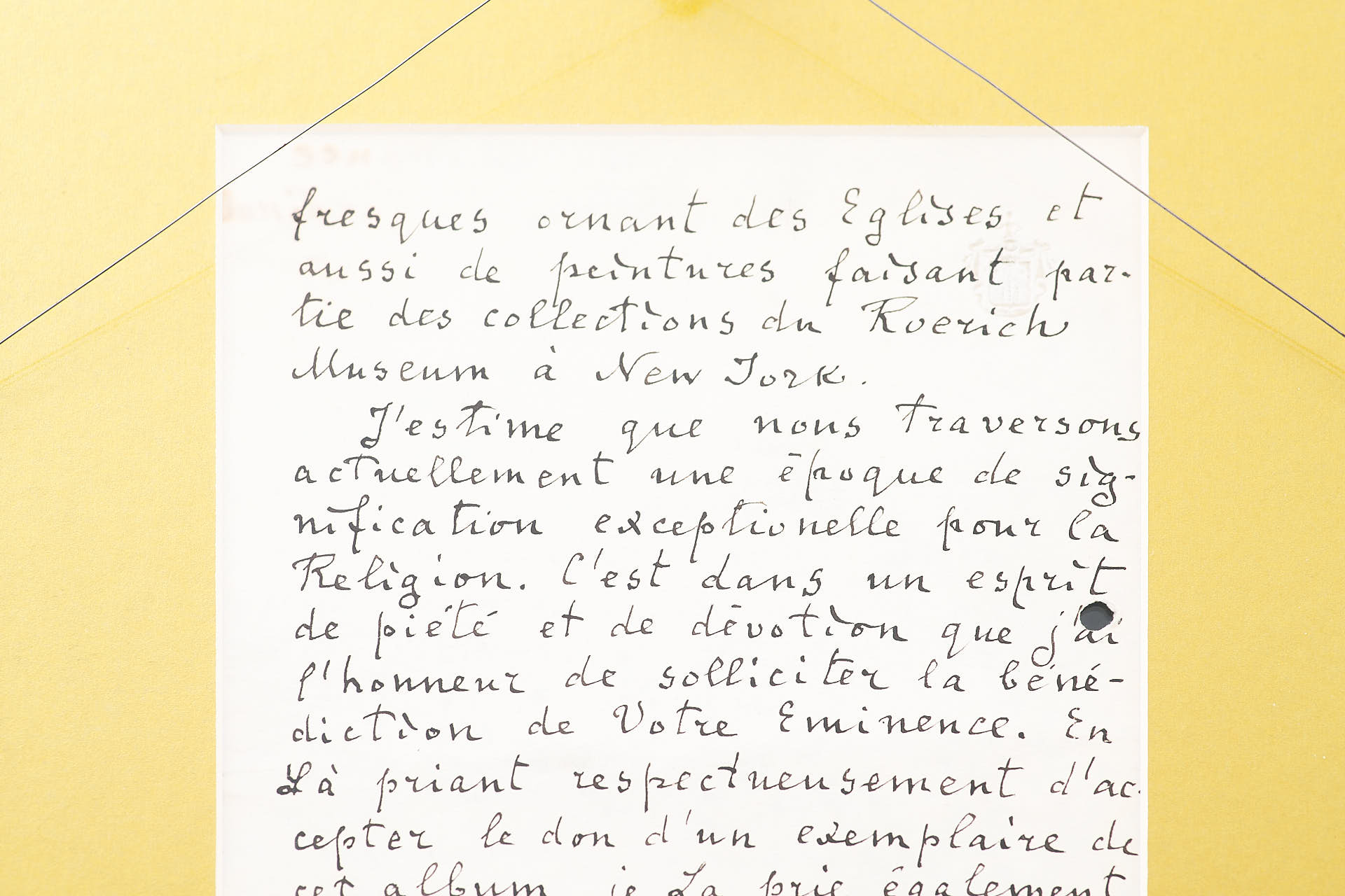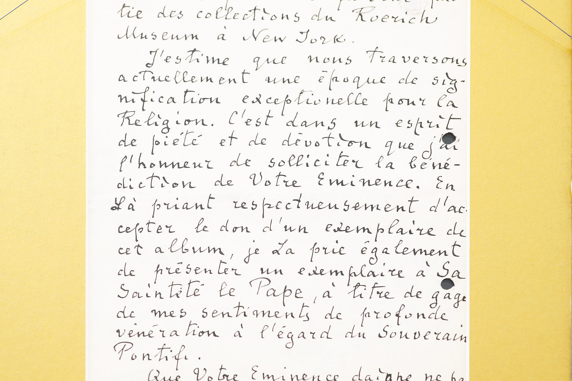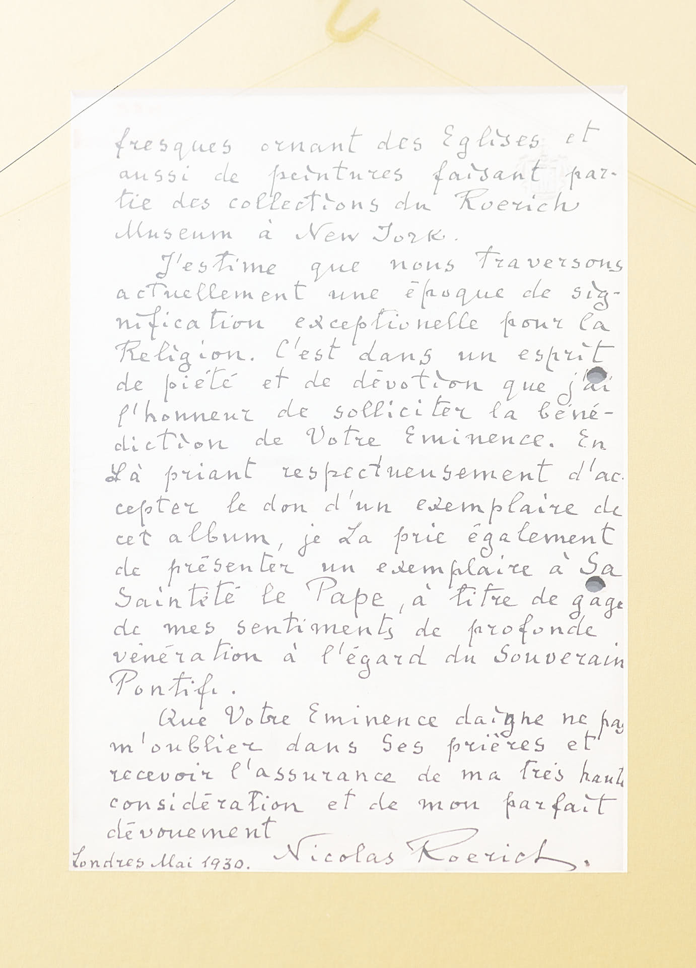 Его Высокопреосвященству Преподобнейшему Кардиналу Государственному секретарю Его Святейшества. Ваше Высокопреосвященство,На протяжении сорока лет моей художественной деятельности мне не раз выпадала честь украшать храмы и воспроизводить изображения Господа Иисуса Христа, Святой Девы. Святого Петра и различных святых. Я всегда стремился выражать в этих работах свою глубокую преданность и благоговение. В силу сложившихся обстоятельств я не мог включить в настоящий альбом репродукции моих религиозных произведений. Тем не менее. Ваше Высокопреосвященство найдет на его страницах ряд мозаик, церкви, а также картины в коллекцию Музея Рериха в Нью-Йорке.