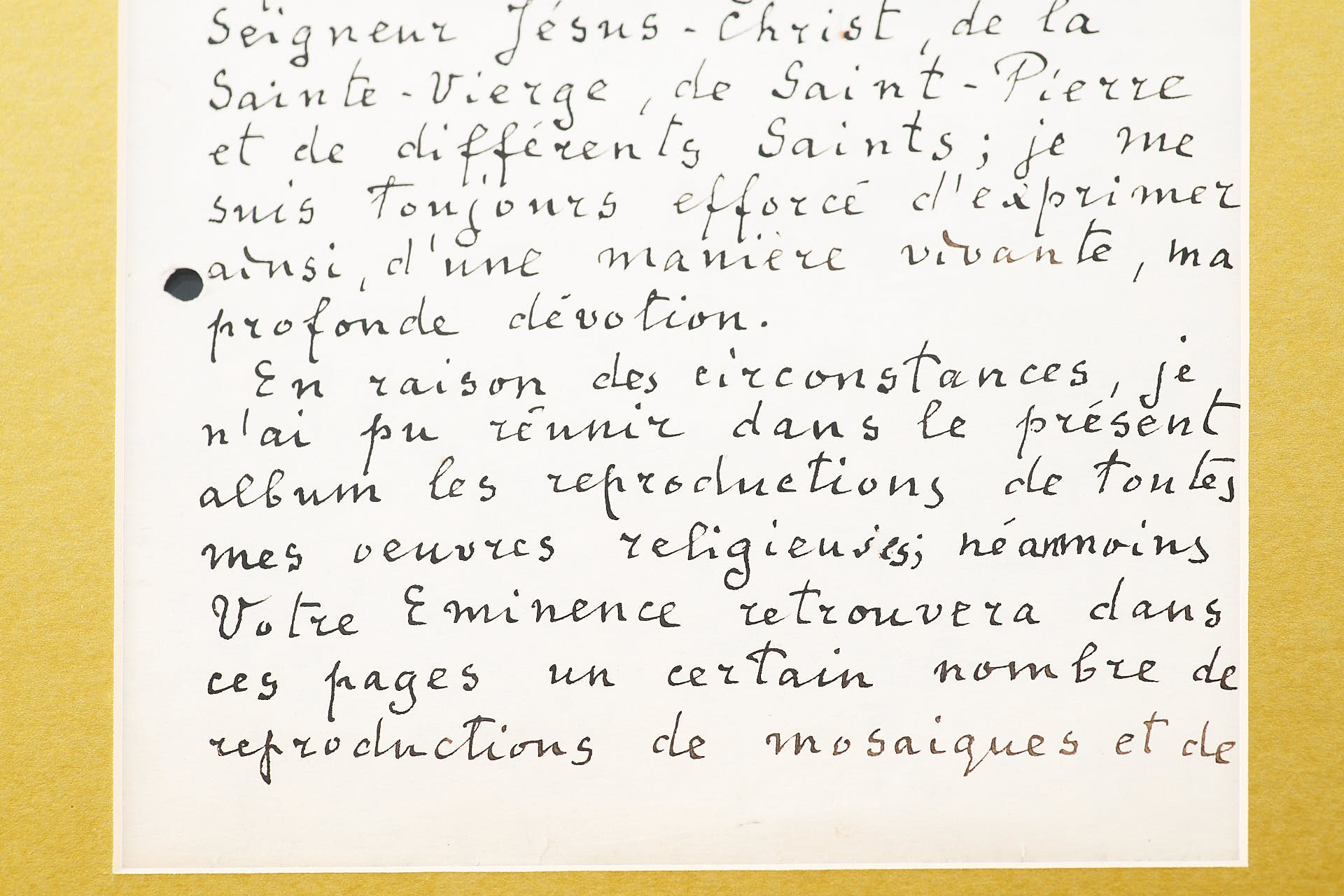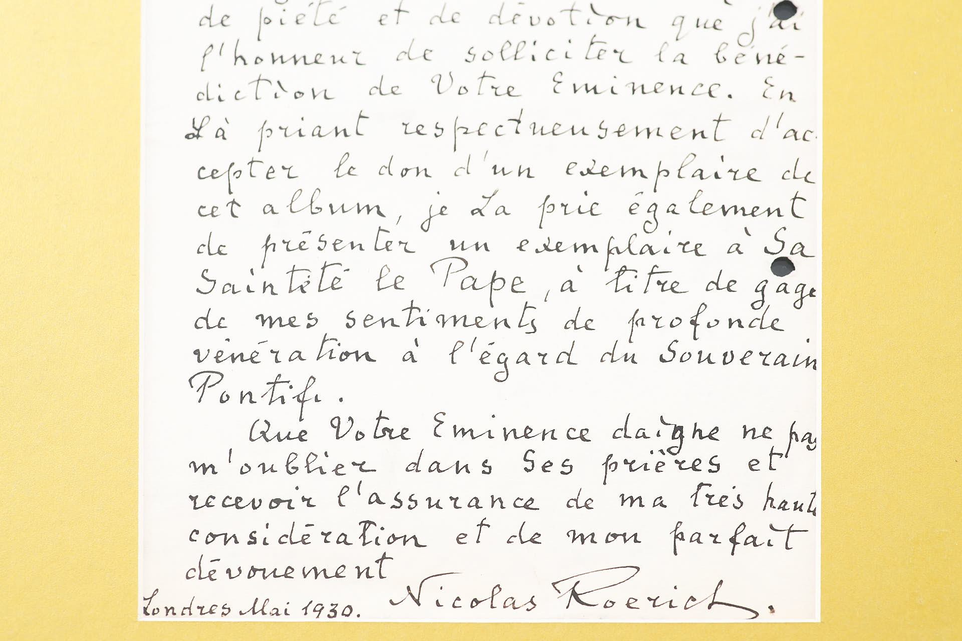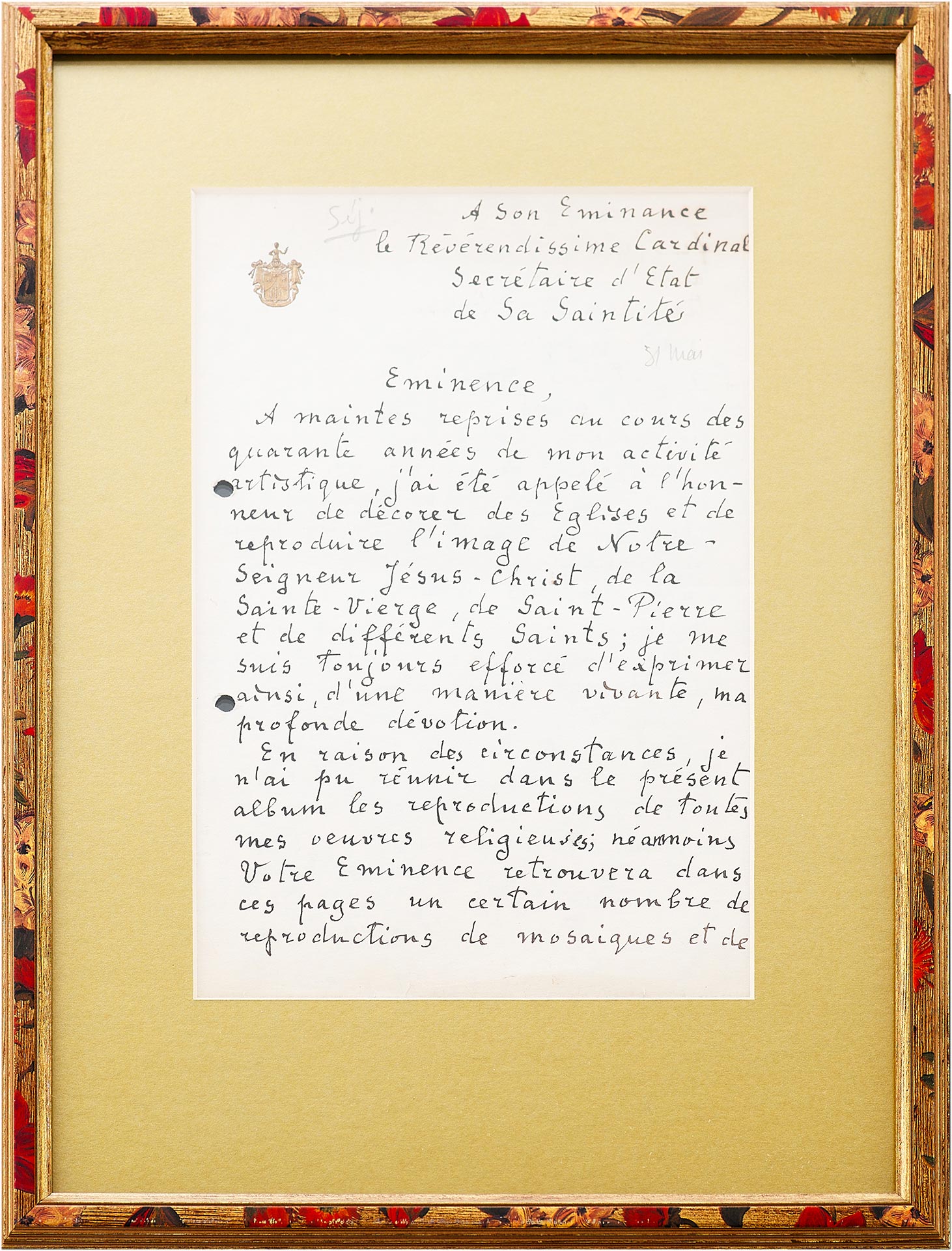 Его Высокопреосвященству Преподобнейшему Кардиналу Государственному секретарю Его Святейшества. Ваше Высокопреосвященство,На протяжении сорока лет моей художественной деятельности мне не раз выпадала честь украшать храмы и воспроизводить изображения Господа Иисуса Христа, Святой Девы. Святого Петра и различных святых. Я всегда стремился выражать в этих работах свою глубокую преданность и благоговение. В силу сложившихся обстоятельств я не мог включить в настоящий альбом репродукции моих религиозных произведений. Тем не менее. Ваше Высокопреосвященство найдет на его страницах ряд мозаик, церкви, а также картины в коллекцию Музея Рериха в Нью-Йорке.